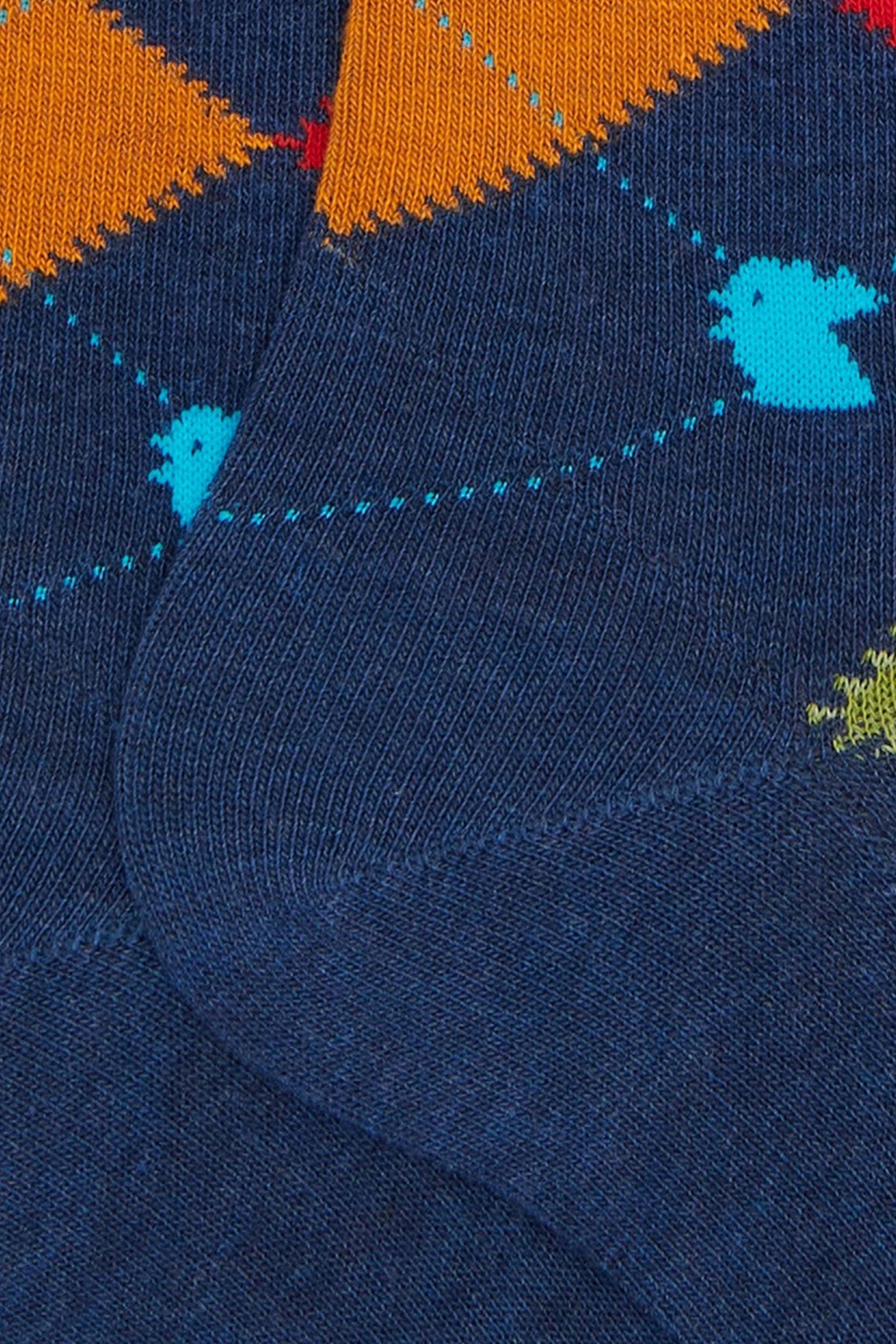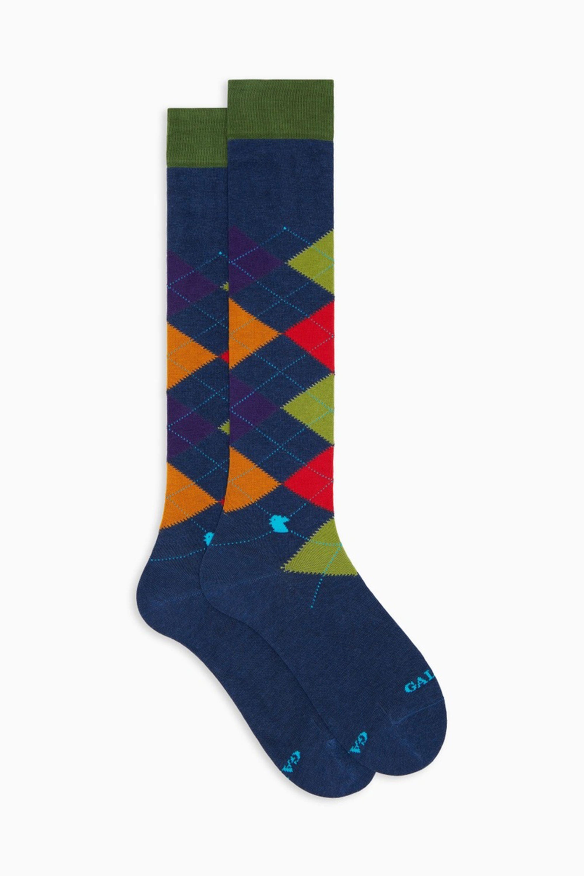 Calze lunghe da uomo realizzate in Italia con un blend perfetto di cotone. Molto morbide al tatto, create per una persona dinamica che non rinuncia ad un dettaglio di stile. L'iconica fantasia a intarsio nei toni del blu le rende originali ma riconoscibili. Adatte ad un look formale o casual.