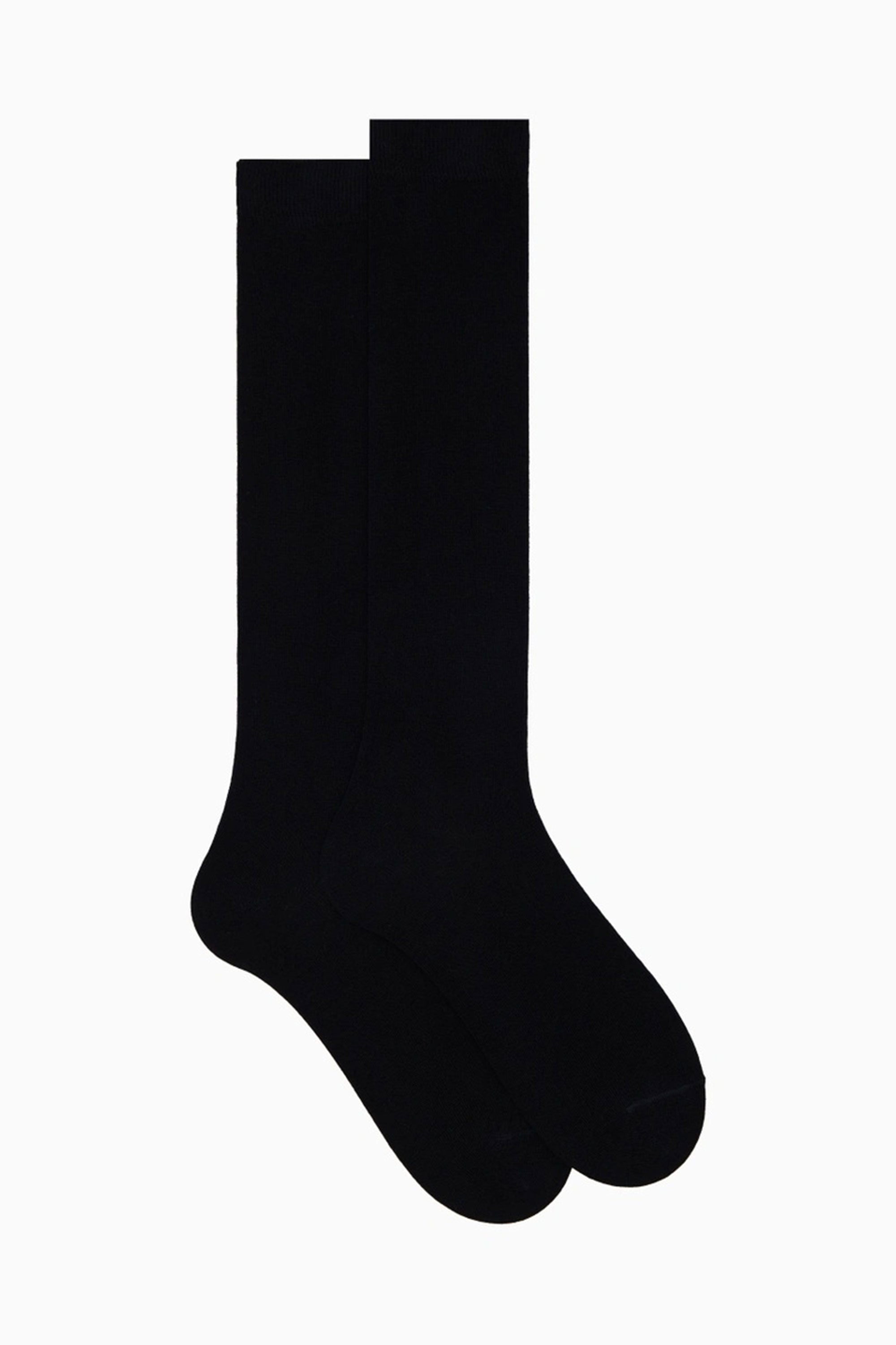 Calze lunghe da uomo in cotone, realizzate in Italia. Molto morbide al tatto, create per una persona dinamica che non rinuncia ad un dettaglio di stile. Tinta unita nere. Adatte ad un look casual o elegante. Per essere impeccabili in ogni occasione.