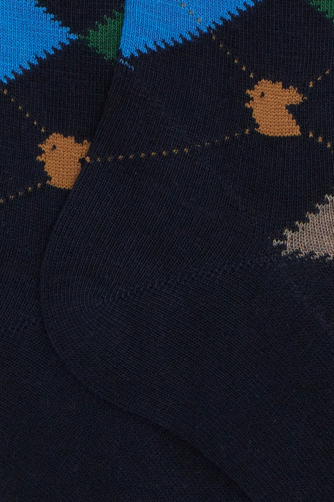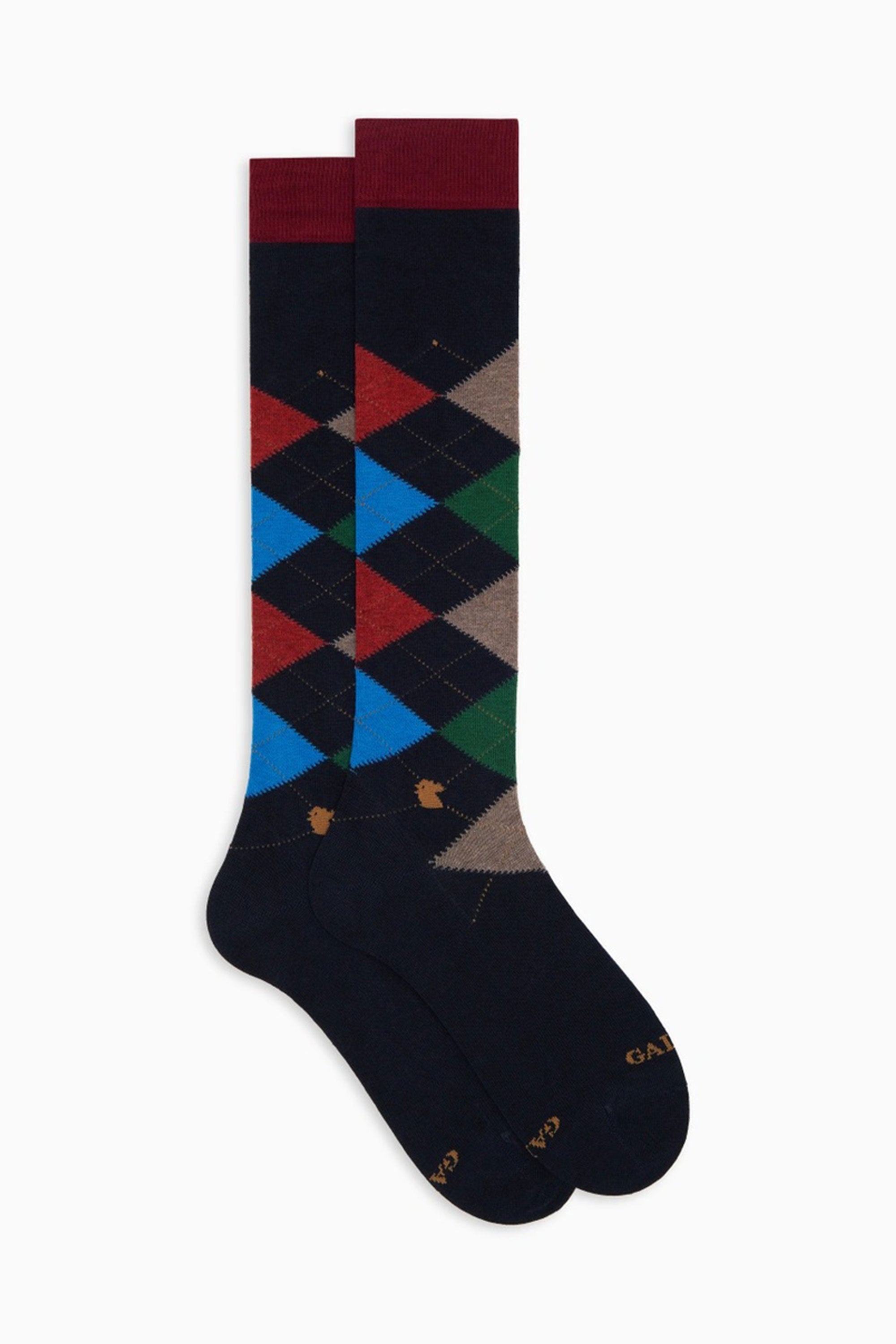 Calze lunghe da uomo realizzate in Italia con un blend perfetto di cotone. Molto morbide al tatto, create per una persona dinamica che non rinuncia ad un dettaglio di stile. L'iconica fantasia a intarsio nei toni del blu le rende originali ma riconoscibili. Adatte ad un look formale o casual.