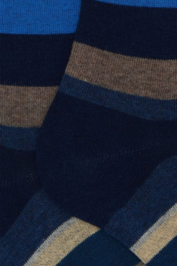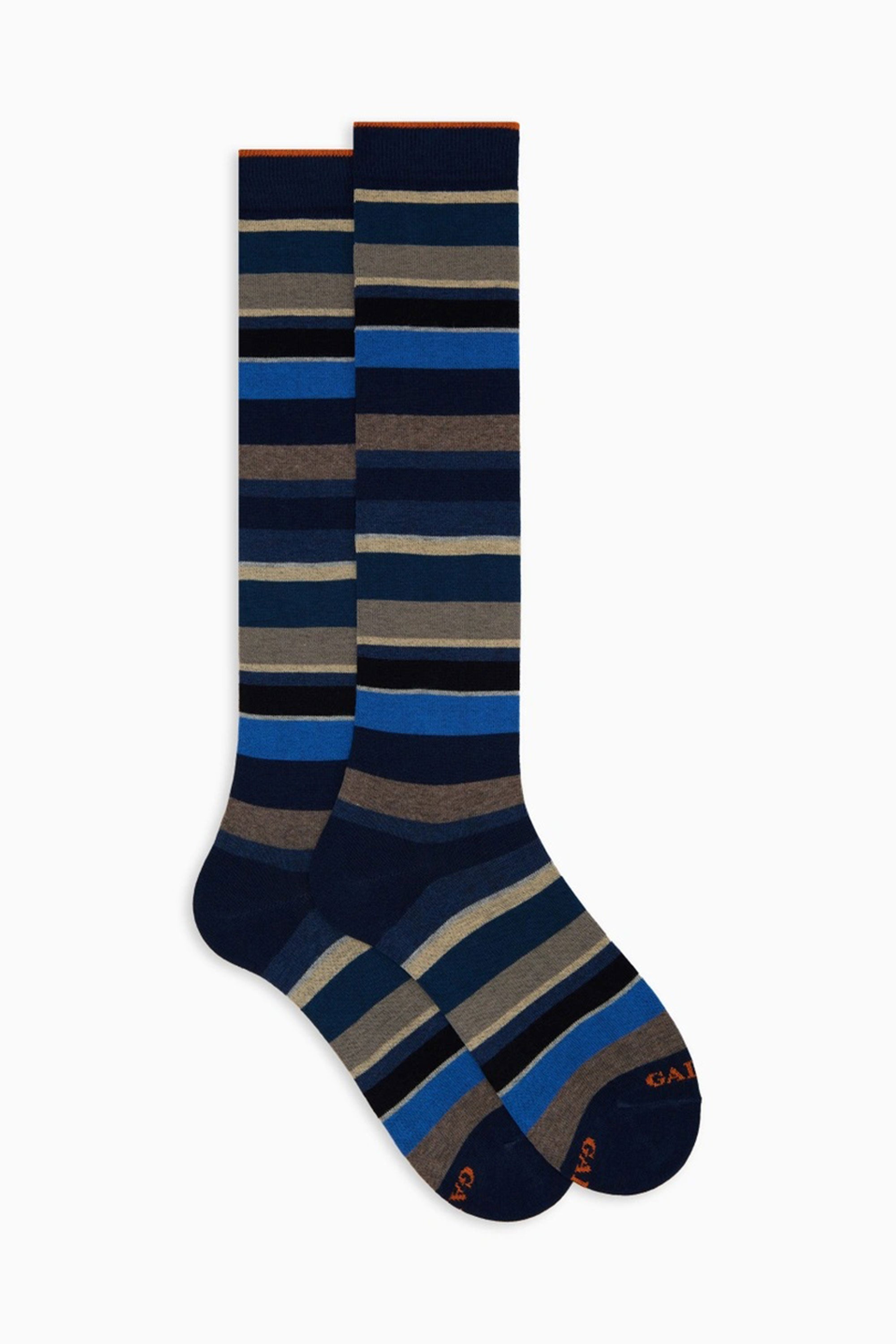 Calze lunghe da uomo realizzate in Italia in cotone elasticizzato, morbidissime al tatto e create per adattarsi perfettamente ad ogni tipo di look. L'iconica fantasia a righe multicolor sui toni del blu rende queste calze immediatamente riconoscibili. Il brand Gallo è ricamato in punta a contrasto.