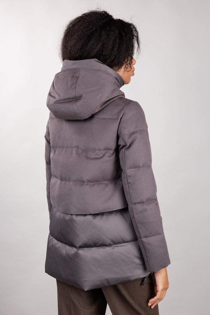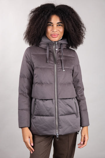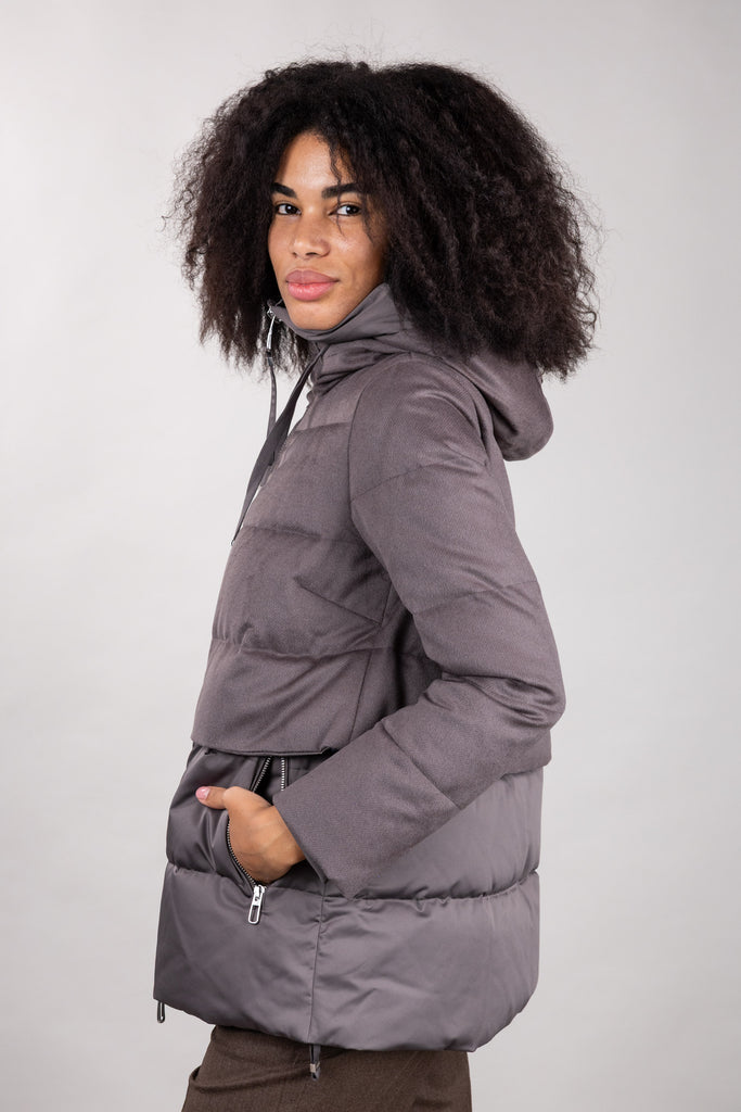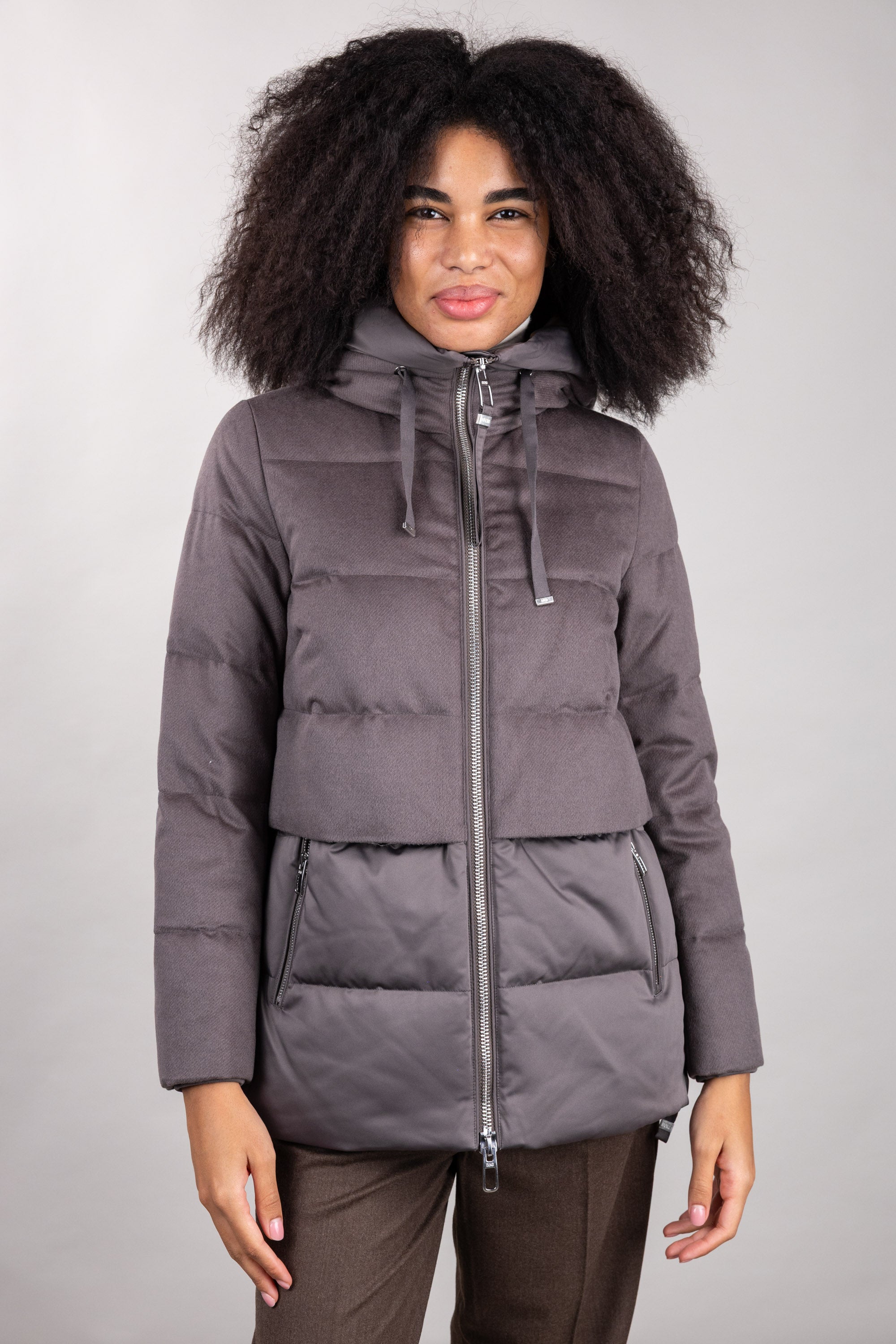 Piumino corto bimateriale realizzato in lana tecnica trapuntata e raso. Il capo presenta un ampio cappuccio imbottito regolabile con coulisse, chiusura frontale con zip in metallo a doppio cursore e tasche laterali con chiusura a zip. Coulisse al fondo per regolare la vestibilità e polsino interno in maglia tecnica.