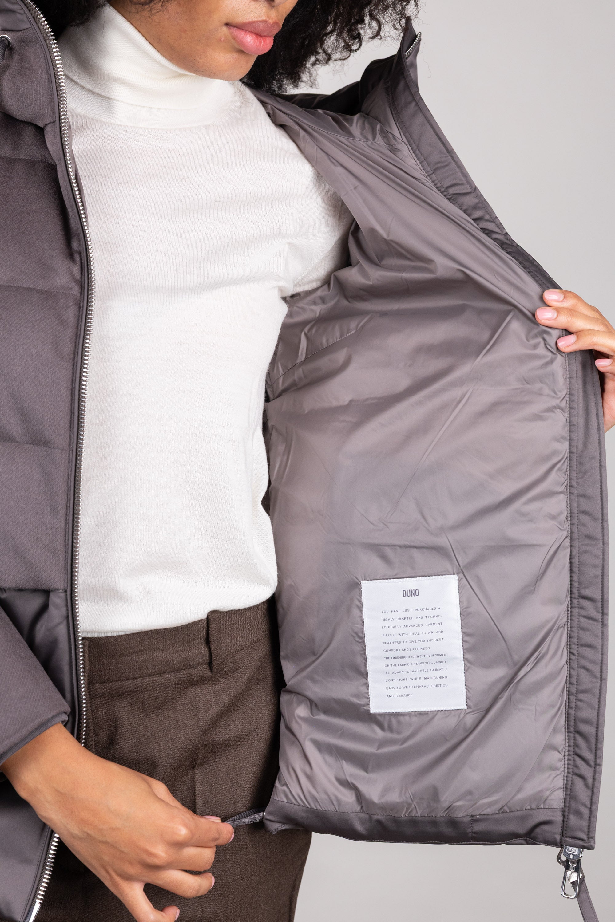 Lana tecnica leggera con una trama leggermente diagonale, caratterizzata da una texture morbida, un aspetto pulito in superficie e resistenza al pilling in combinazione con tessuto tecnico e raso resistente all'acqua. Grazie a una speciale lavorazione sul rovescio, l'imbottitura in piuma diretta conferisce estrema leggerezza e regola la termoregolazione del corpo, preservando il microclima all'interno del capo.