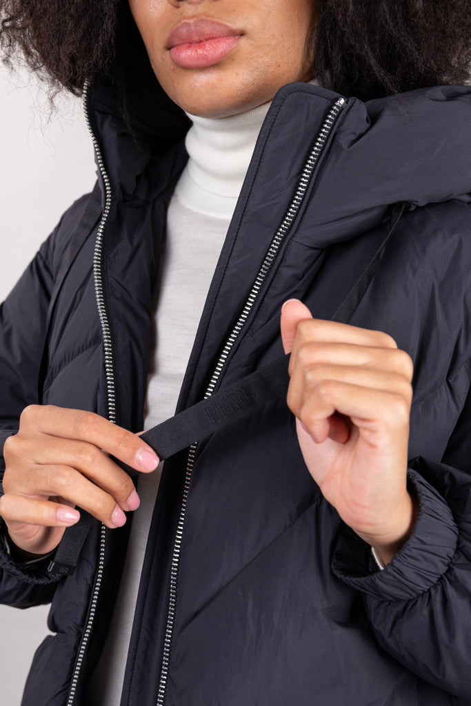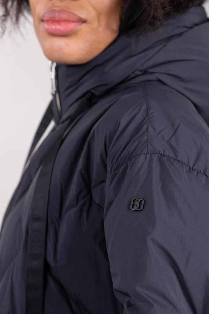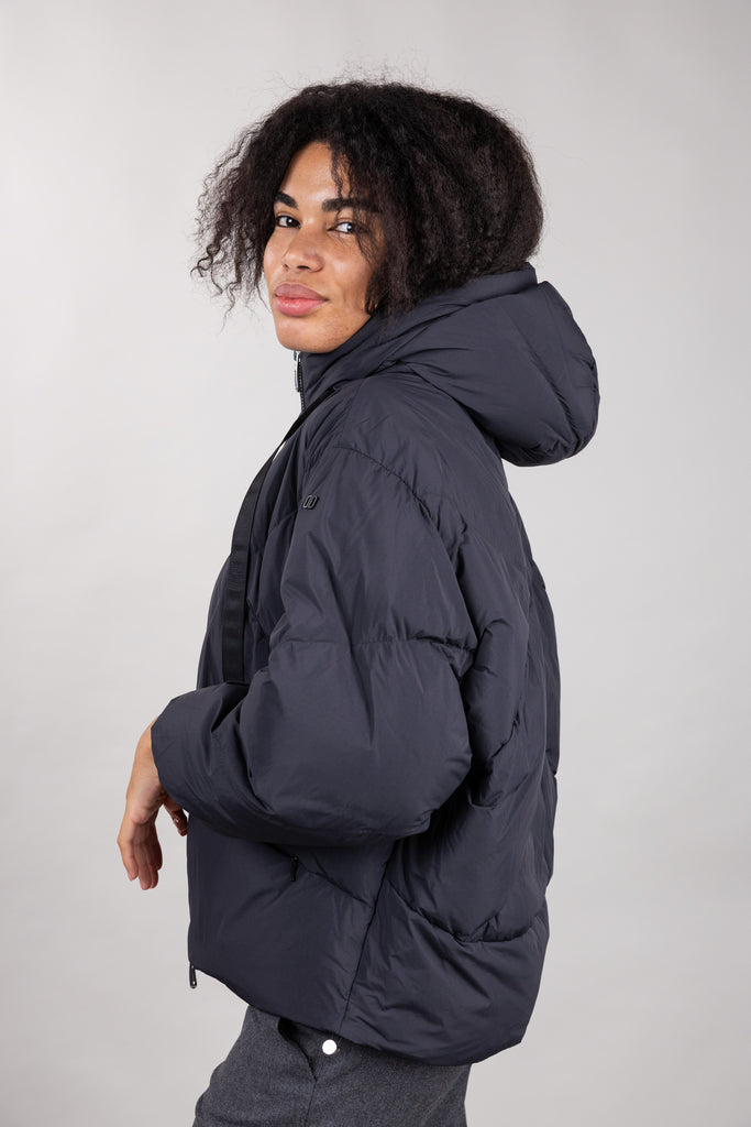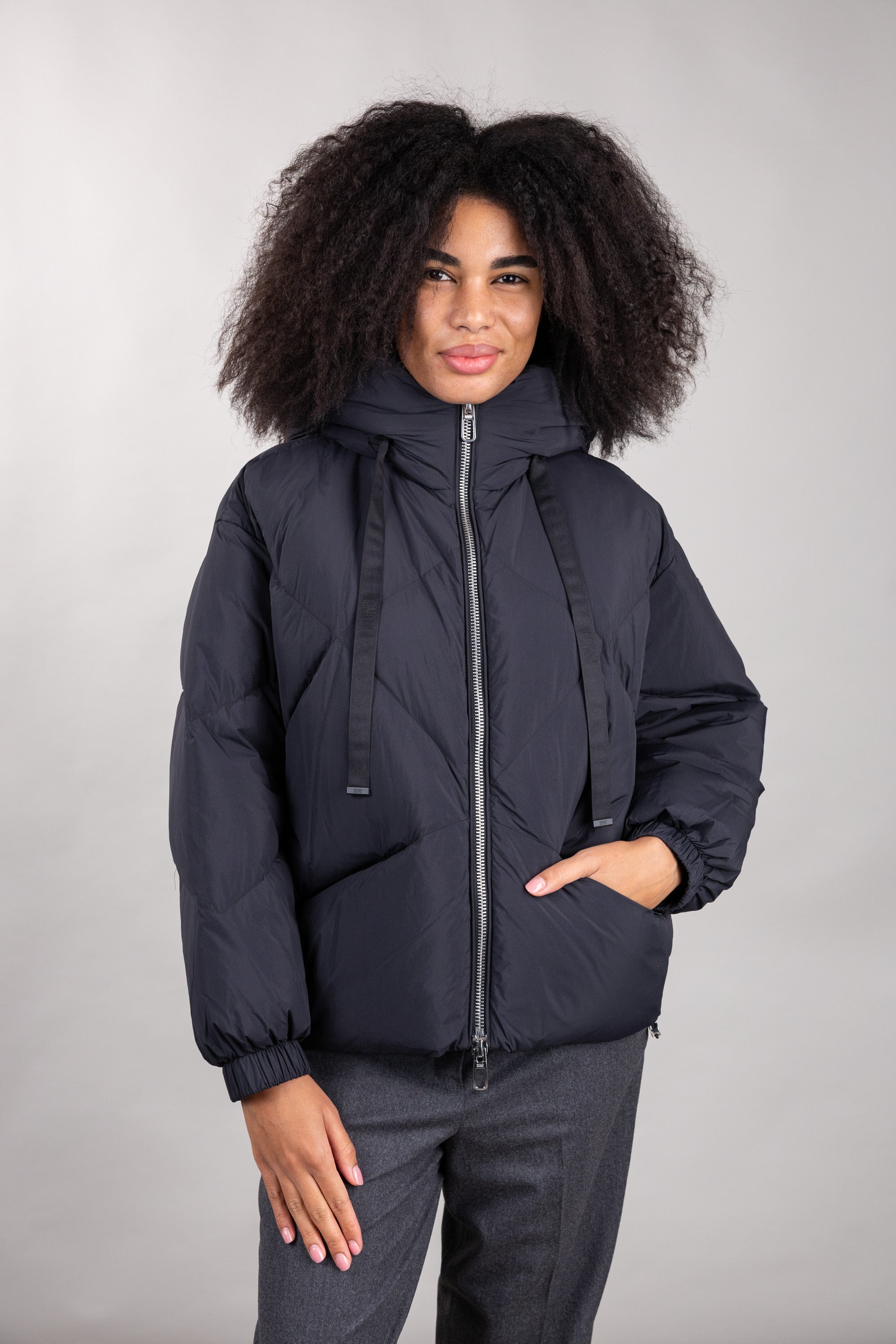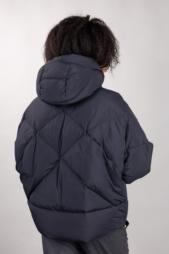 Piumino corto oversize con cappuccio, realizzato in microfibra di nylon con trapunte geometriche. Spalla scesa, chiusura frontale con zip metallica doppio cursore e tasche con zip invisibile inserita nel disegno della trapunta. Fondo manica con elastico nascosto nel