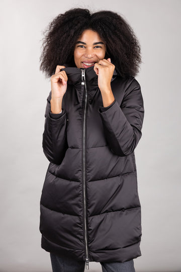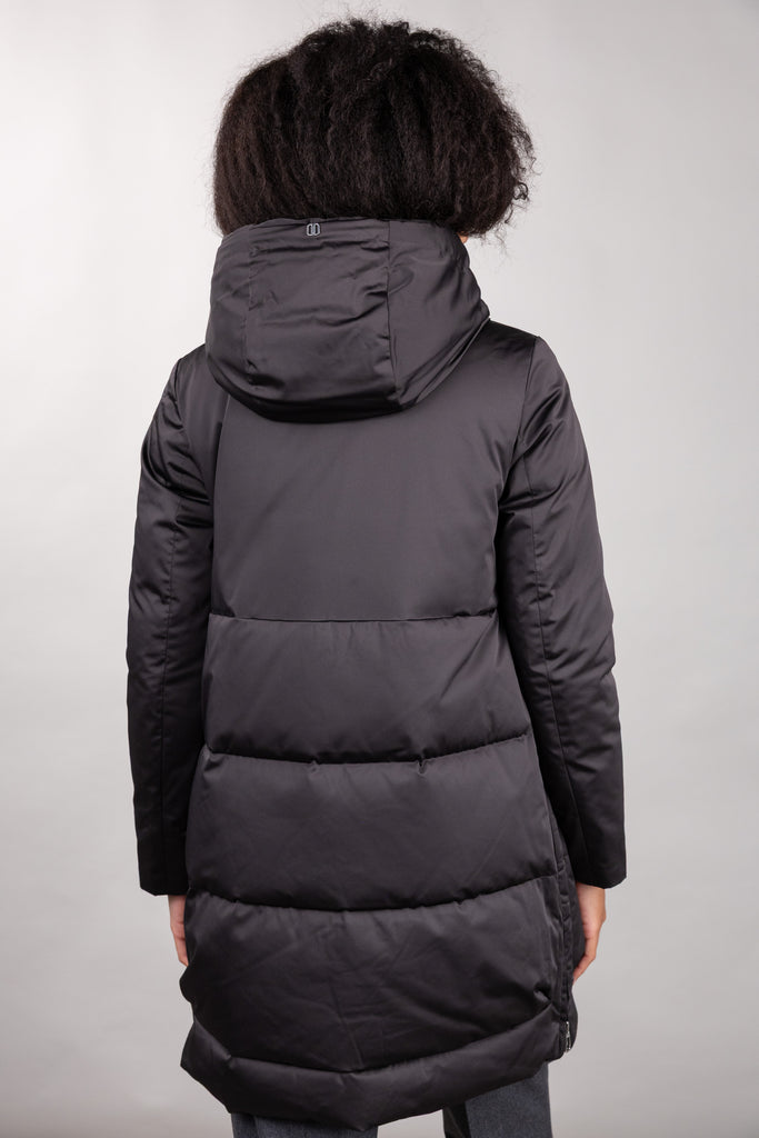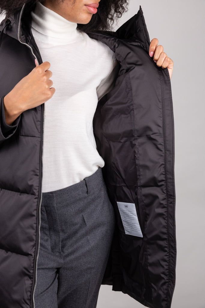 Tessuto tecnico water-resistant e comfort stretch, con struttura a raso dall’aspetto serico. L’imbottitura in piuma garantisce un elevato comfort termico e protezione dagli agenti atmosferici.