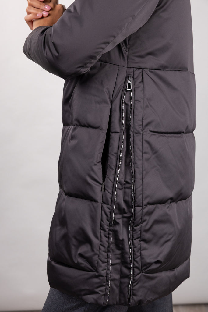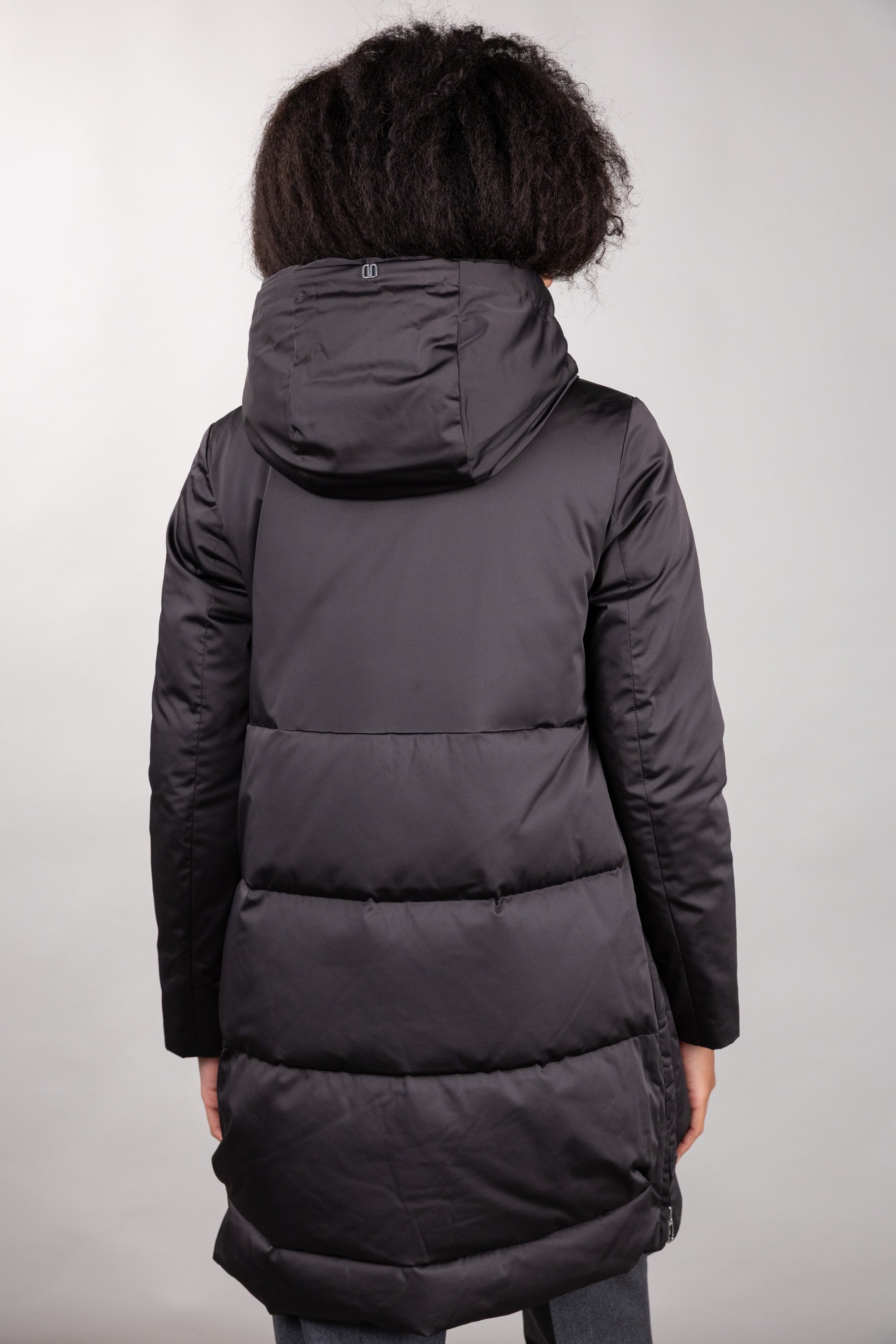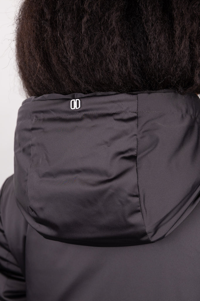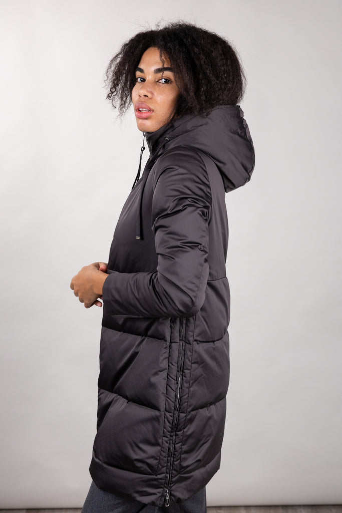 Piumino in raso tecnico caratterizzato da pannelli trapuntati nella parte bassa e da zip laterali con soffietto che permettono di regolare l’ampiezza del fondo. Ampio cappuccio con coulisse e chiusura frontale con zip metallica doppio cursore con dettaglio di tirazip. Tasche laterali con zip invisibile e polsino interno in maglia tecnica.