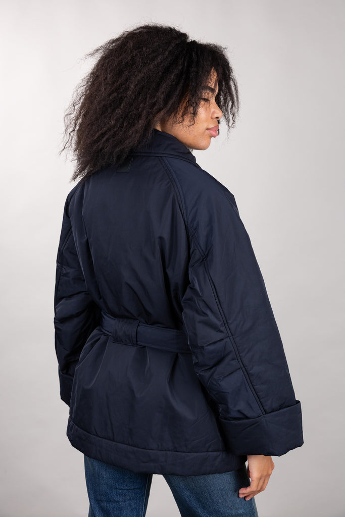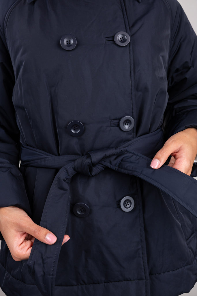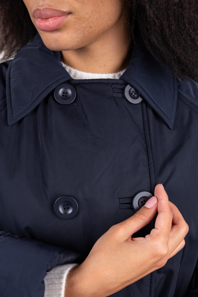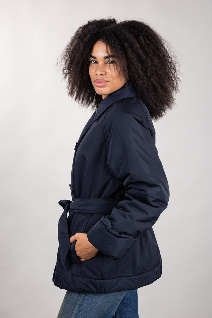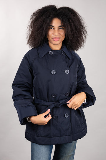 Giacca doppiopetto dal fit oversize, realizzata in nylon water repellent. Il design si distingue per il colletto strutturato e le maniche ampie dalle linee fluide, valorizzate da un taglio contemporaneo. La cintura in vita consente di modulare la silhouette, i bottoni a vista sul fronte completano lo stile con un dettaglio essenziale e deciso.