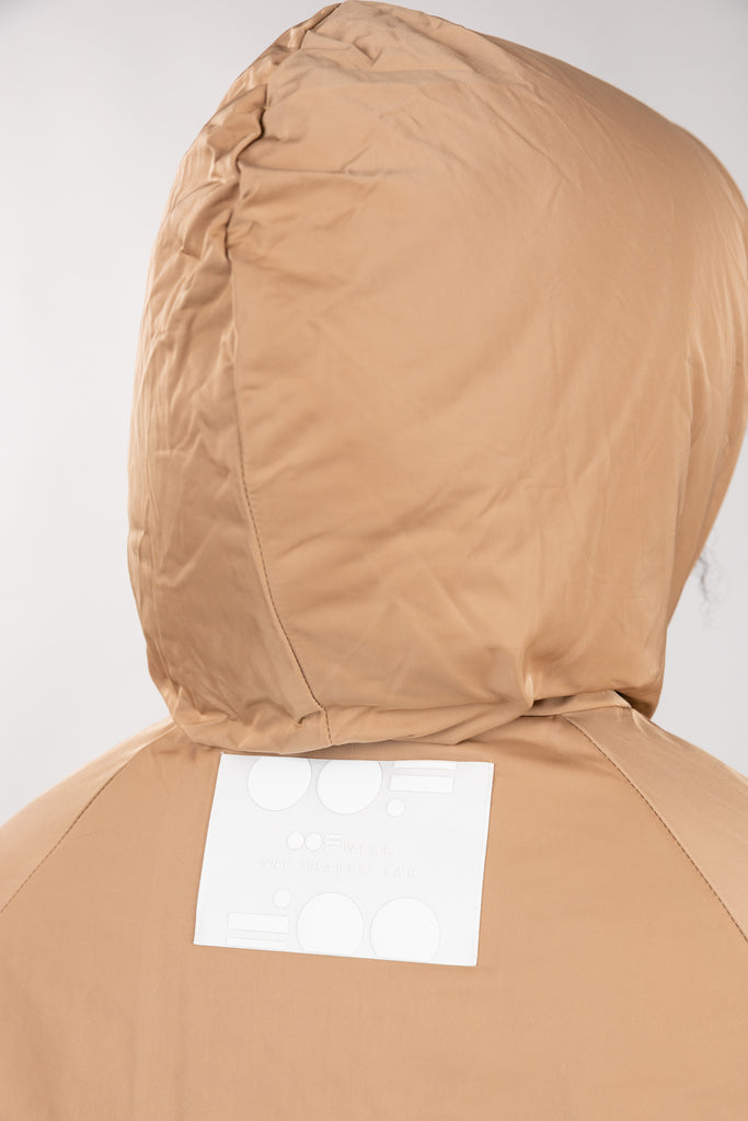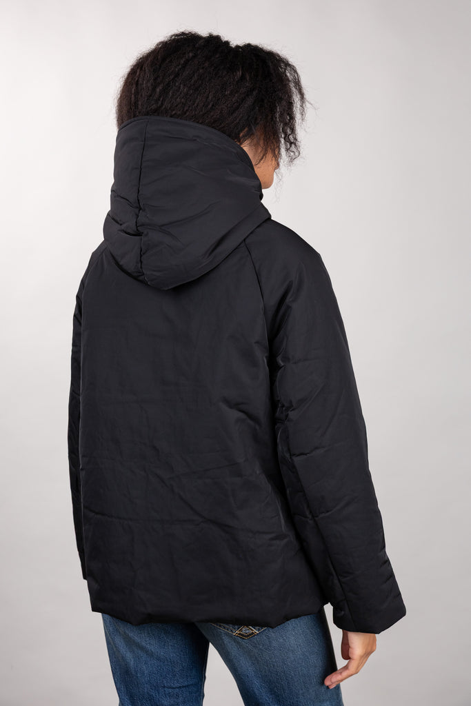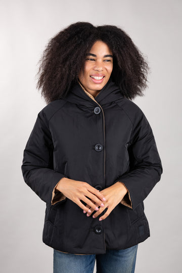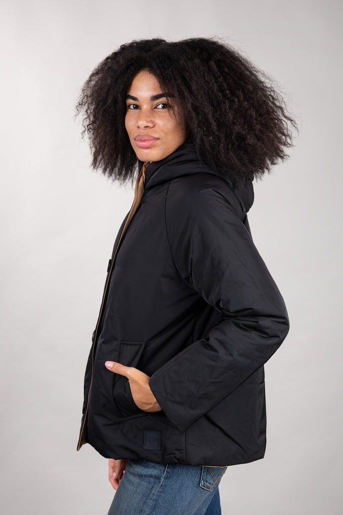 Giacca corta reversibile dal taglio regolare, realizzata in nylon memory water-repellent che assicura protezione e comfort in ogni contesto urbano. Il design essenziale è arricchito dallo scollo a scialle con cappuccio e dalle maniche raglan, che garantiscono libertà di movimento e una linea dinamica. Pratica e versatile, presenta tasche a toppa sul lato esterno e tasche inserite sul fianco sul lato interno.