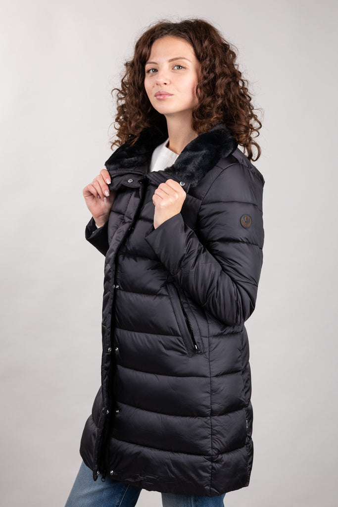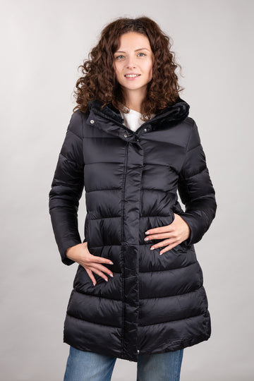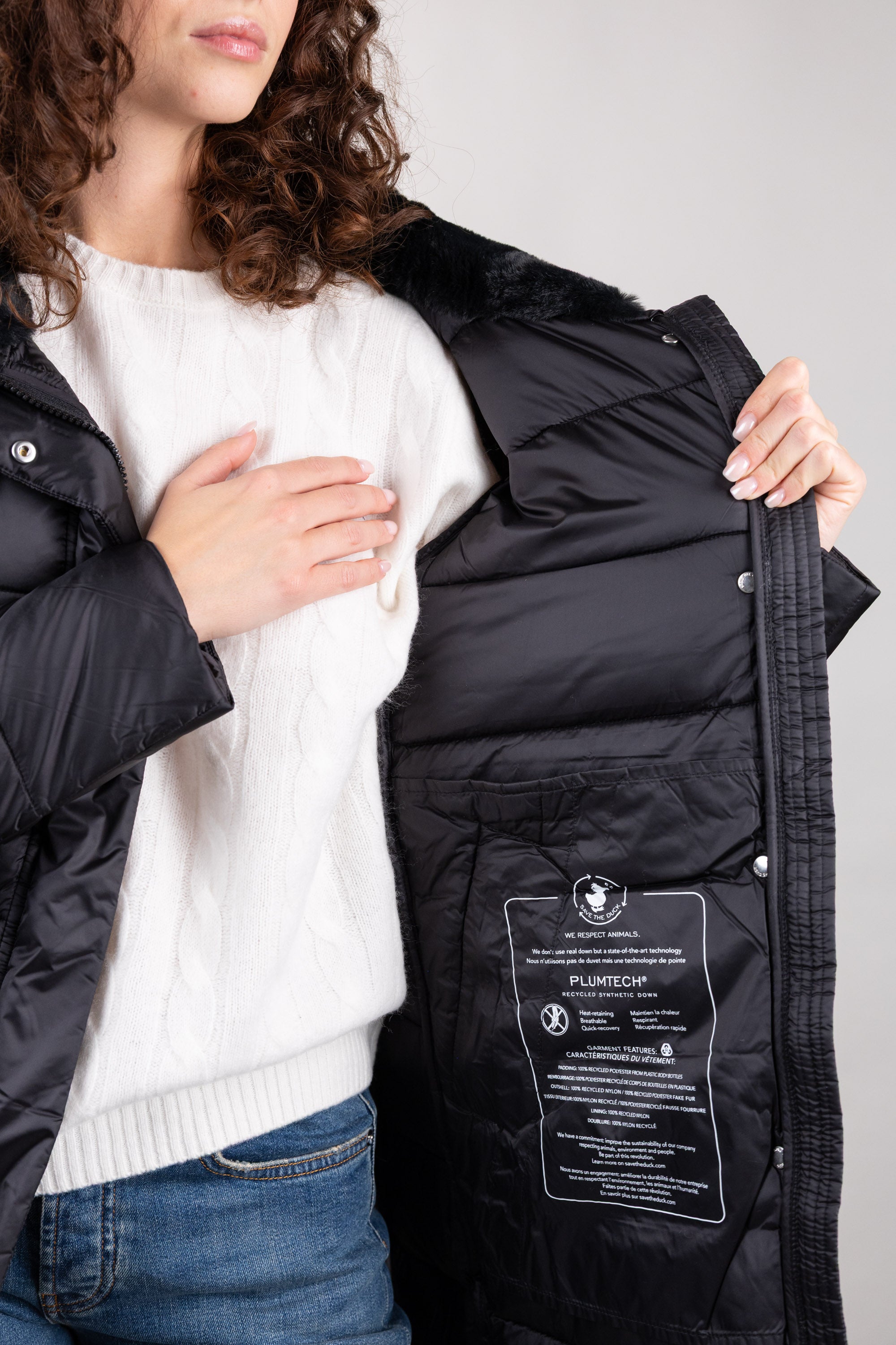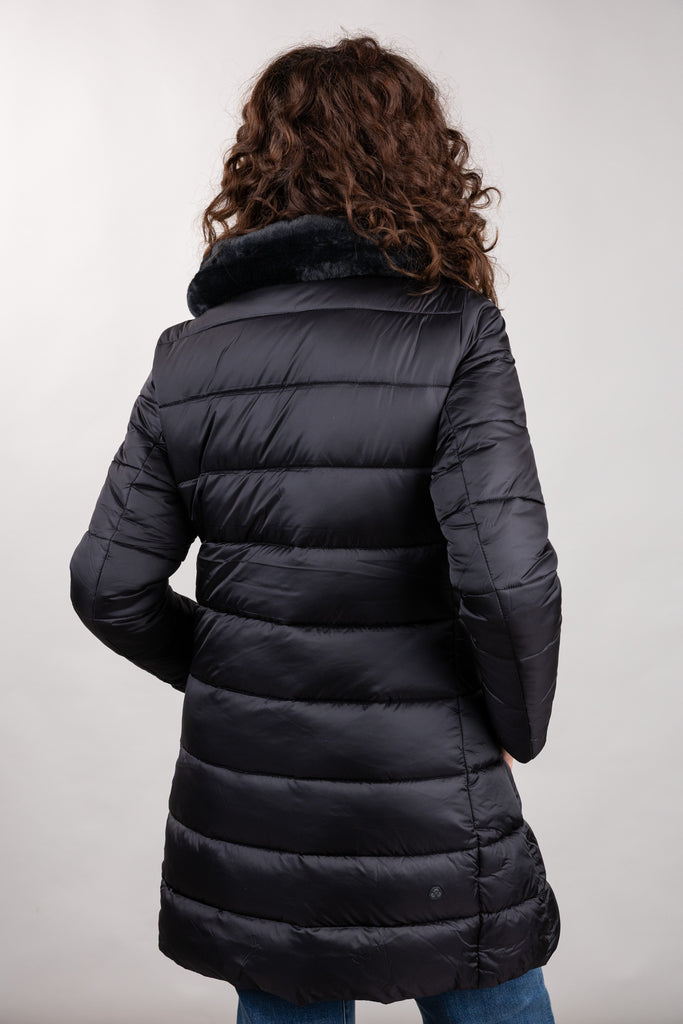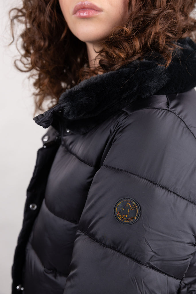 Il piumino Dalea si distingue per la linea ad A e il collo alto in pelliccia sintetica en pendant. Il modello trapuntato e imbottito si chiude con una zip a doppio cursore nascosta da una patta con bottoni per un look pulito e lineare. Il logo tono su tono completa la manica con un inconfondibile dettaglio Save The Duck.