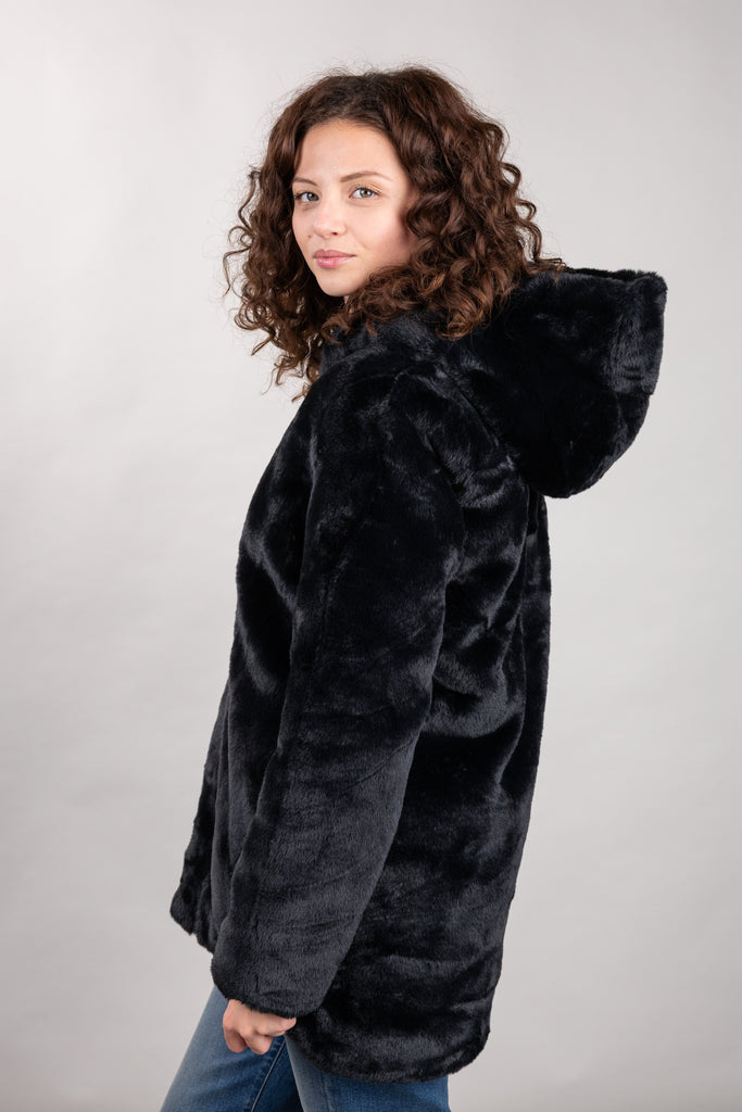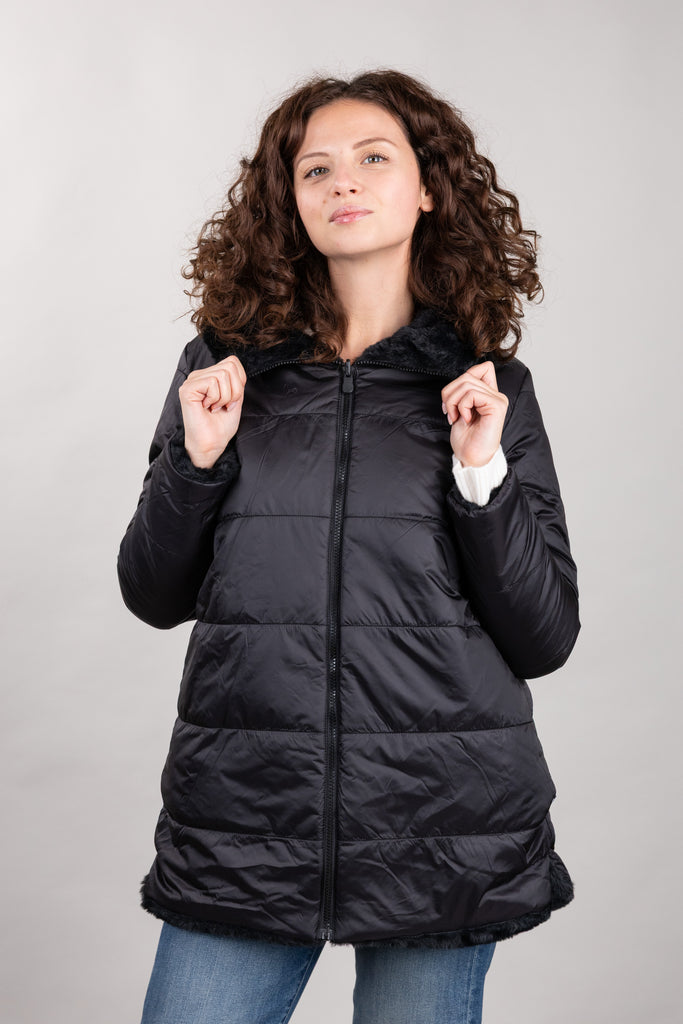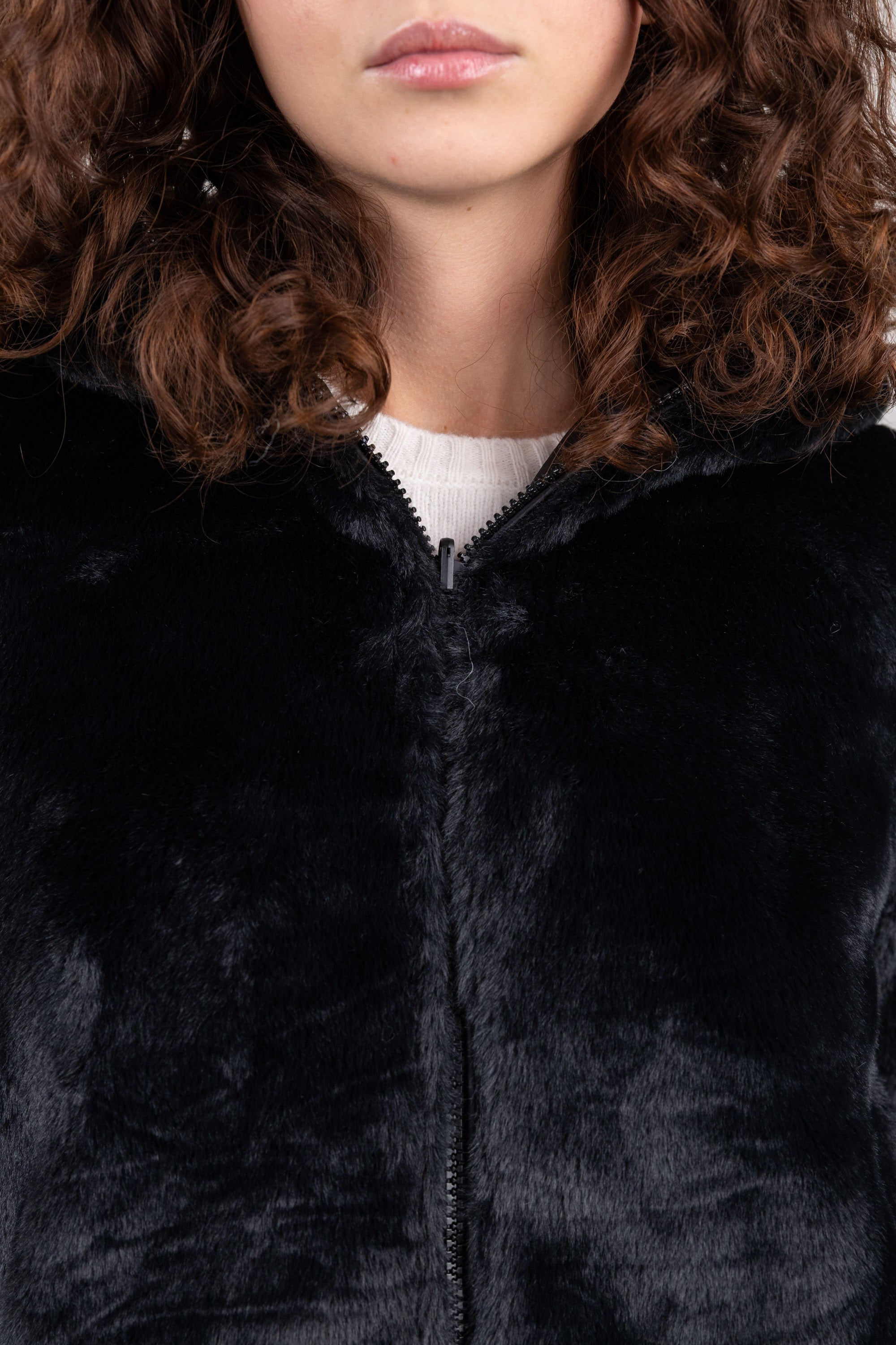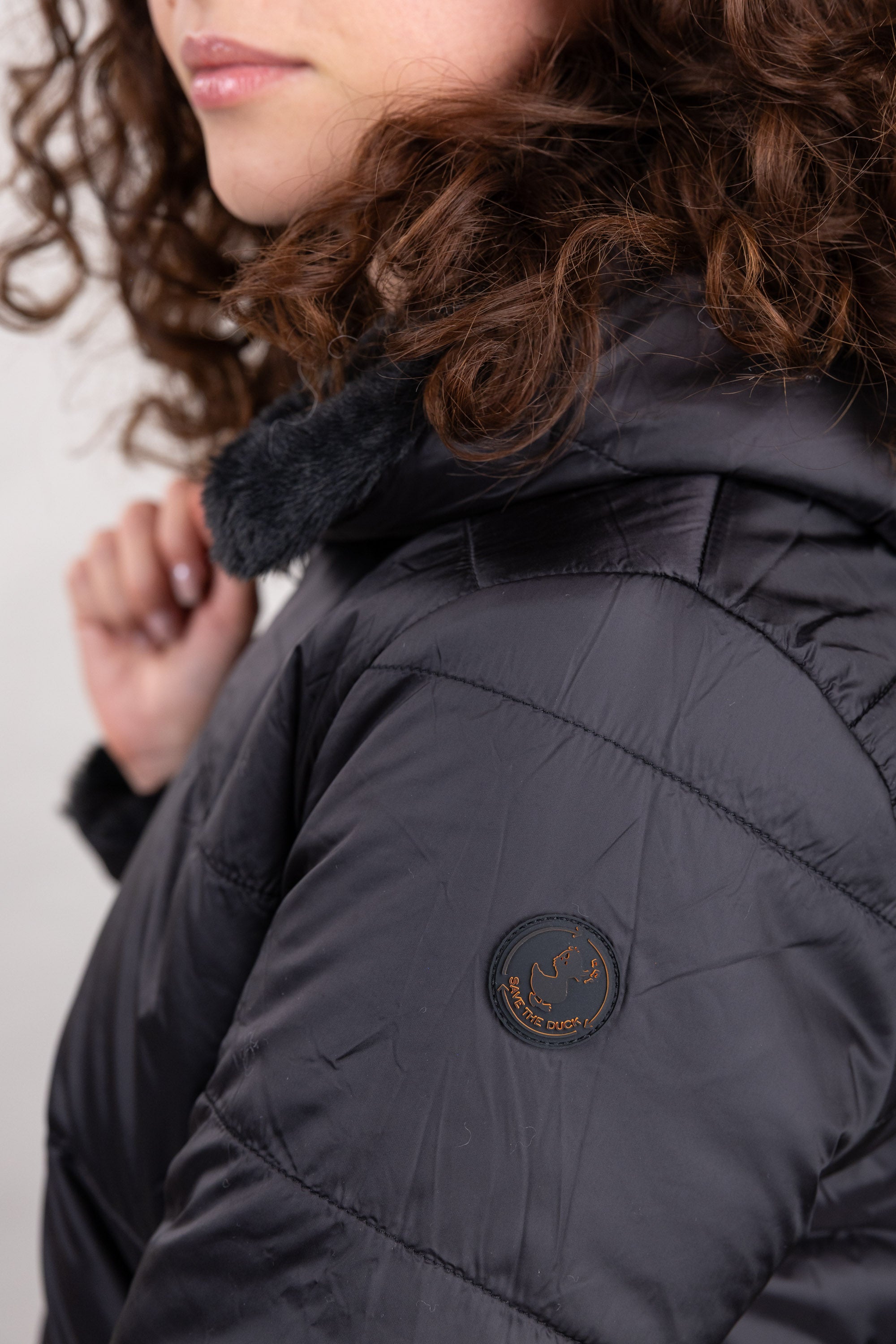 Alternativa animal free alla classica pelliccia, il modello donna Bridget è un giubbotto lungo dal design reversibile, con un lato trapuntato e un lato in soffice pelliccia sintetica di poliestere riciclato. Il capo ha un ampio cappuccio e tasche basse nascoste su entrambi i lati. Chiuso da una zip centrale in plastica con cursore reversibile e tiretto personalizzato, è completo di logo tono su tono su un lato.