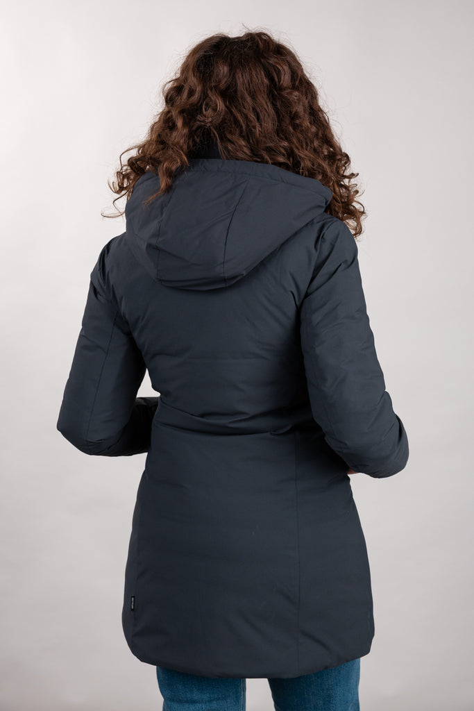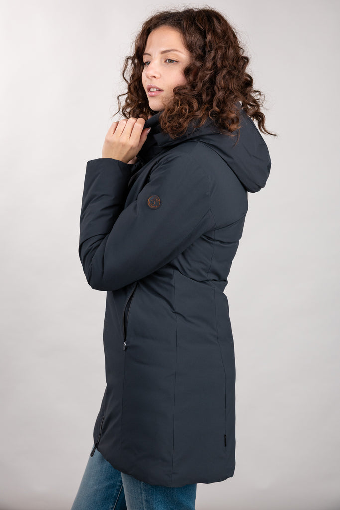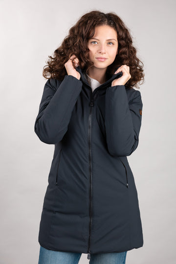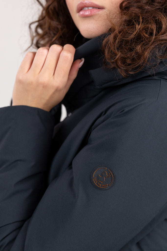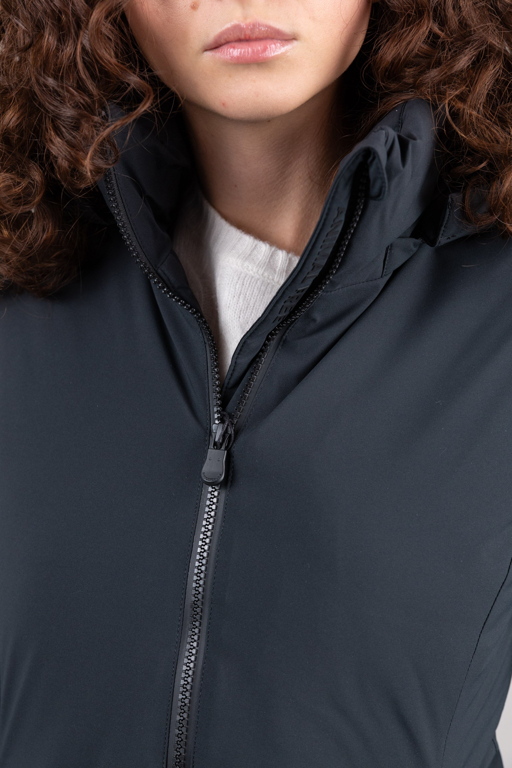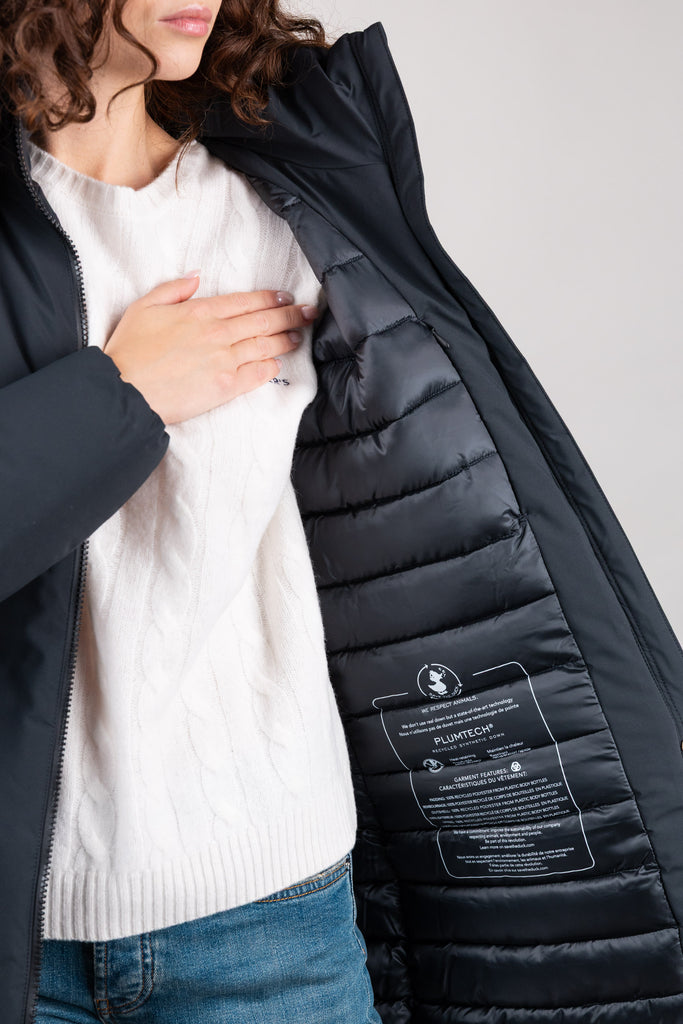 Il parka Rachel è progettato per affrontare il freddo e l'umidità con un tocco animal-free. Realizzato con tessuti riciclati e imbottito con Recycled Plumtech®, presenta un cappuccio staccabile e regolabile, una zip frontale impermeabile e tasche laterali con zip. Tiretti personalizzati e un logo tono su tono termoincollato completano il look.
