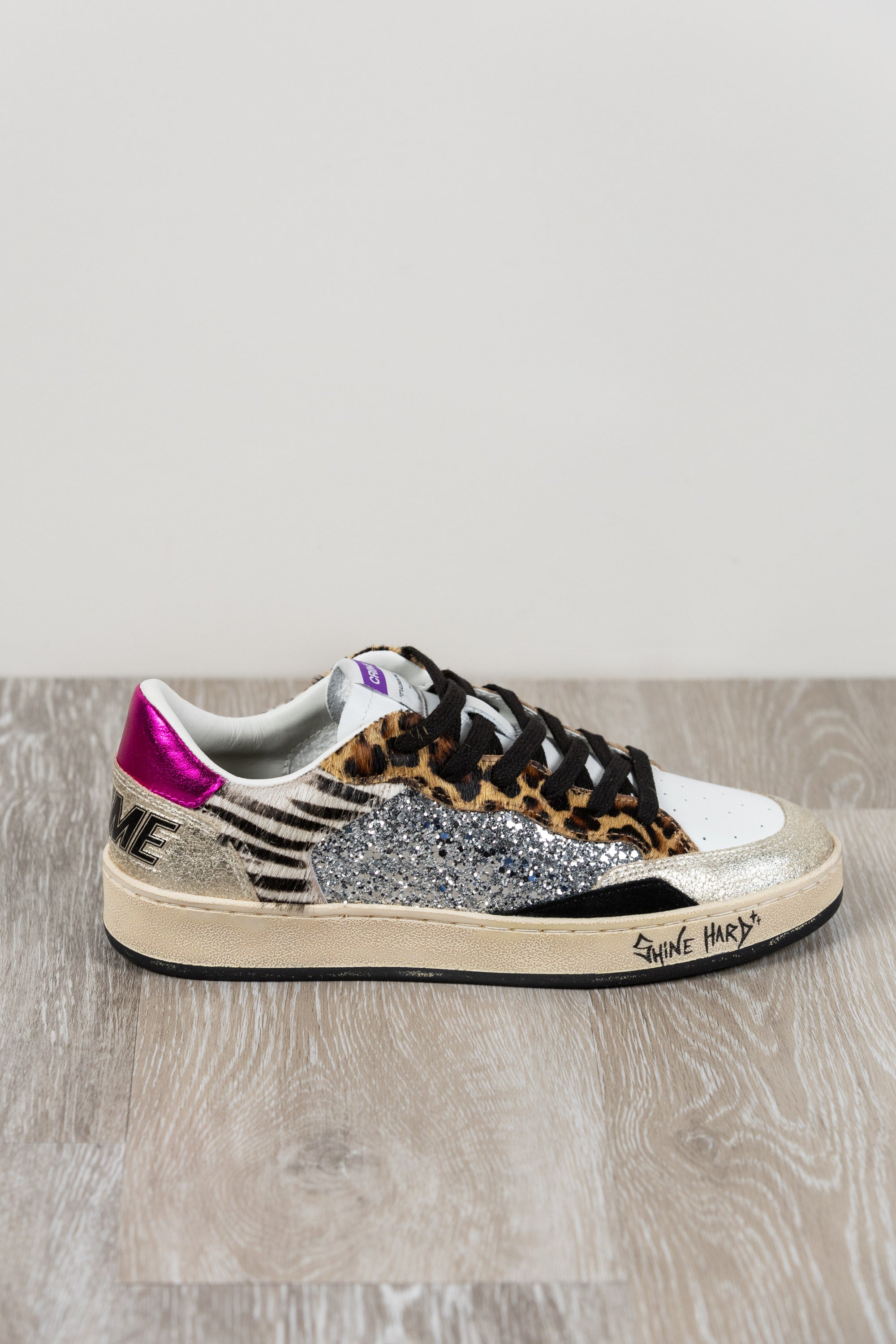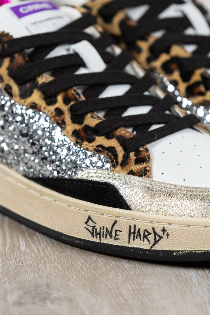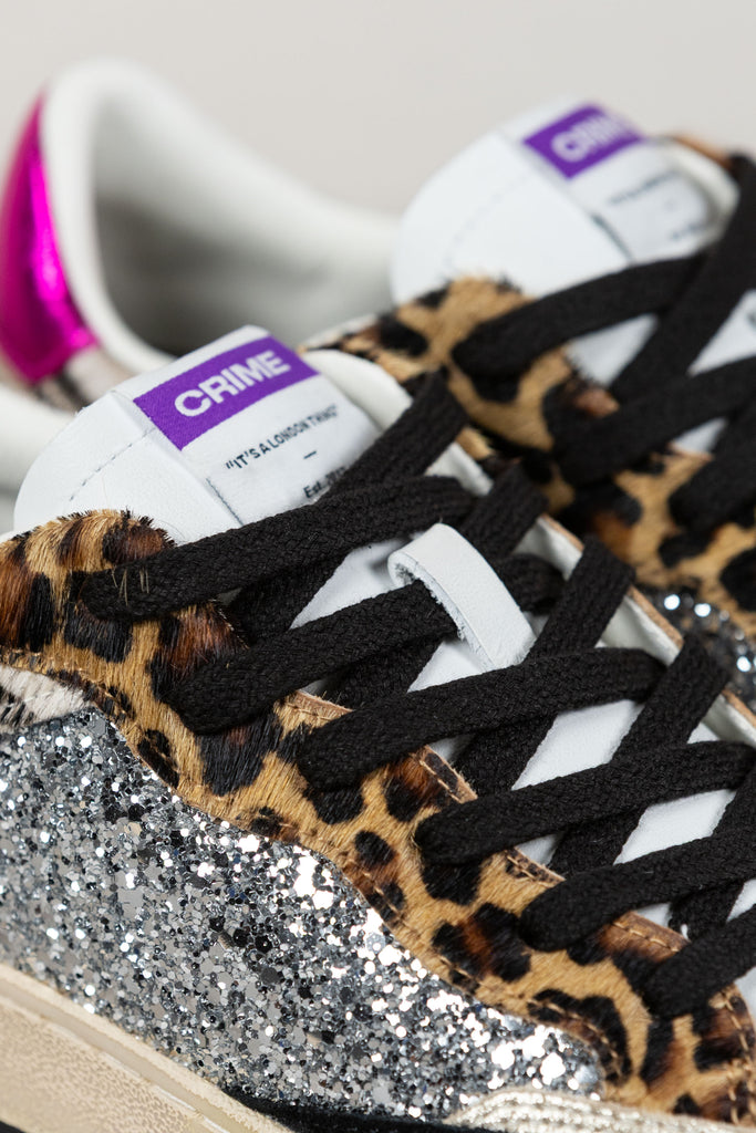 Obermaterial aus silbernem Glitzer, Details aus Ponyfell im Leopardenmuster