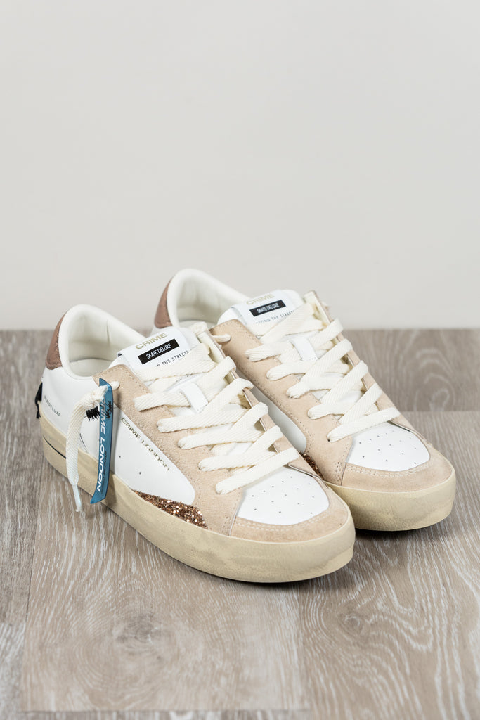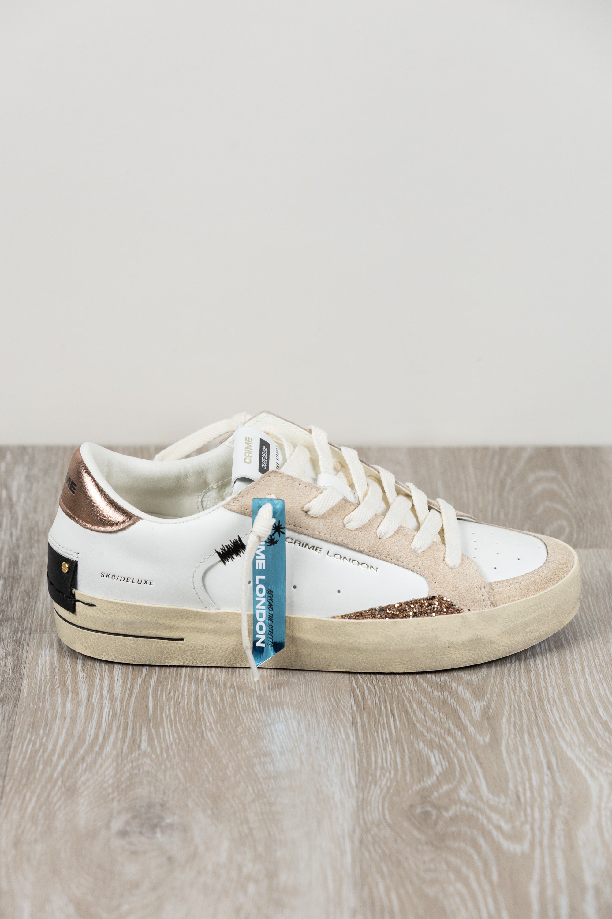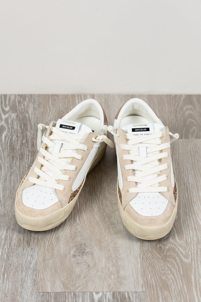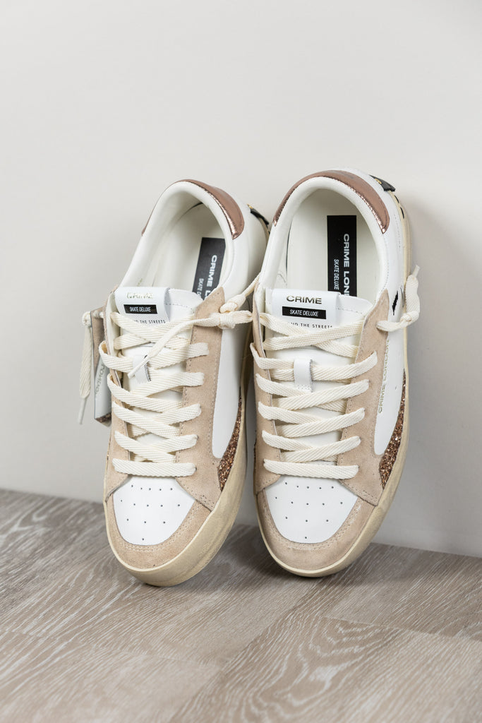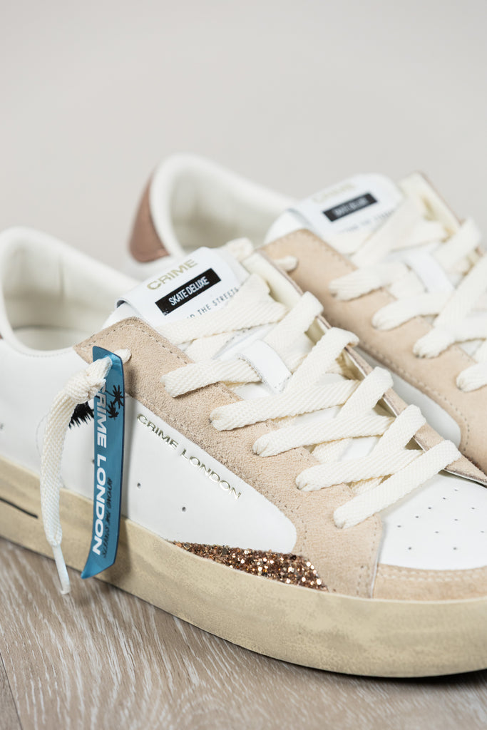 Obermaterial aus weißem Leder, Details aus beigefarbenem Wildleder und goldenem Glitzer