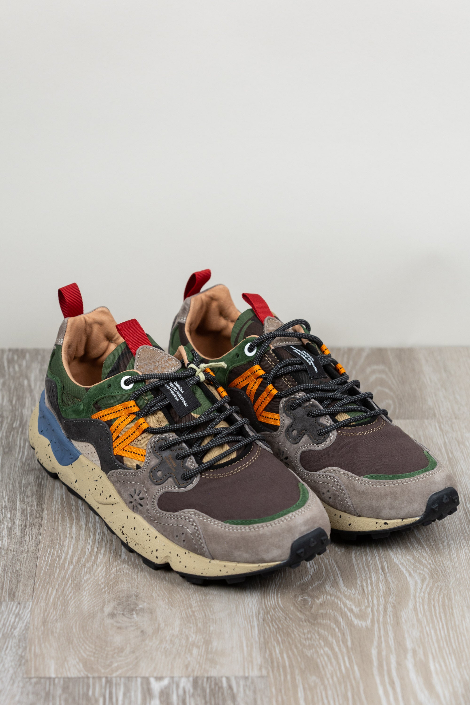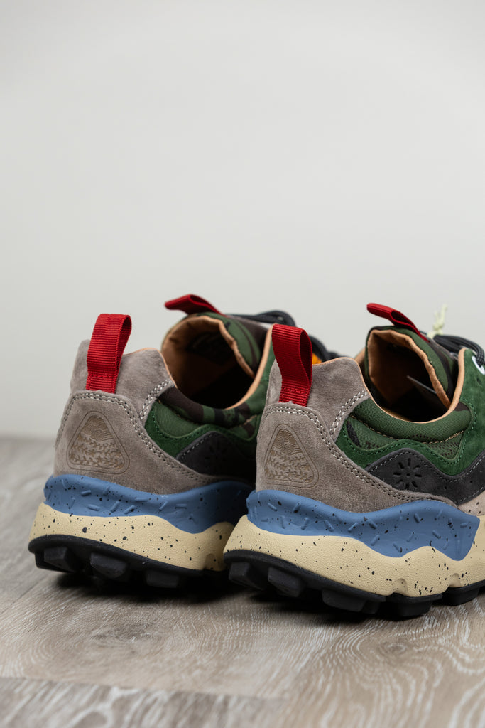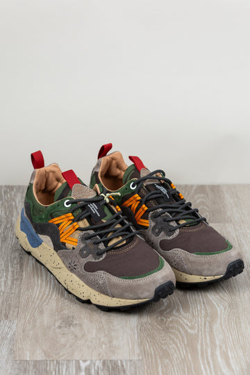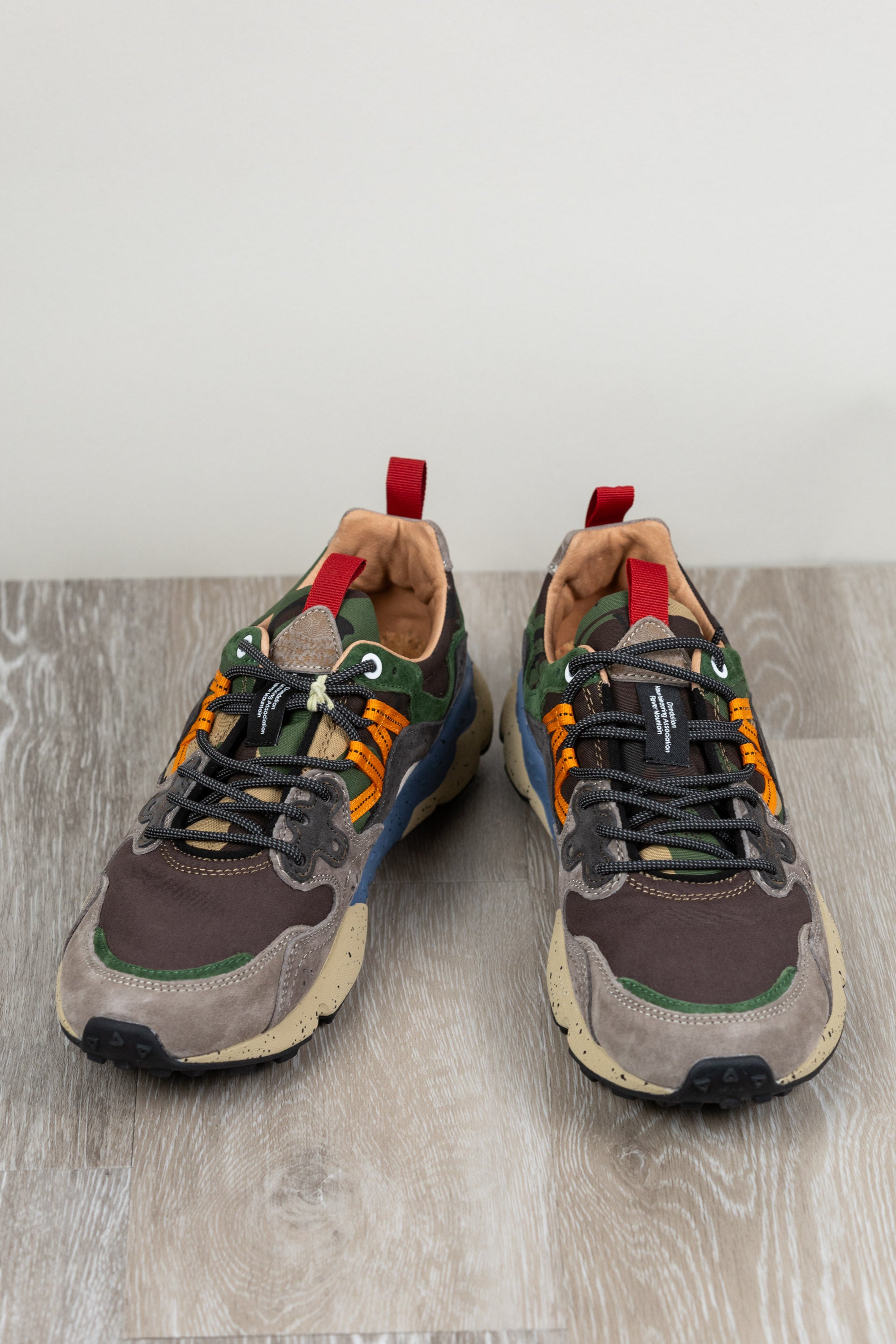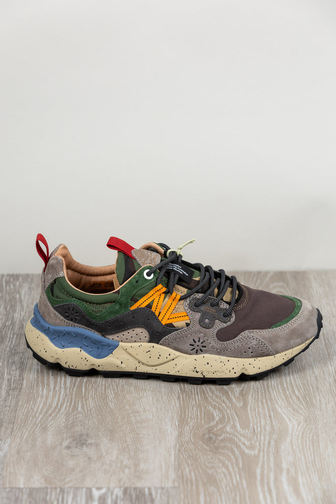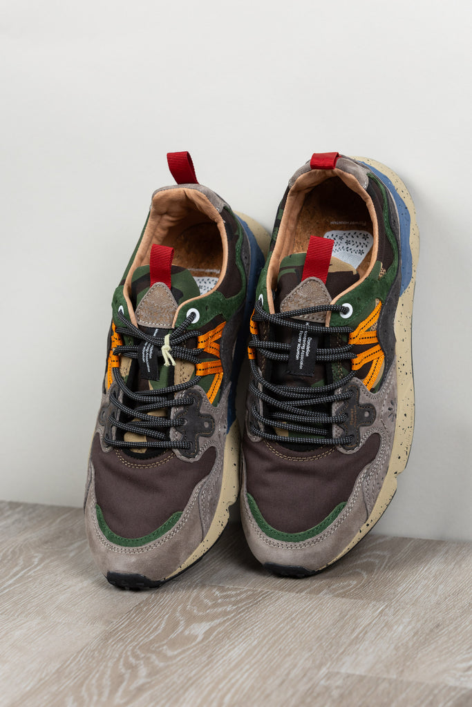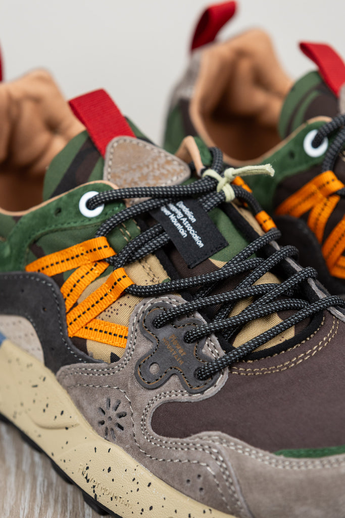 Sneaker aus technischem Gewebe und Wildleder, mit verstärkten Ösen, Trekkingschnürsenkeln, anatomischer und antibakterieller Kork-Innensohle. Ultraleichte Gummisohle mit gezacktem Profil.