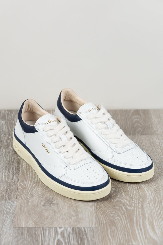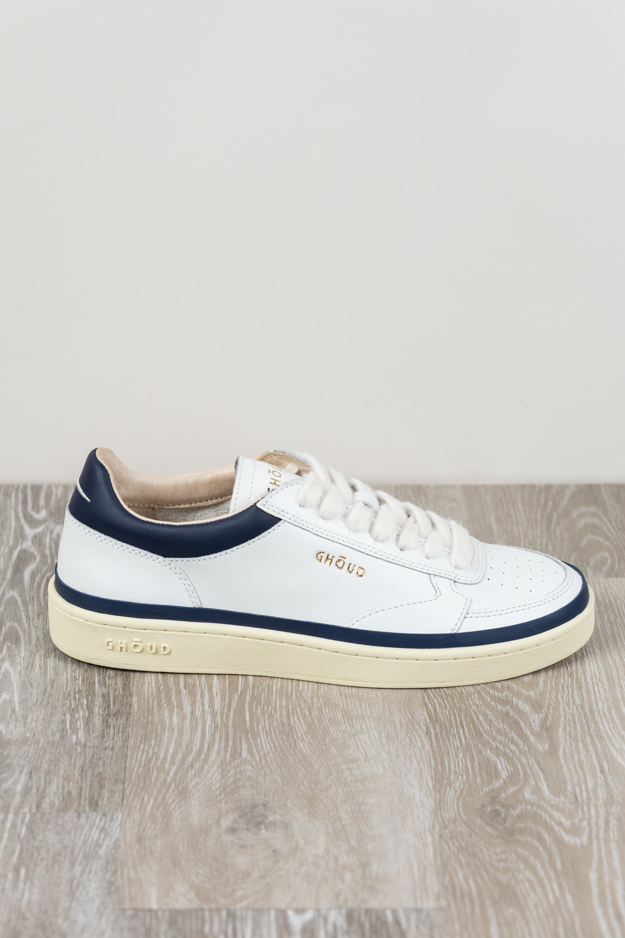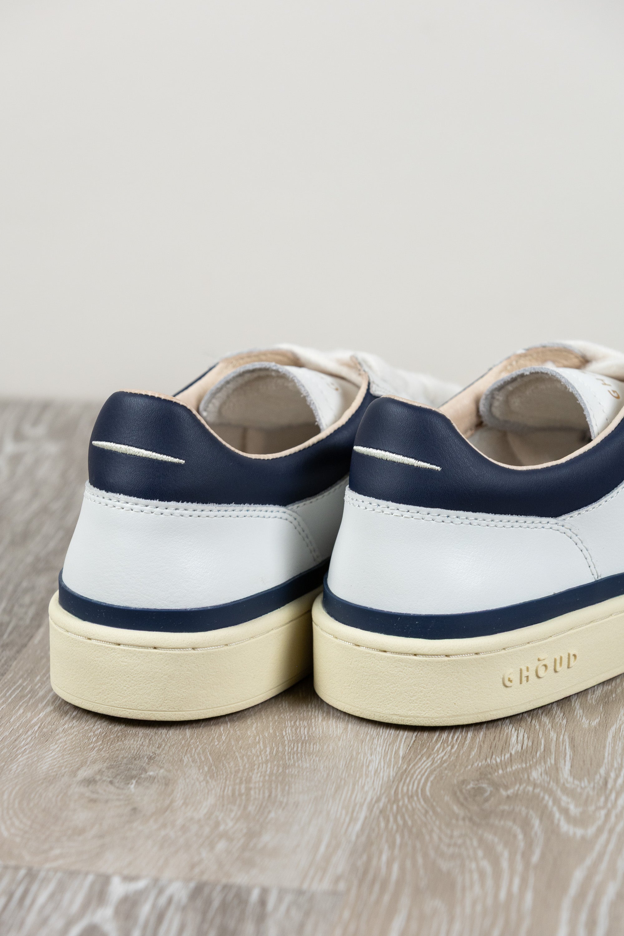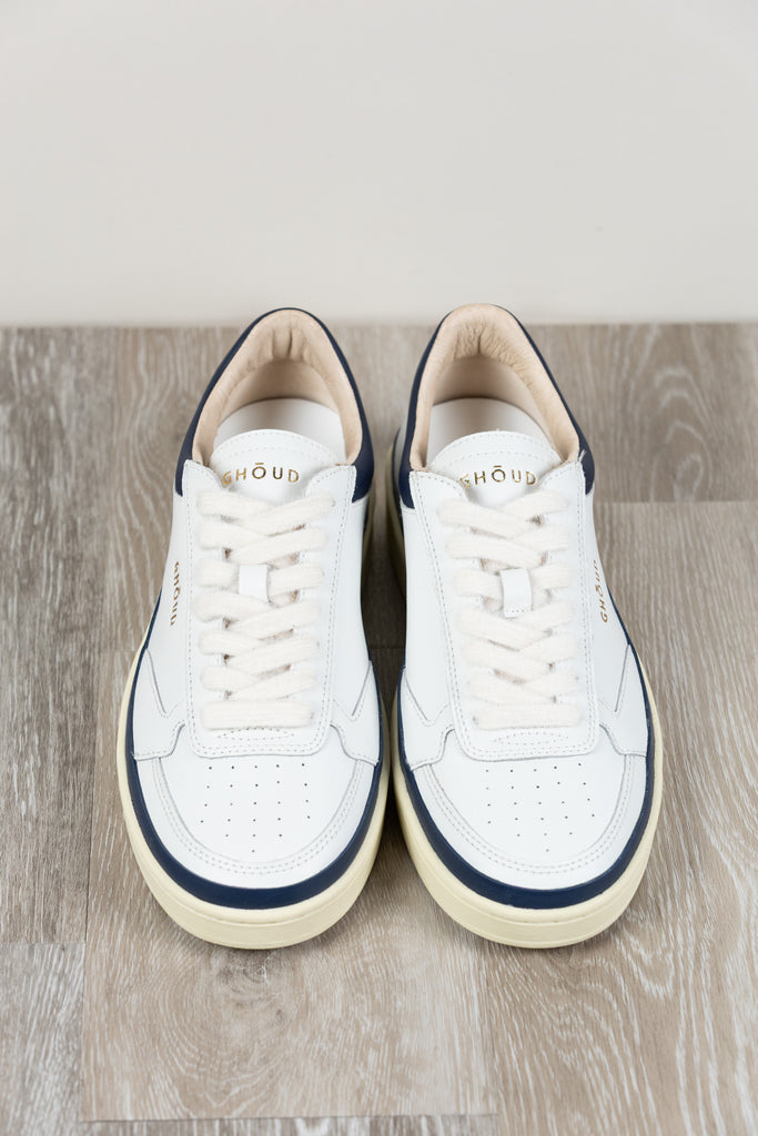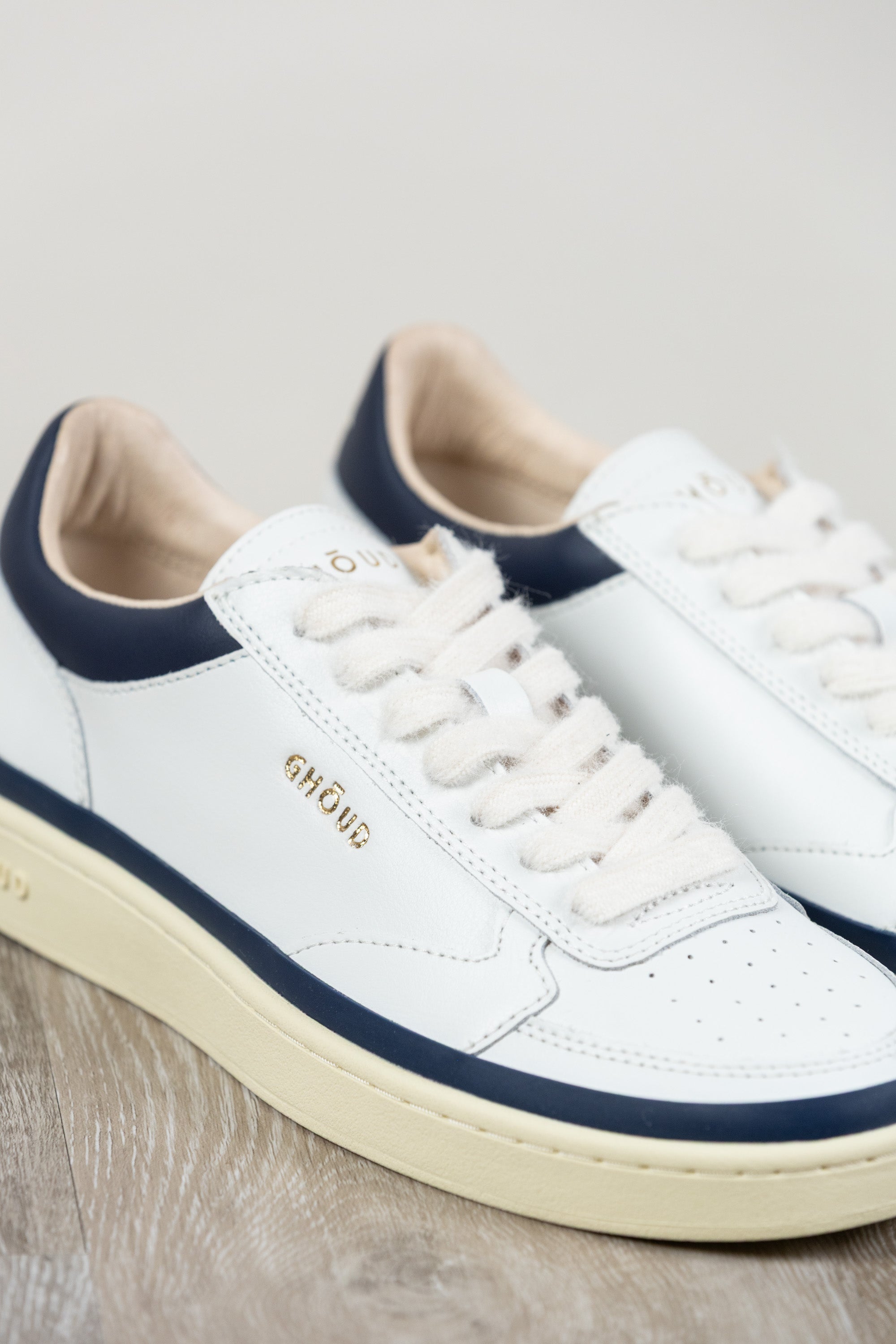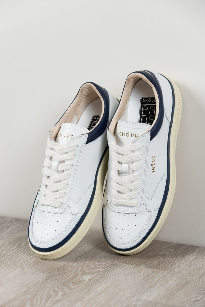 Sneakers Pads, Ghōuds neueste Kreation, zelebriert die Essenz zeitgenössischen Designs. Die elegante Silhouette zeichnet sich durch ein Obermaterial aus weichem weißem Leder mit blauen Akzenten aus, verziert mit präziser Heißversiegelung entlang der Sohle, die das Konzept des Minimalismus neu definiert.