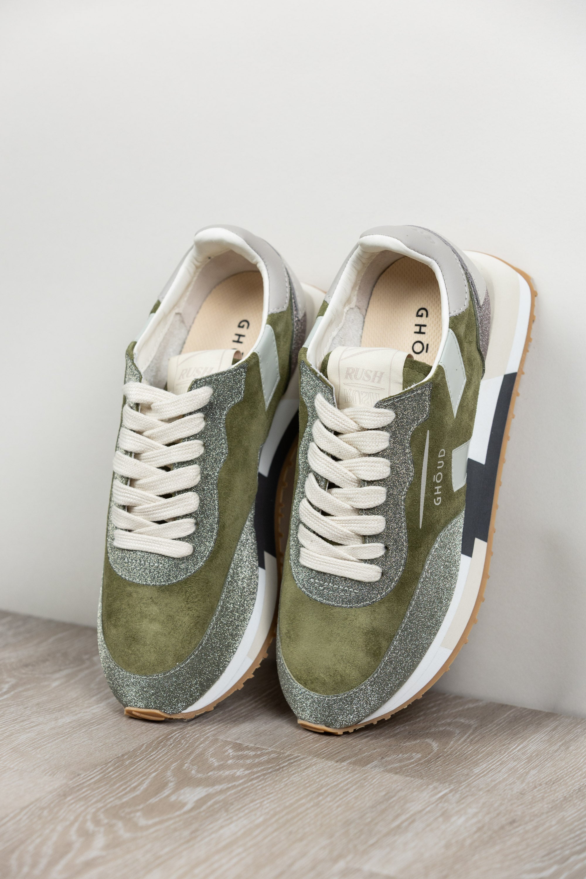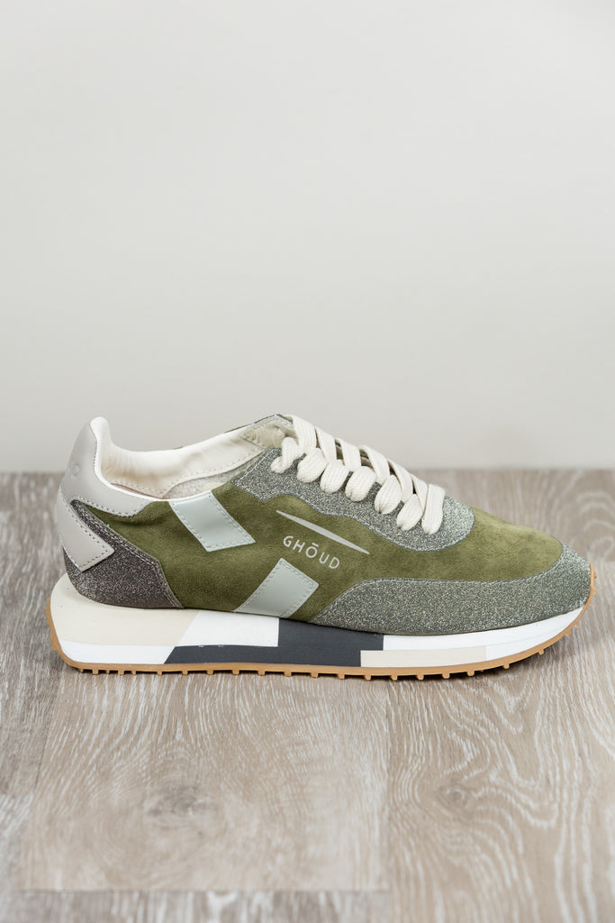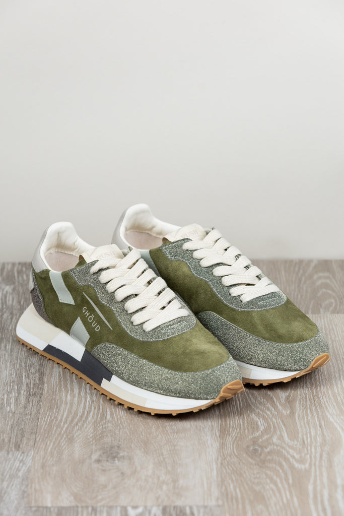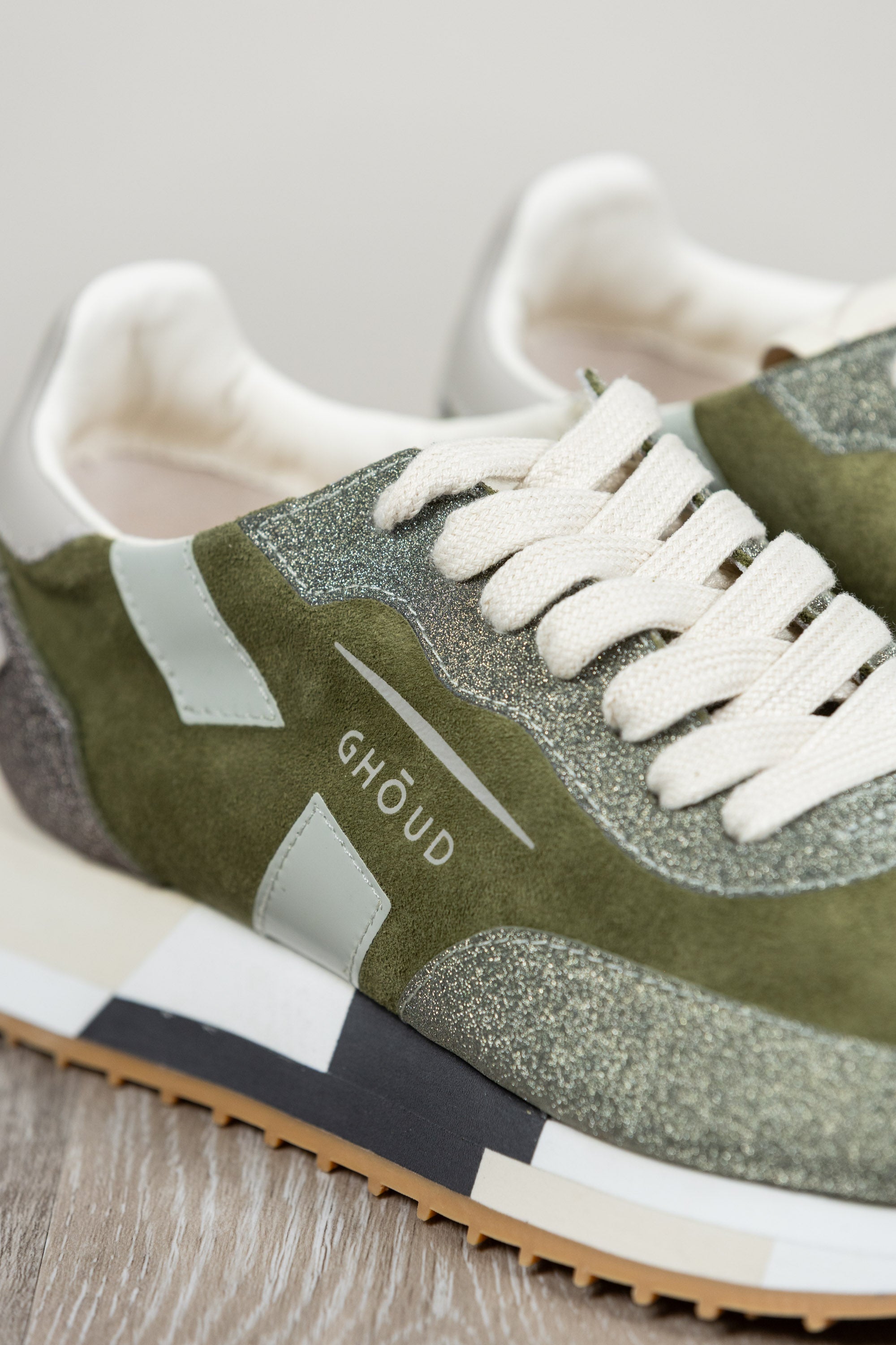Der Ghōud Starlight Sneaker ist ein moderner Fashion-Runner mit minimalistischem Design und klaren geometrischen Linien. Obermaterial aus Nylon mit Glitzerdetails. Ikonisches Logo an der Seite.
