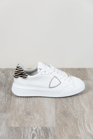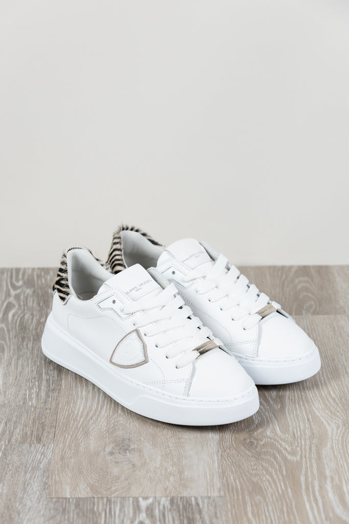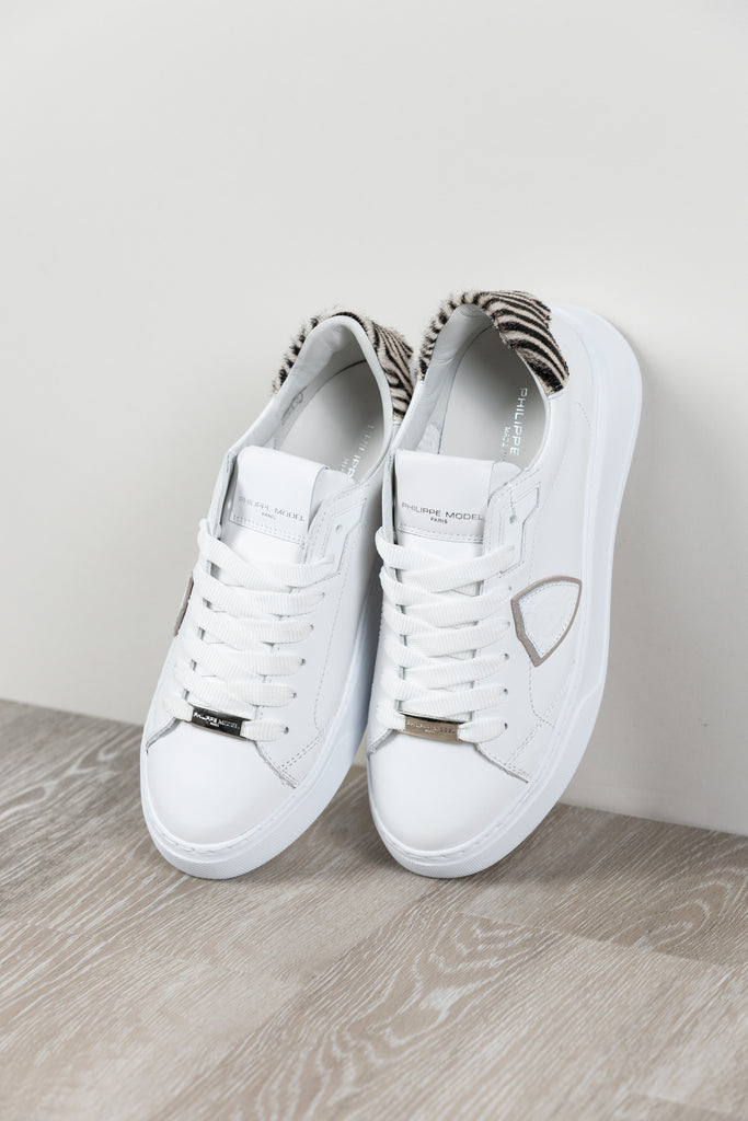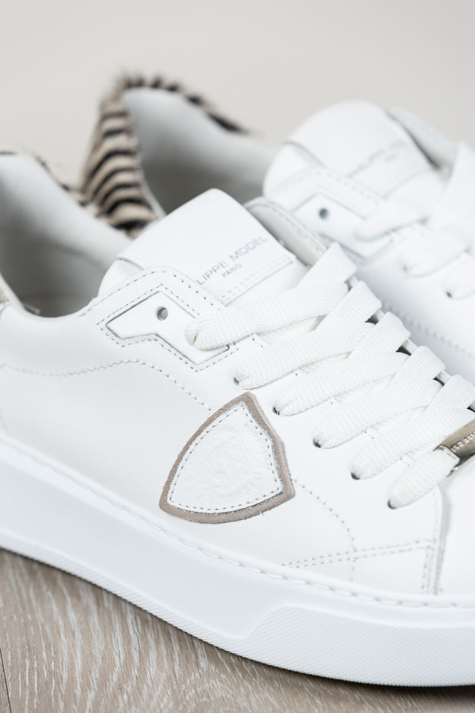 Architektonisches Design und Street Spirit. Temple zeichnet sich durch essentielle Formen und Schlichtheit aus, inspiriert von den Modellen der 1990er Jahre und mit Kreativität neu interpretiert. Das Obermaterial aus weichem, weißem Kalbsleder wird durch eine Fersenlasche aus Ponyfell mit Zebramuster ergänzt. Die ultraleichte Gummisohle.