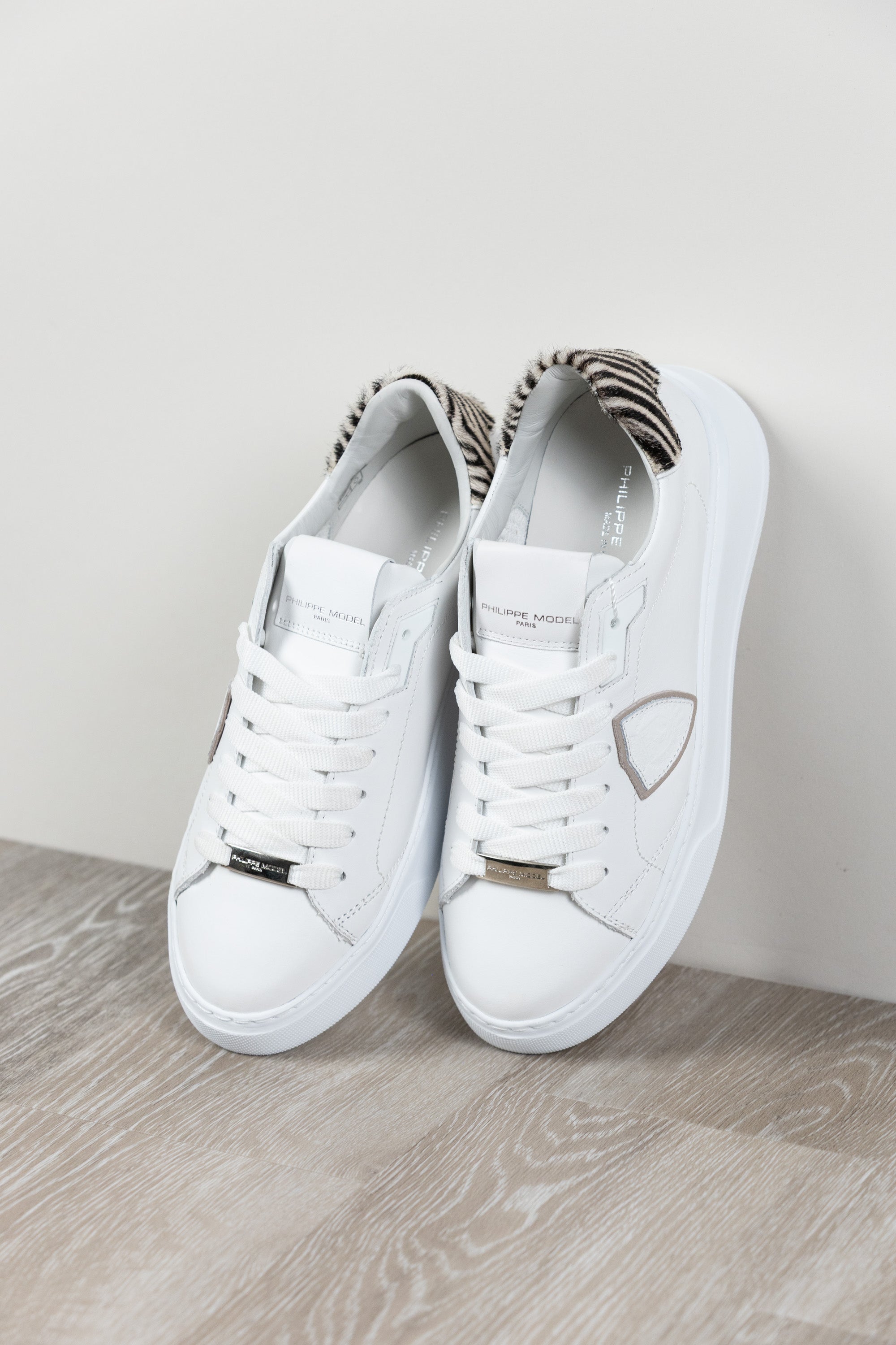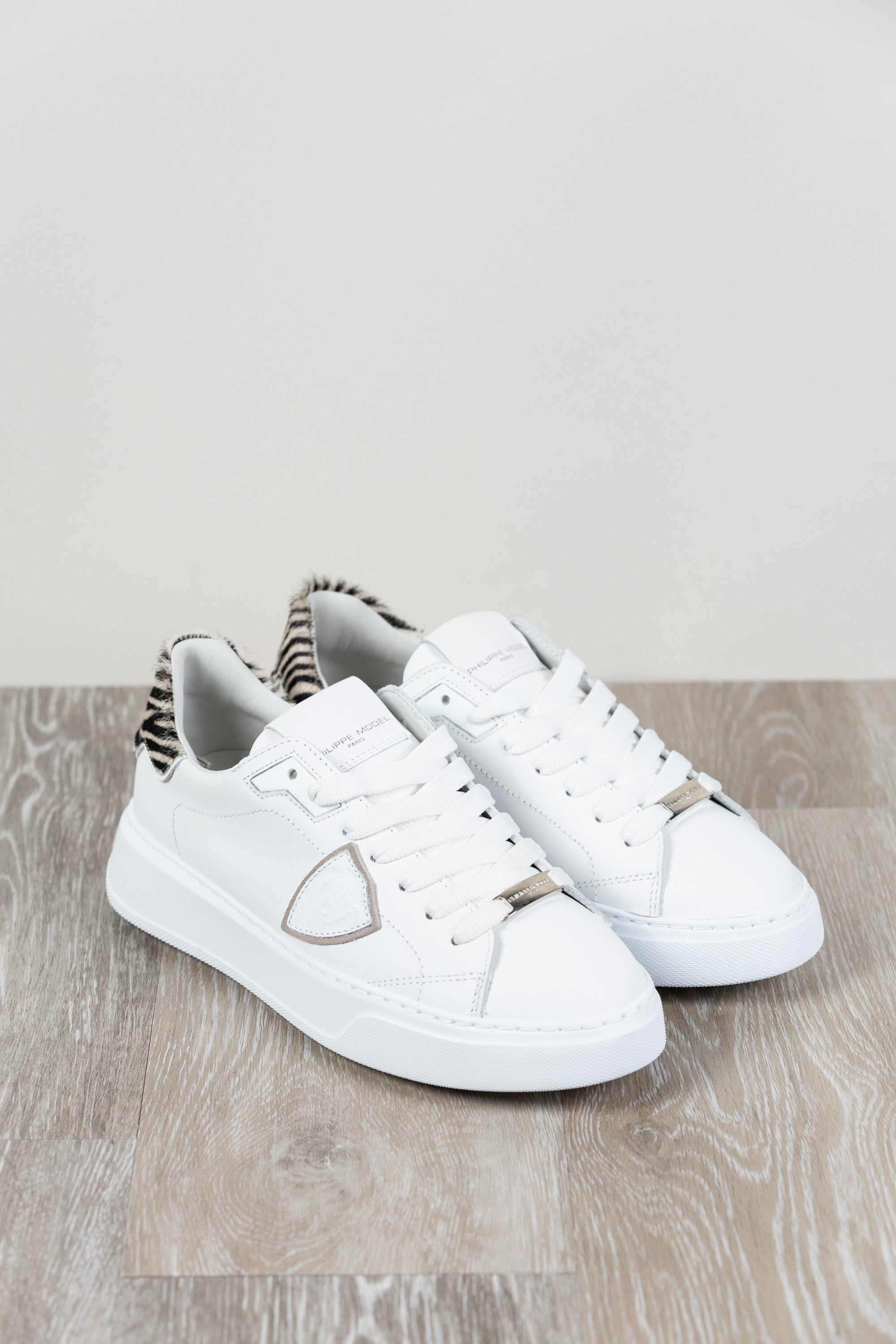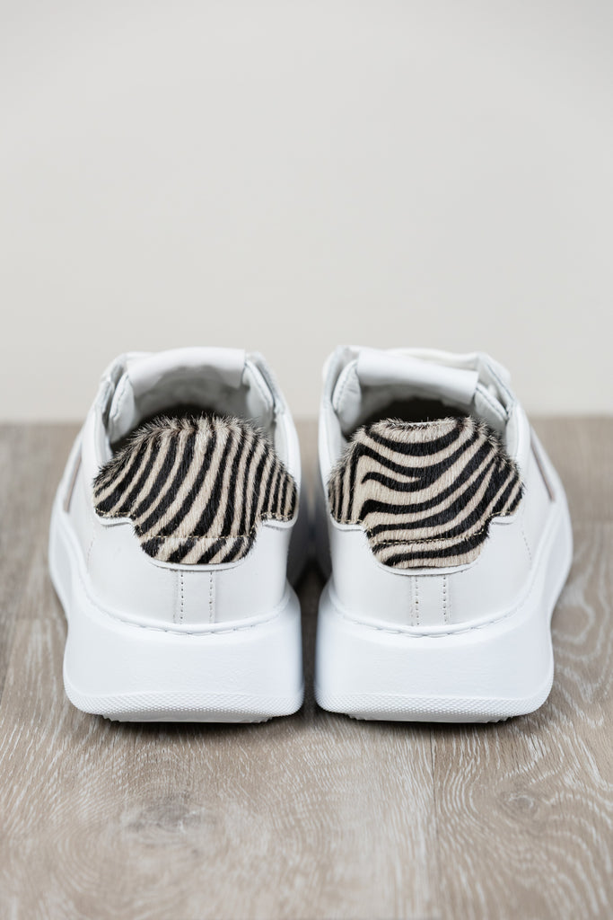 Sneaker aus Kalbsleder mit Absatz aus Ponyfell mit Zebramuster. Herausnehmbare Memory Foam-Innensohle, Futter aus Baumwollfrottee. Ultraleichte Gummilaufsohle mit Absatzhöhe.