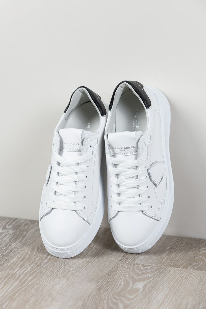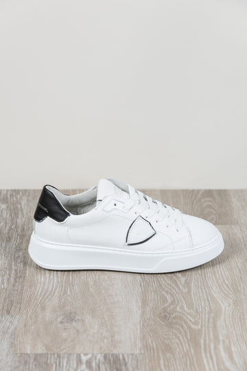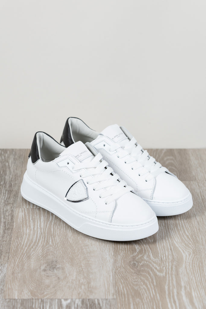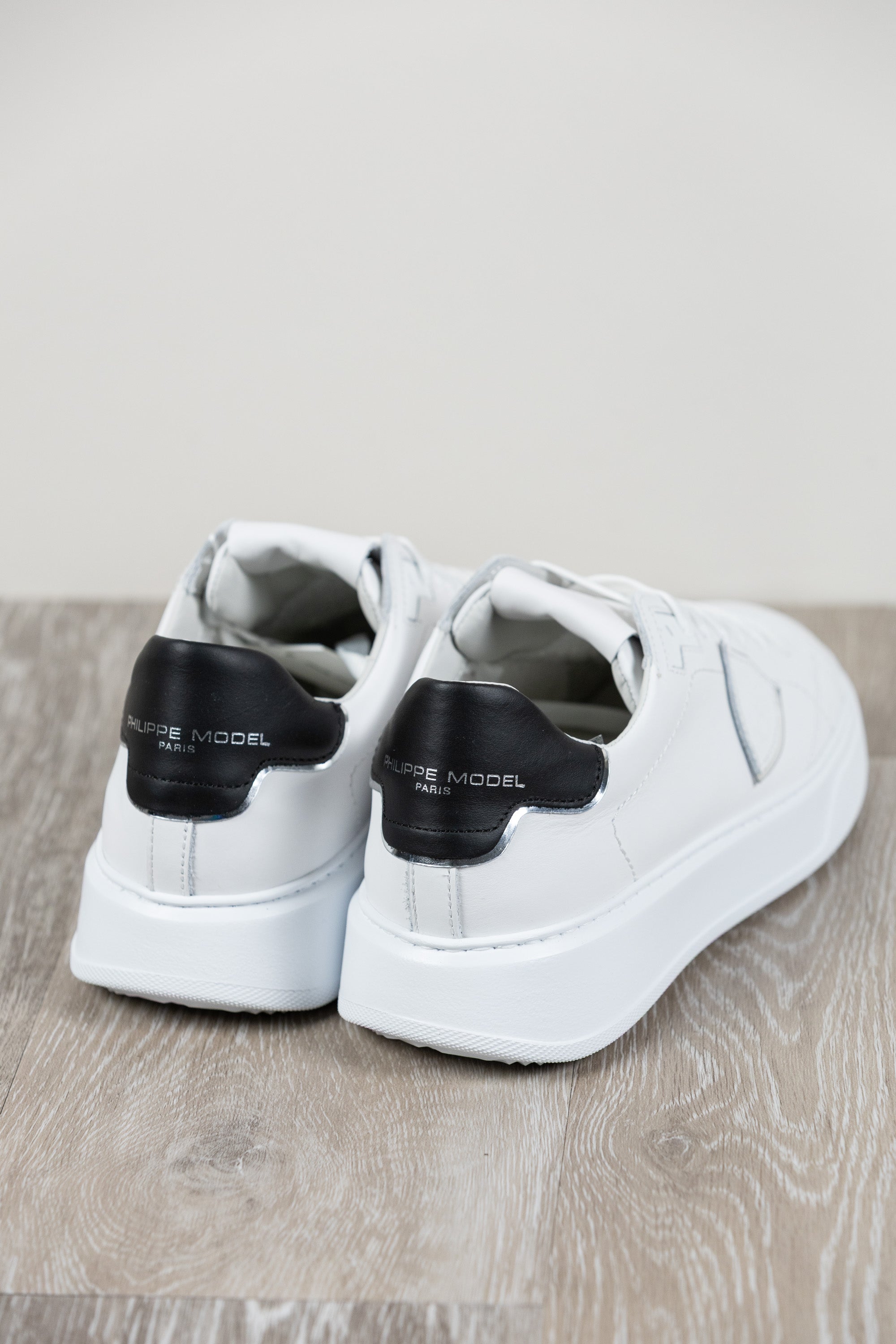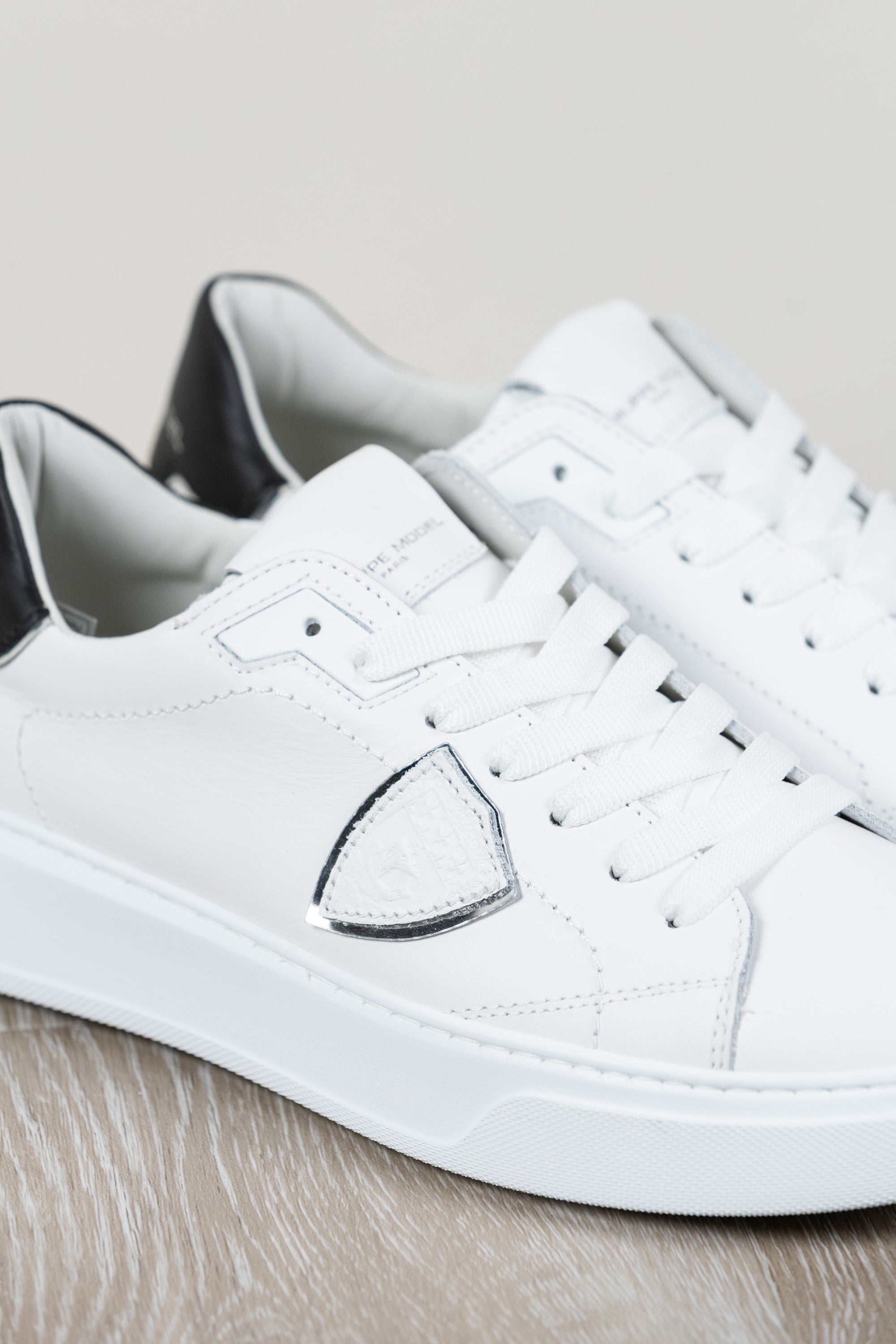 Schlichtheit und coole Formen in puristischem Schwarz und Weiß: der neue Temple Sneaker mit Obermaterial aus reinweißem Kalbsleder, schwarzem Patch und einem mit silberner Zierleiste verzierten Seitenschild. Perfekt für einen aktiven, schicken Touch in der Stadt, abgerundet durch eine markante, ultraleichte Gummisohle mit handgefertigten Oberflächen.