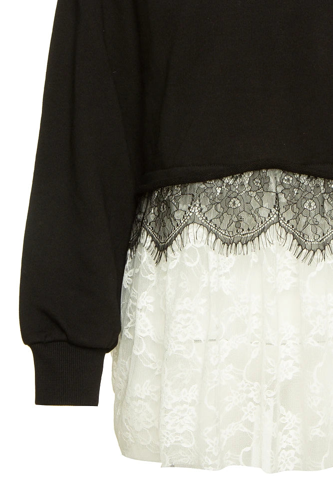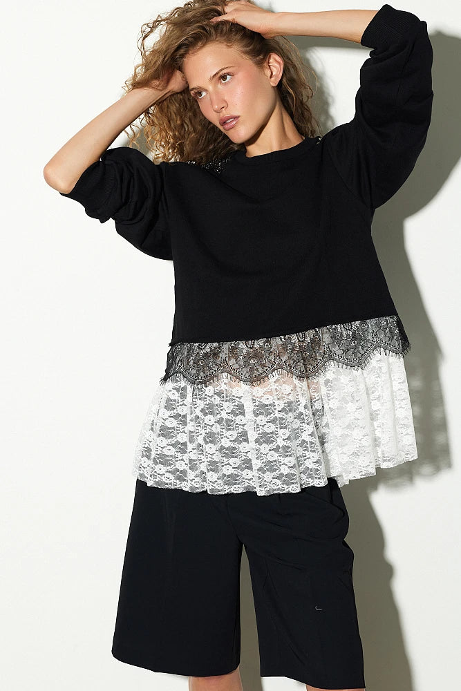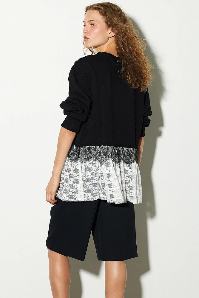 Felpa, con maniche lunghe, scollo rotondo, con pizzo, con strass applicati sulle spalle, vestibilità regolare, cotone