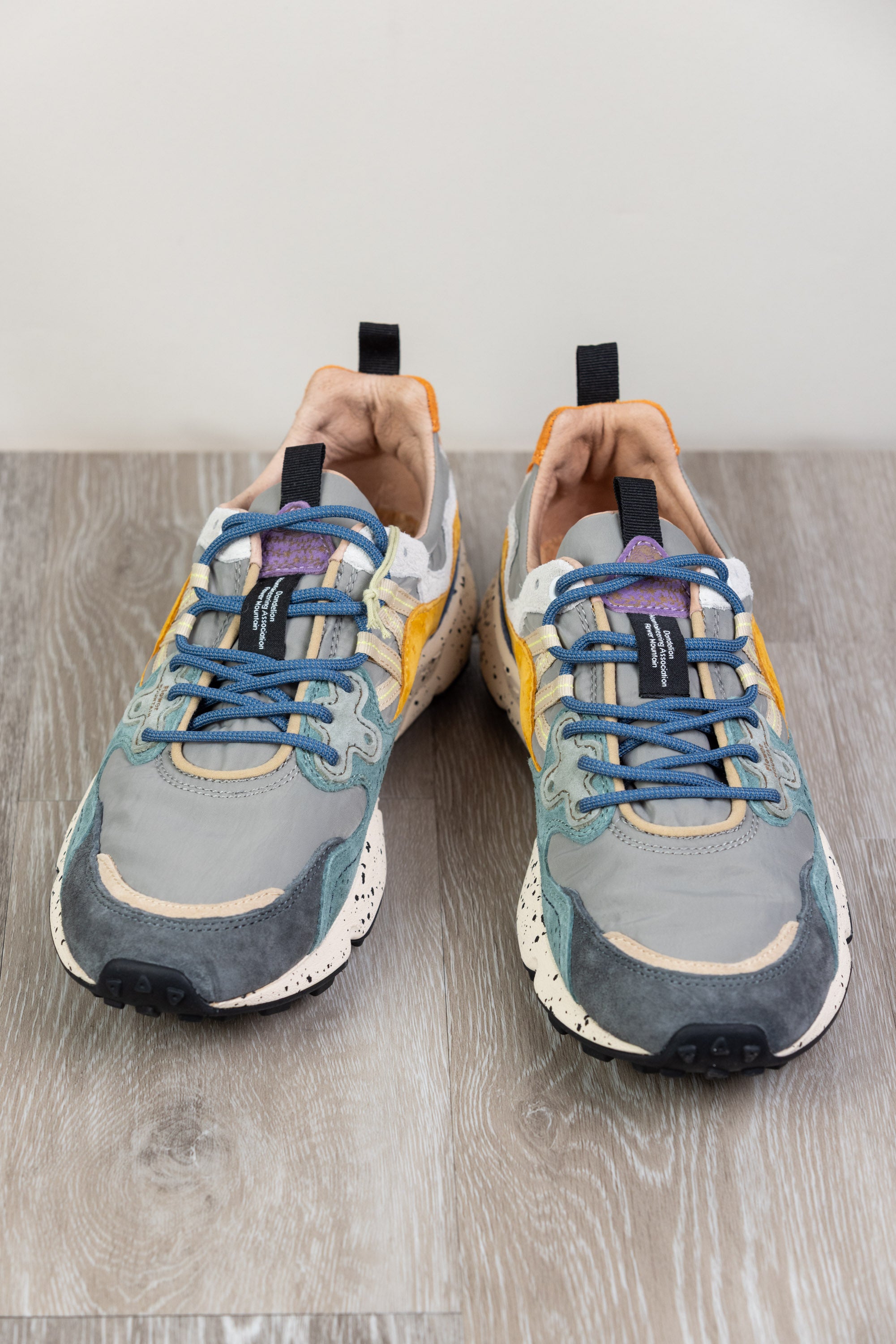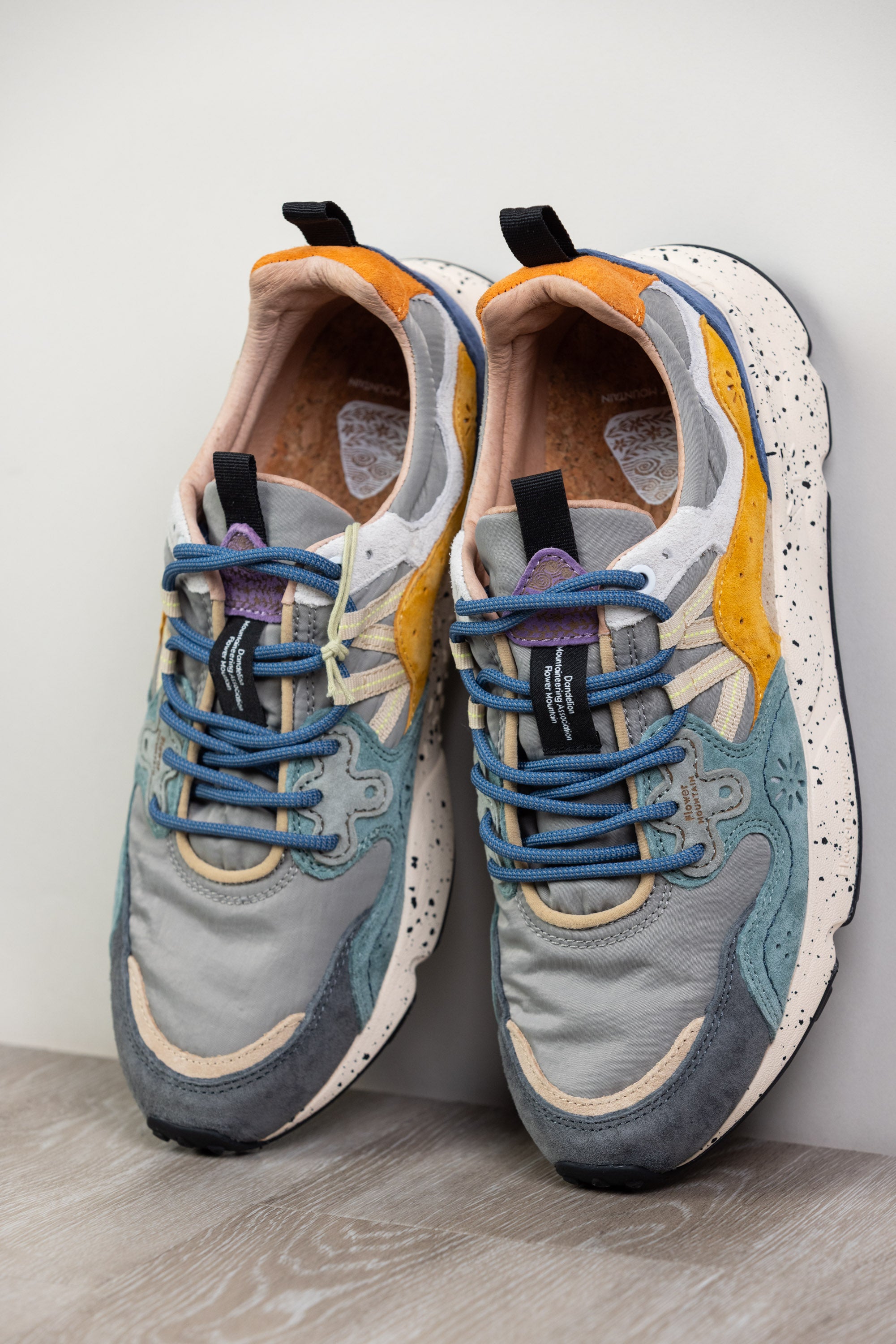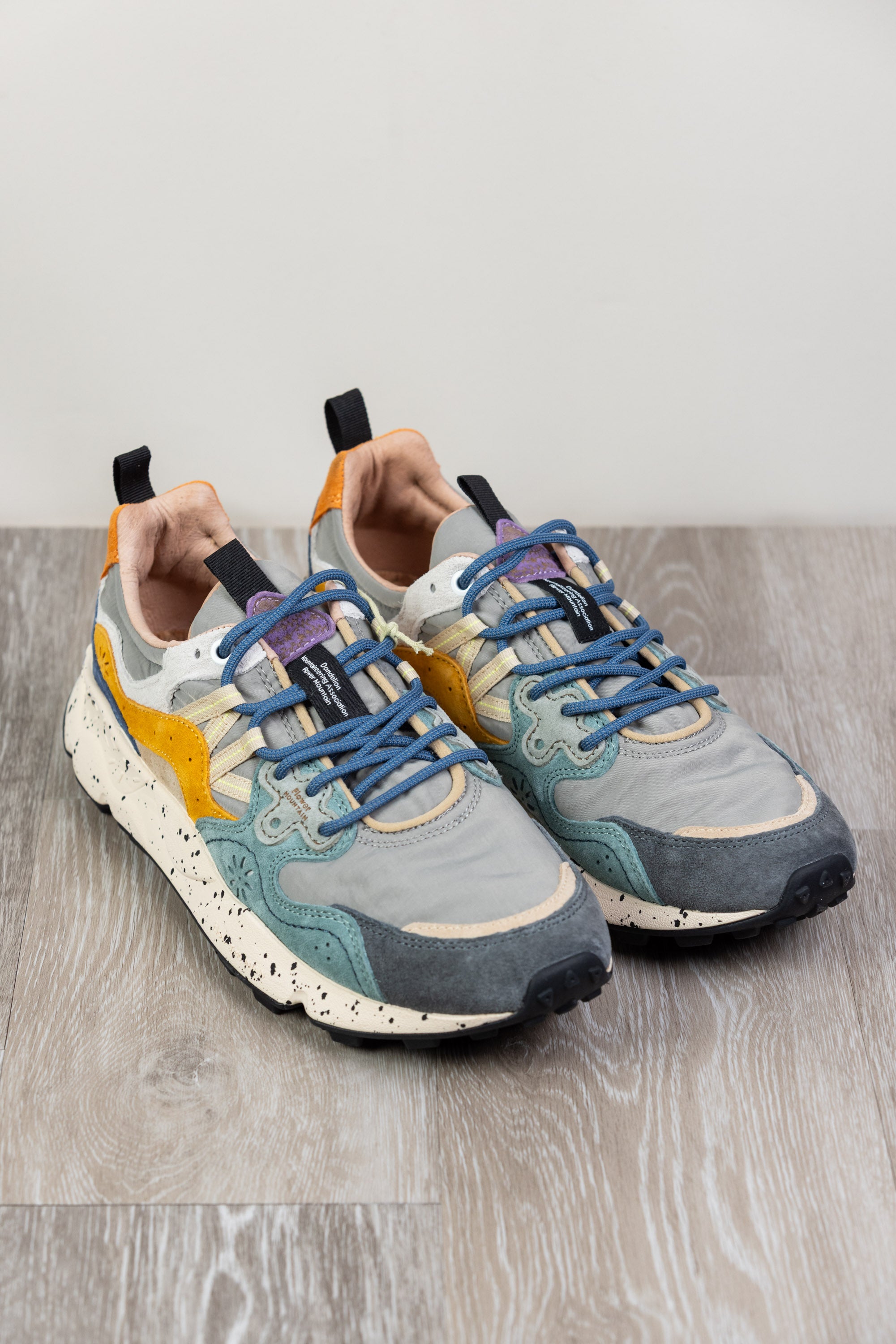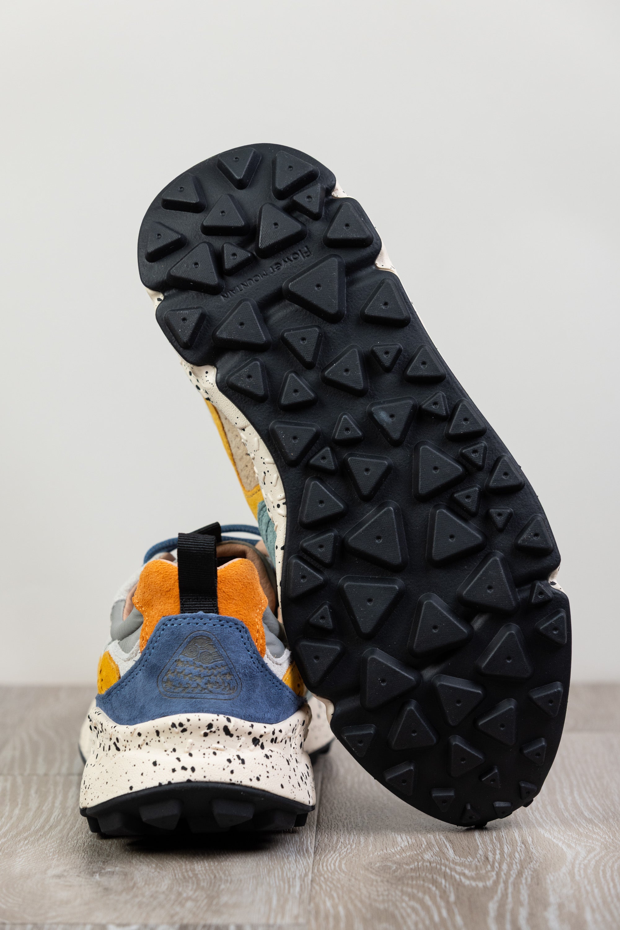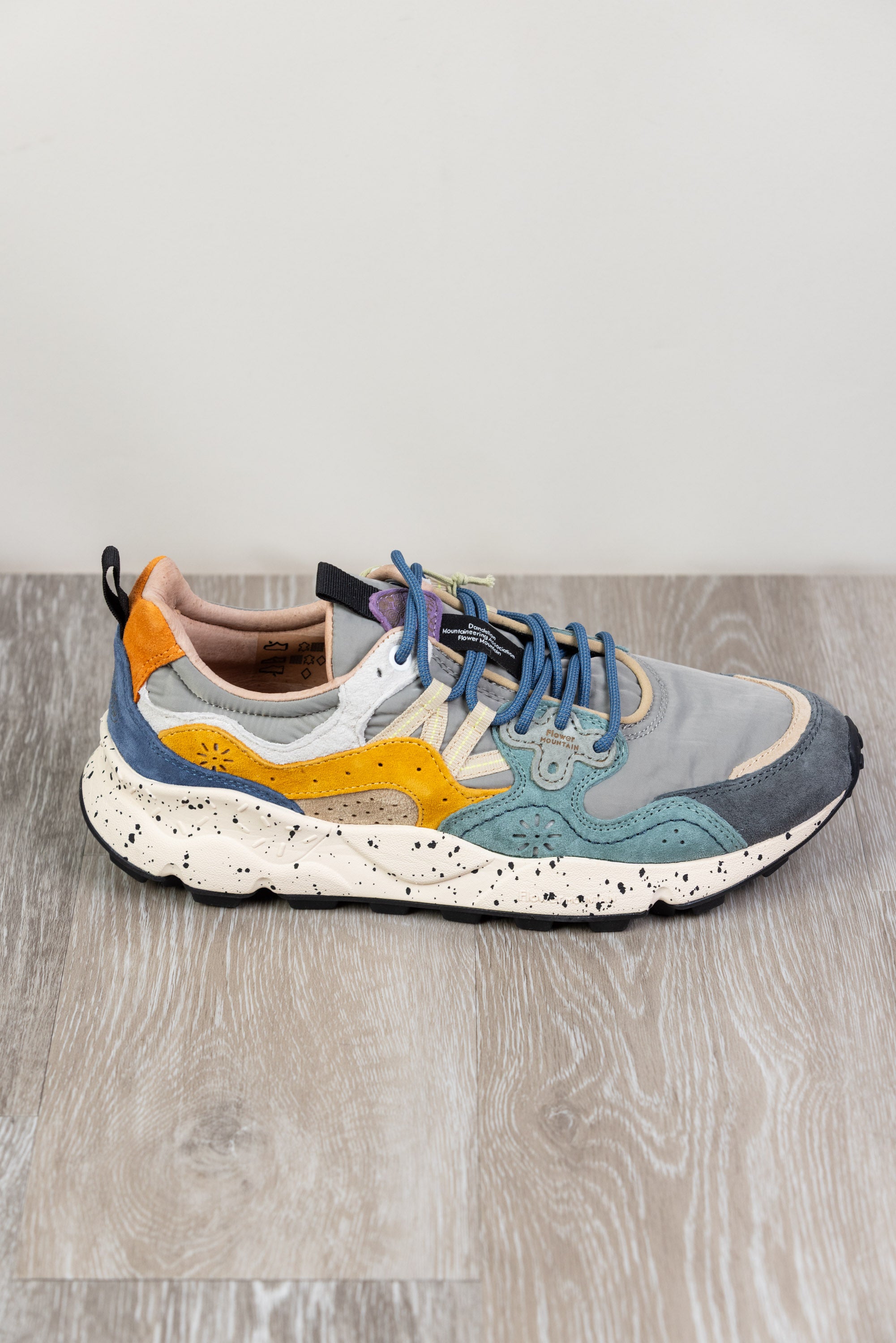 Sneaker in tessuto tecnico con inserti in suede multicolor. Occhielli rinforzati e lacci trek. Soletta interna in sughero naturale antibatterico, fondo in gomma ultra leggera con battistrada dentellato.