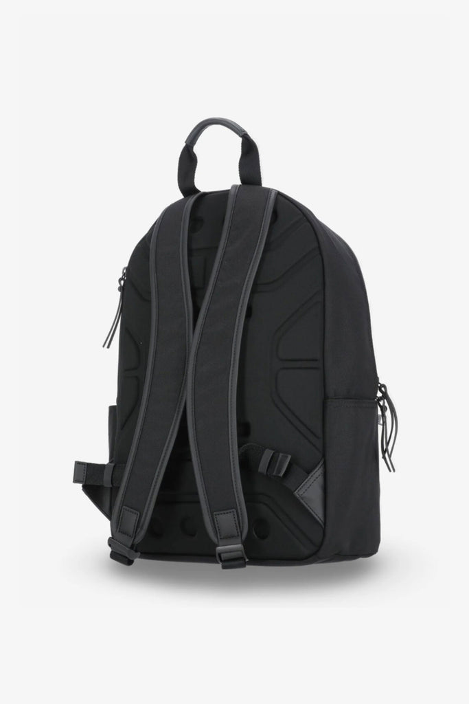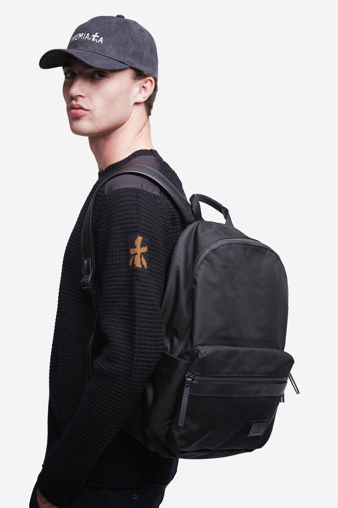 Ein geräumiges und vielseitiges Modell aus hochwertigem Nylon-Gabardine mit ausfransfester und wasserabweisender Ausrüstung. EVA-gepolsterte Schultergurte für zusätzlichen Tragekomfort. Wasserdichte Vordertaschen mit Kalbslederbesatz und matten Metallverschlüssen.