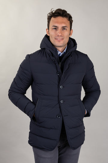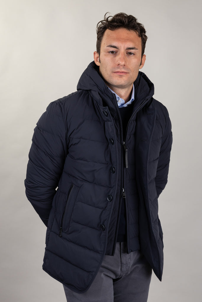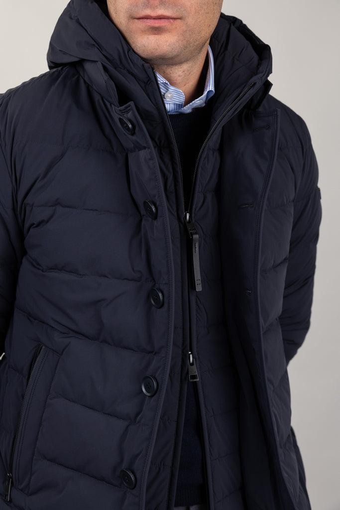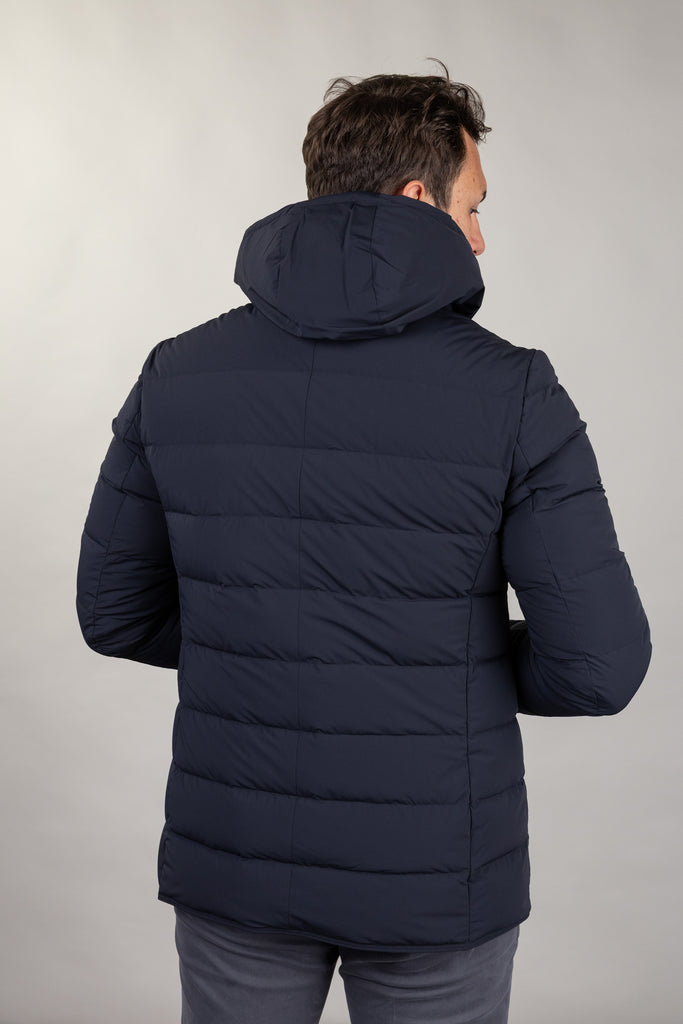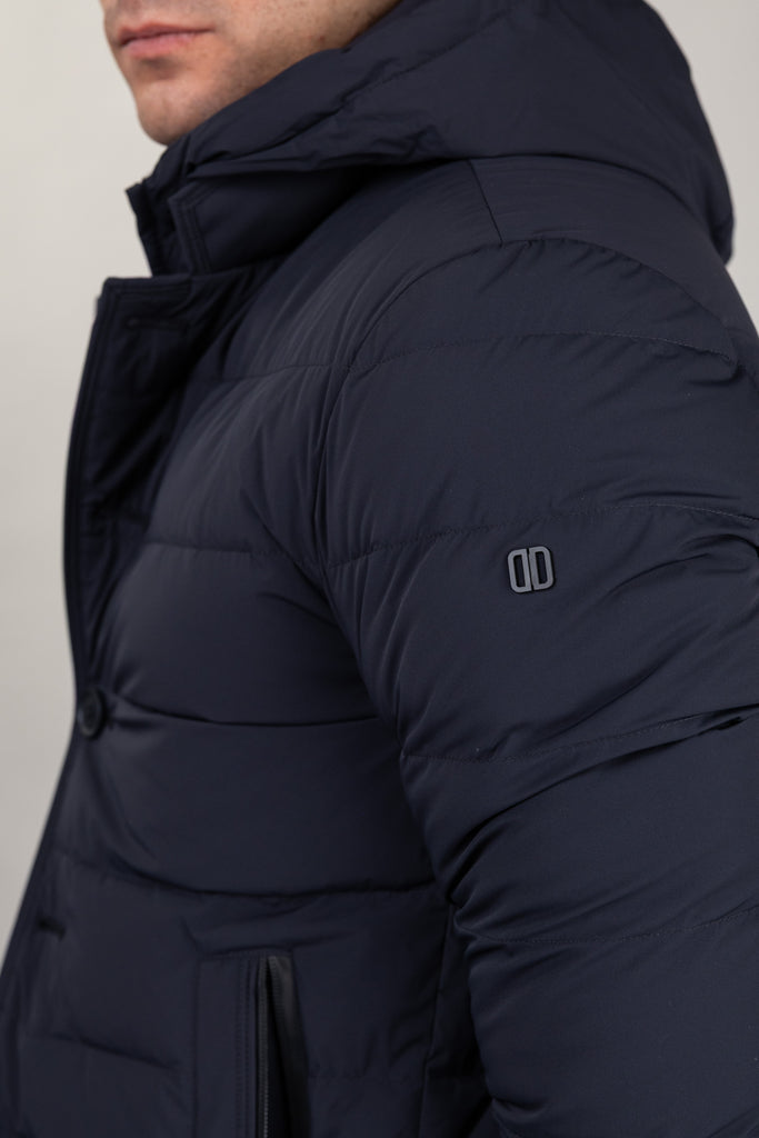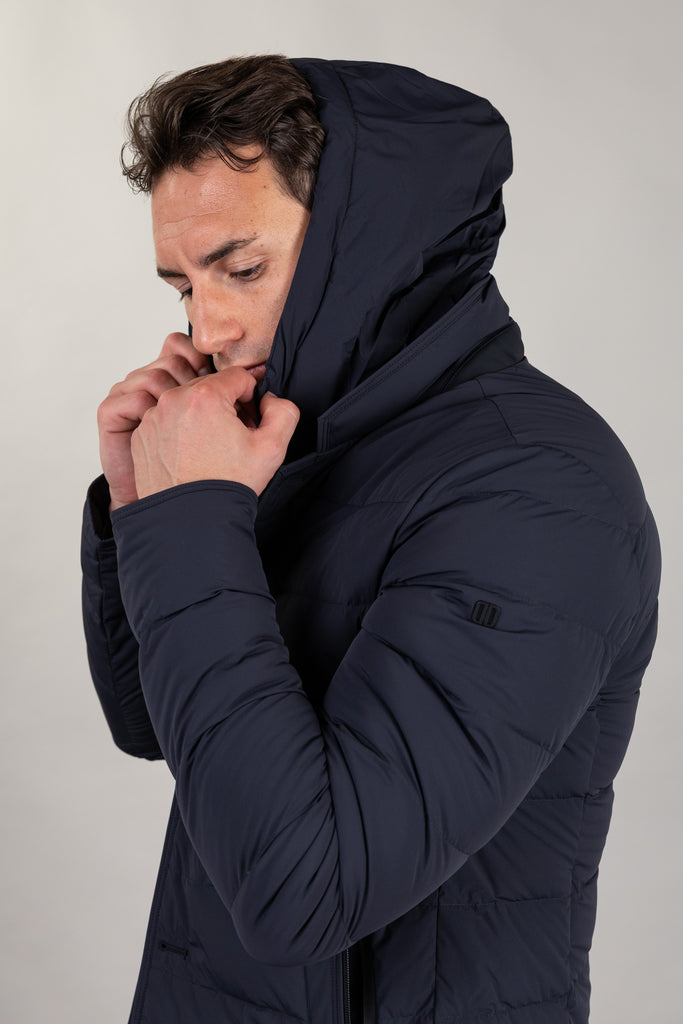 Daunenjacke aus superleichtem, bi-elastischem Funktionsgewebe mit abnehmbarem Latz, Kapuze und Reißverschluss. Stehkragen mit schwarzem Neoprendetail und Logoprägung, Knopfverschluss vorne und seitliche Leistentaschen mit wasserabweisenden Reißverschlüssen. Innen befinden sich Multifunktionstaschen mit reflektierenden Details.