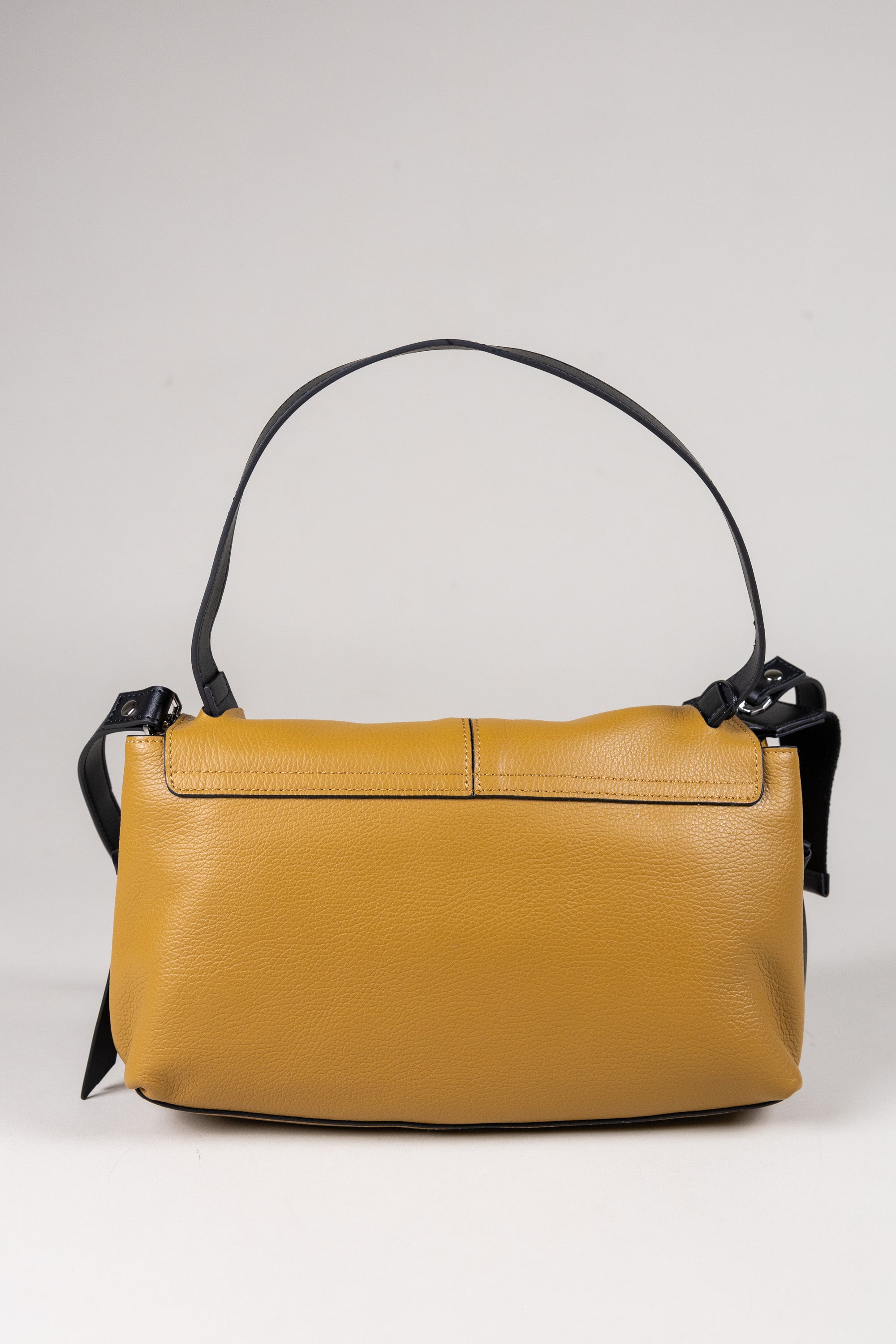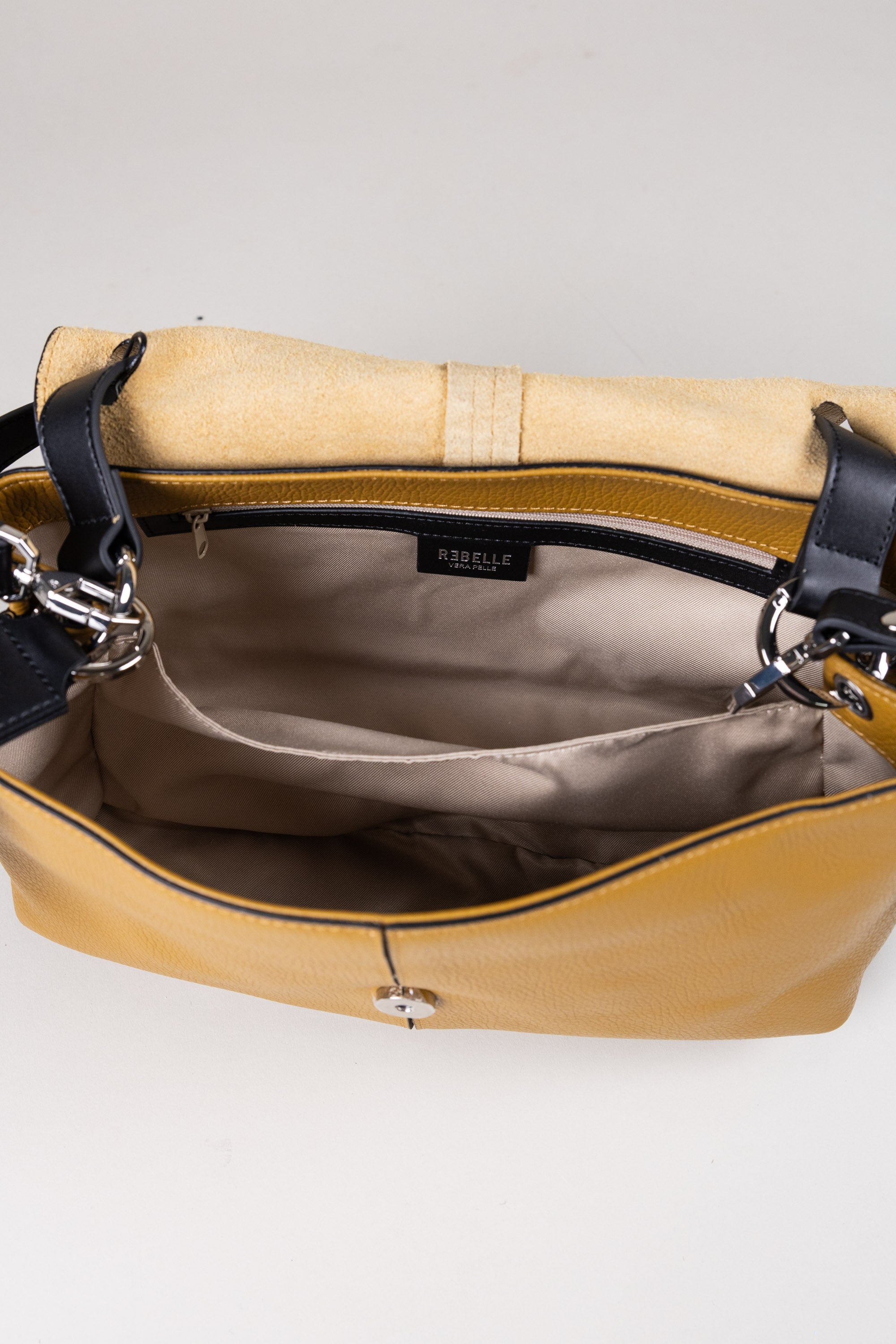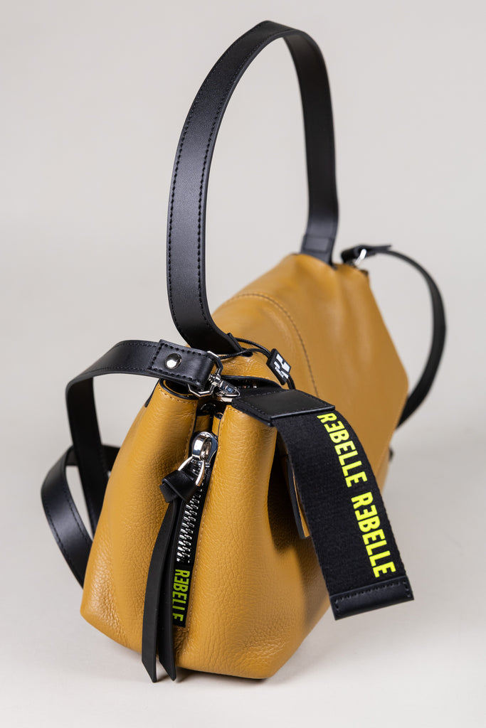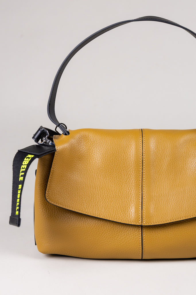 HYLA, the new must-have from the BASIC collection. This leather satchel bag flawlessly combines practicality and design. Comfortable, practical, and always on trend, HYLA offers you the best: dual carry: carry it elegantly over your shoulder or transform it into a comfortable crossbody bag thanks to the detachable, adjustable shoulder strap; maximum organization: the lined interior is divided into two large compartments and pockets, keeping everything organized; iconic detail: the look is completed by the detachable keychain charm with neon Rebelle logo, for a touch of unmistakable character. Choose HYLA for dynamic, everyday elegance.