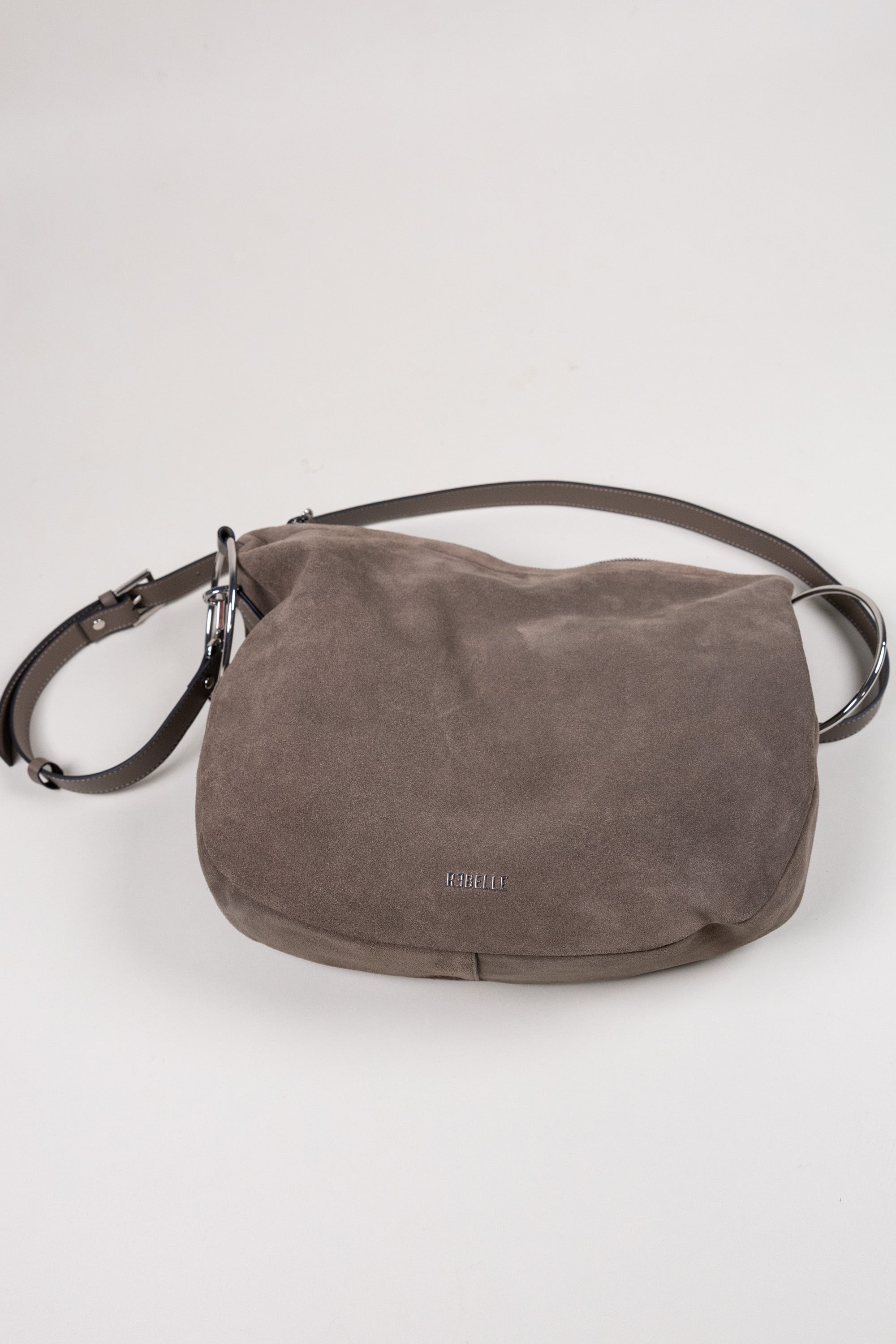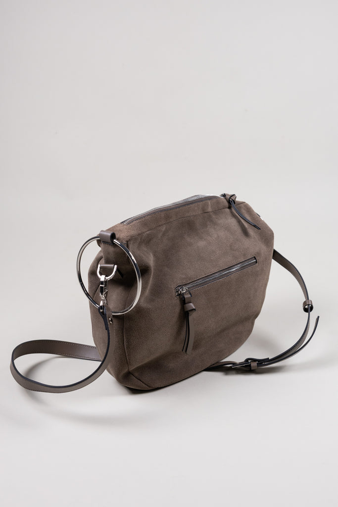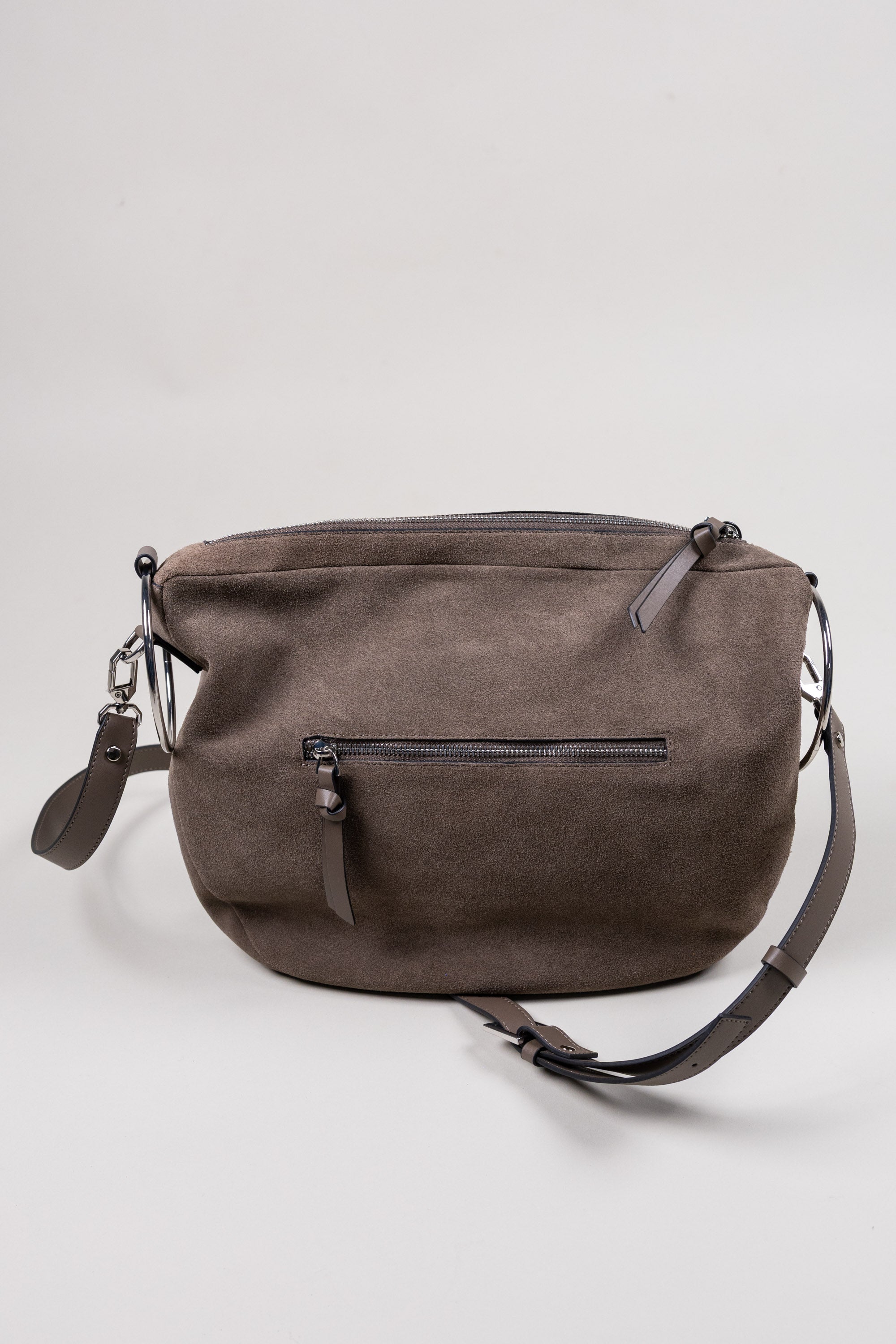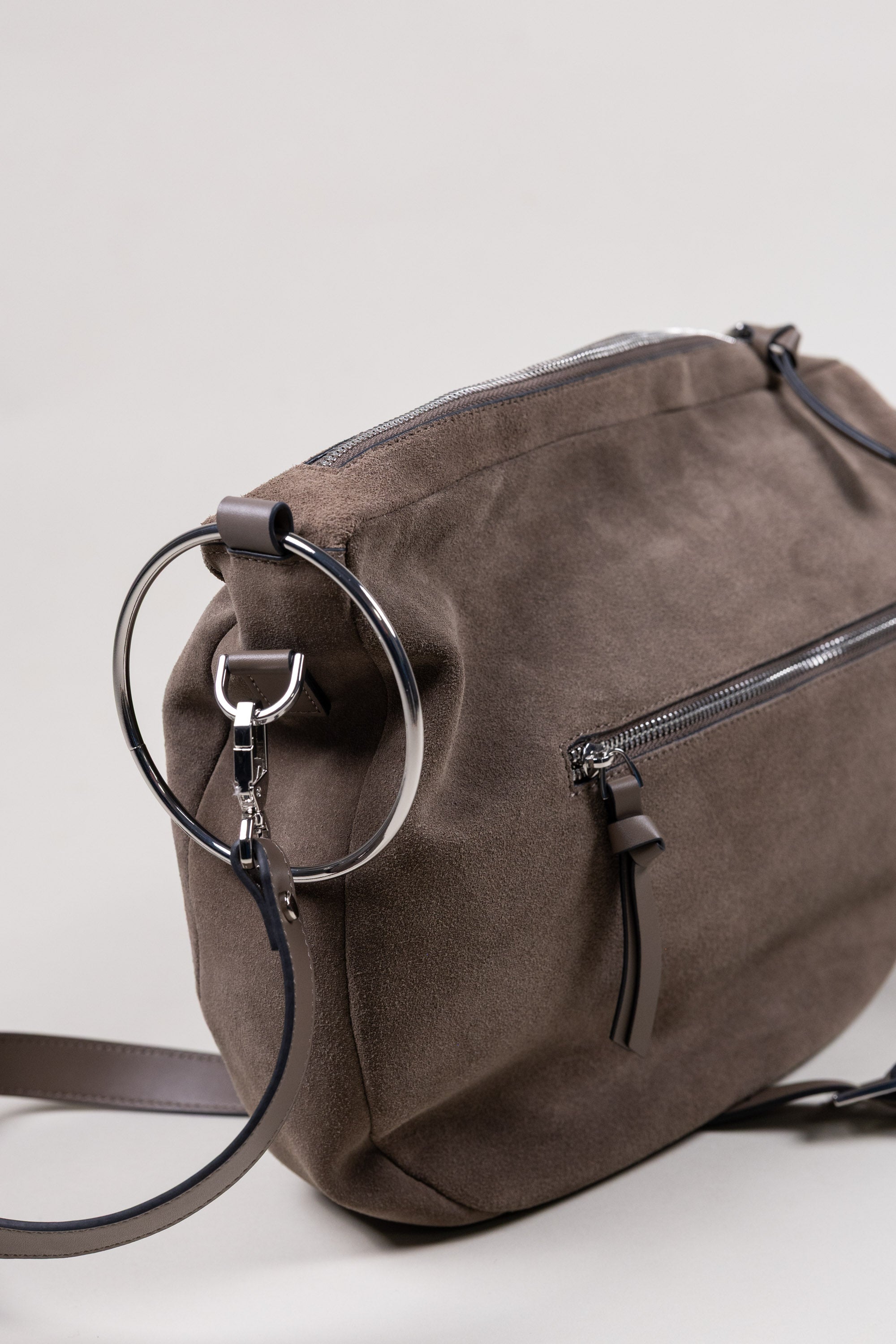 KITE CAMOSCIO, part of the CHARMED SUEDE LINE, is the perfect ally for women who want to combine versatile volume, luxurious softness, and a striking design. KITE CAMOSCIO offers the best: the sinuous silhouette and genuine suede give it a generous volume to comfortably carry daily essentials with casual style; the distinctive handles, made of large metal rings, define a modern, bold, and instantly recognizable look; the spacious interior and central closure ensure organization and practicality. Perfect for nonchalantly elevating day and evening outfits thanks to its texture and unstructured elegance.
