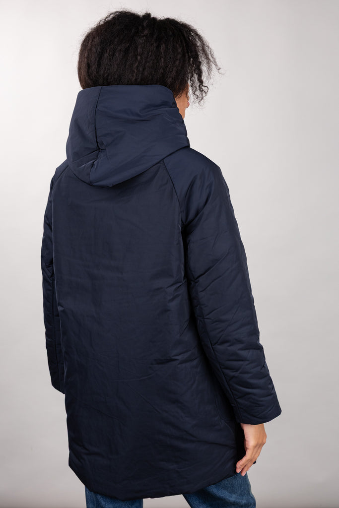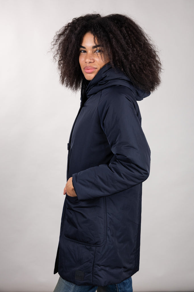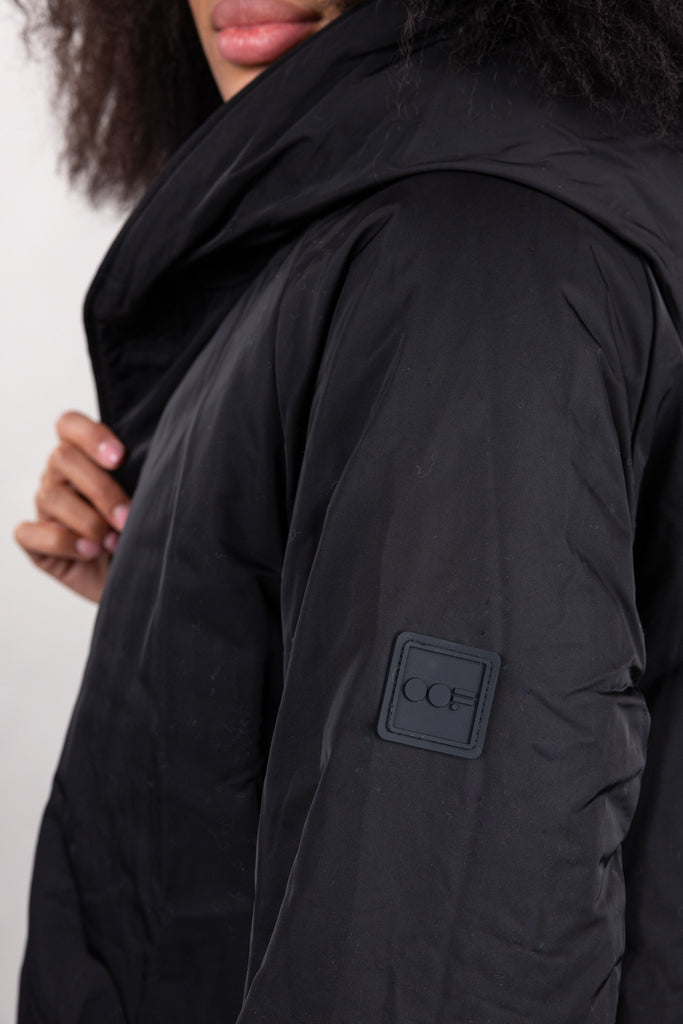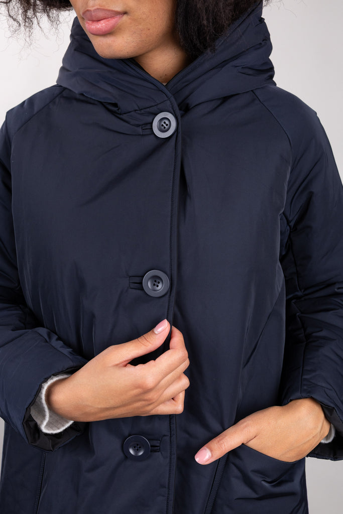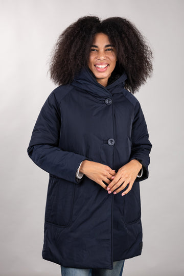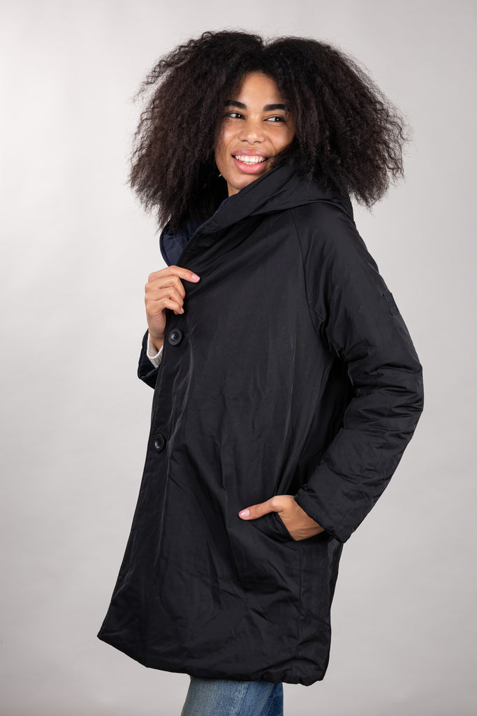 This short, reversible jacket with a regular fit is made of water-repellent memory nylon for protection and comfort in any urban environment. The streamlined design is enhanced by a shawl collar with hood and raglan sleeves, ensuring freedom of movement and a dynamic fit. Practical and versatile, it features patch pockets on the outside and inset side pockets on the inside.