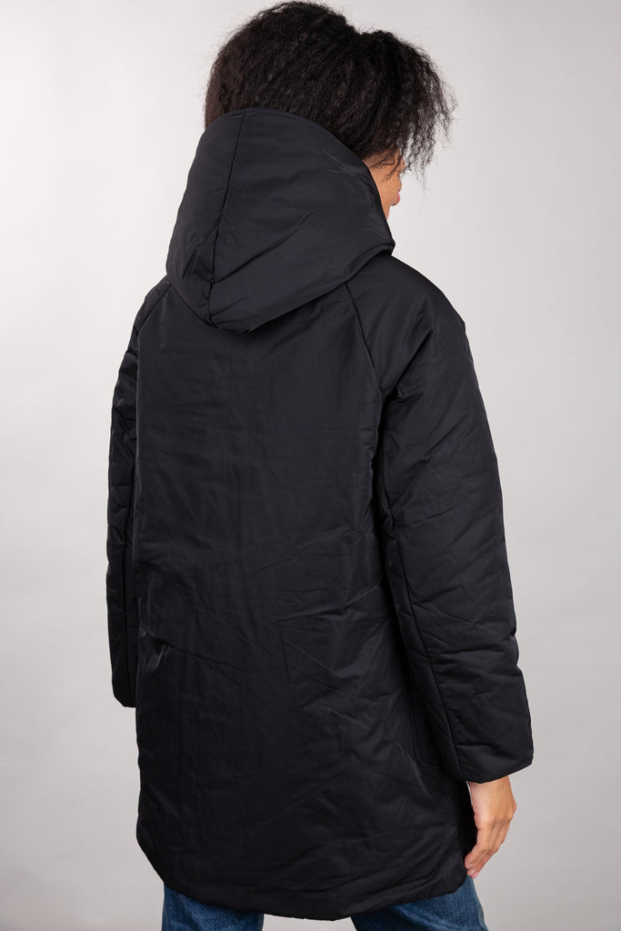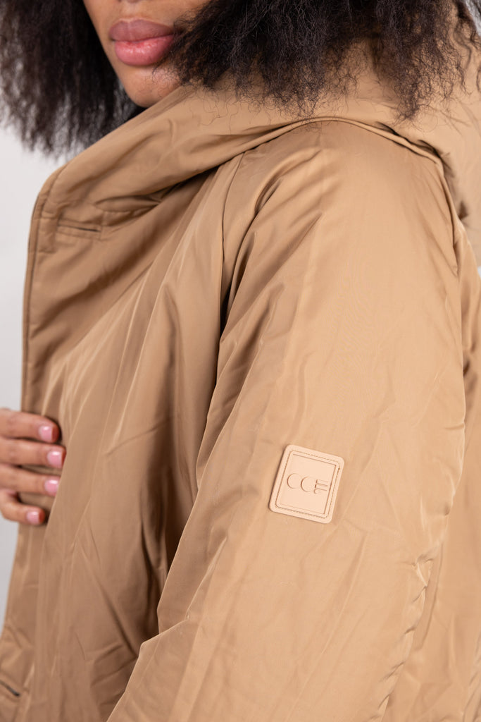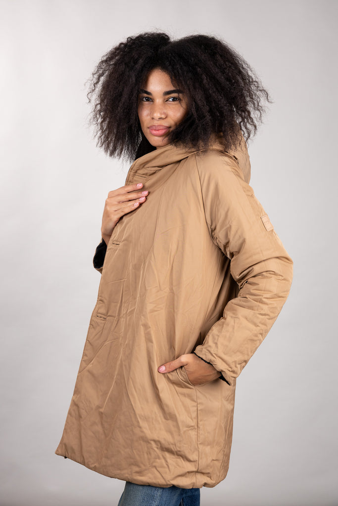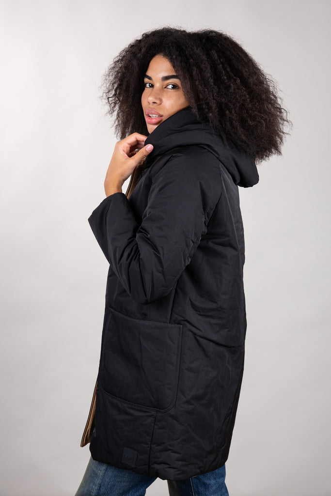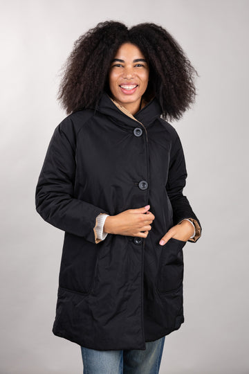 This short, reversible jacket with a regular fit is made of water-repellent memory nylon for protection and comfort in any urban environment. The streamlined design is enhanced by a shawl collar with hood and raglan sleeves, ensuring freedom of movement and a dynamic fit. Practical and versatile, it features patch pockets on the outside and inset side pockets on the inside.