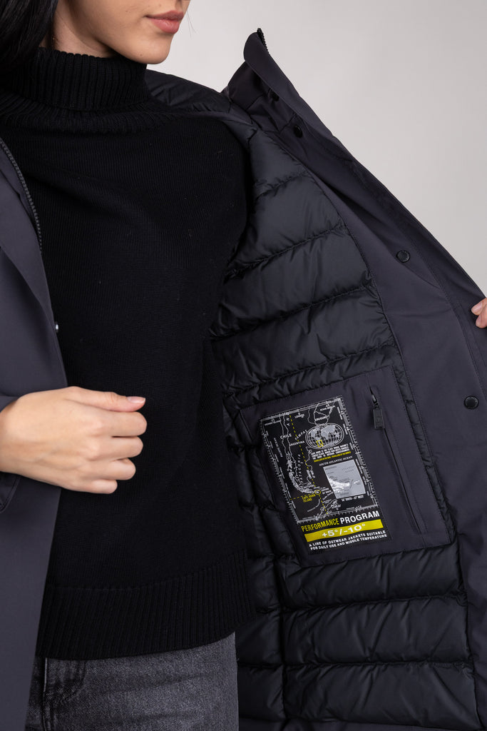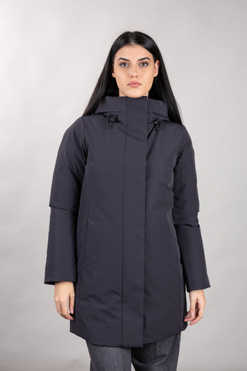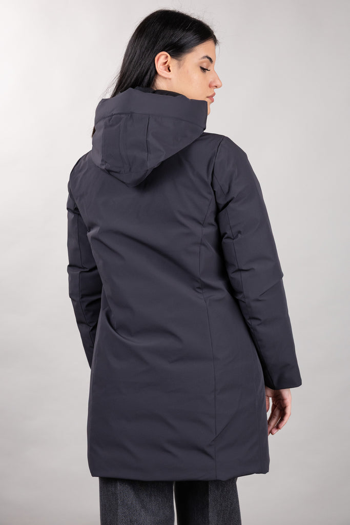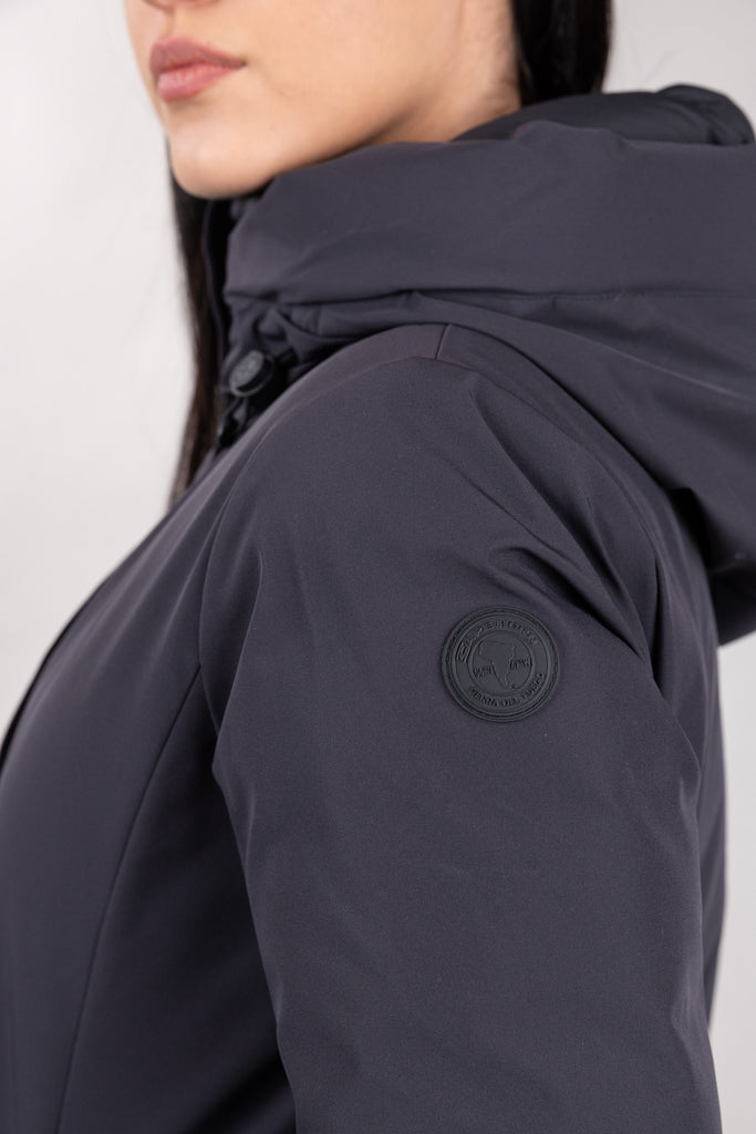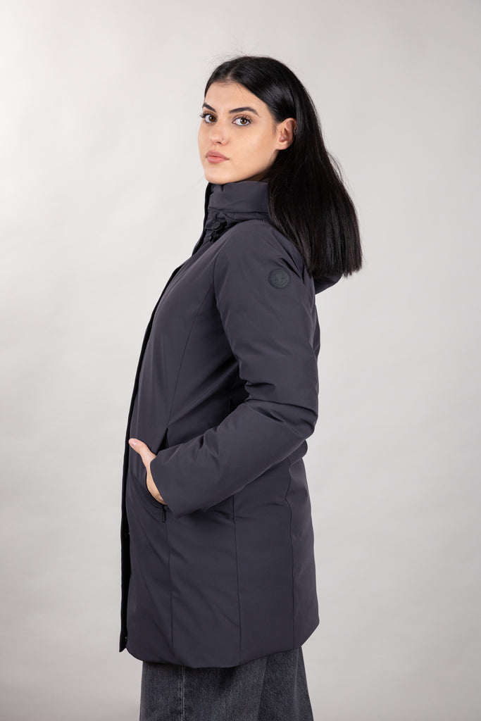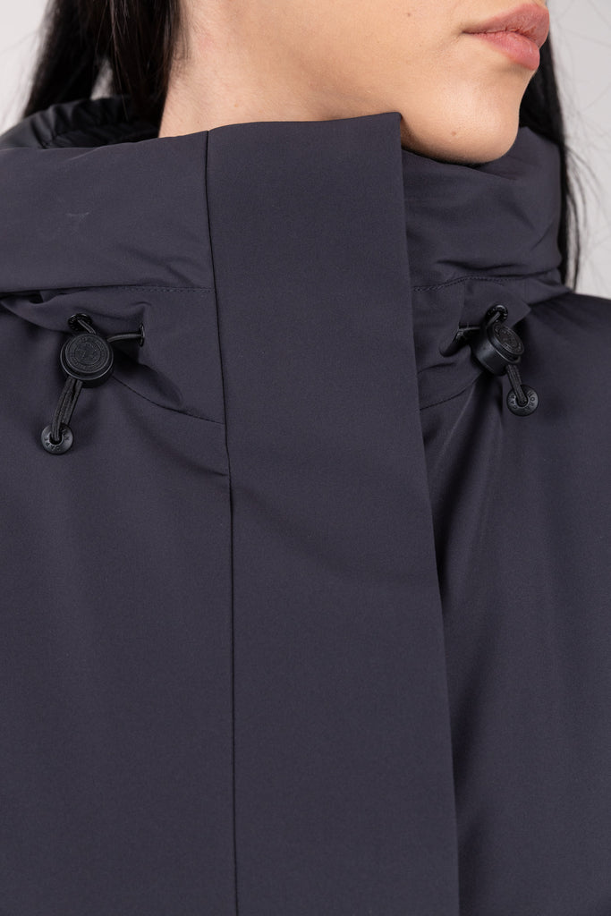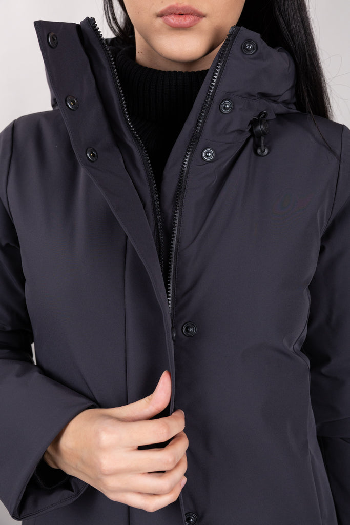 Giacca lunga da donna realizzata in tessuto stretch, ideale per affrontare temperature rigide fino a -10°C. La chiusura frontale è protetta da una pattina con bottoni, sotto cui si trova una zip a doppio cursore dal design discreto. Le tasche laterali sono integrate con zip invisibili, mentre il cappuccio fisso con coulisse permette di adattare la vestibilità in base alle condizioni. Due tasche interne portadocumenti completano un capo progettato per chi cerca praticità, protezione e stile sobrio.