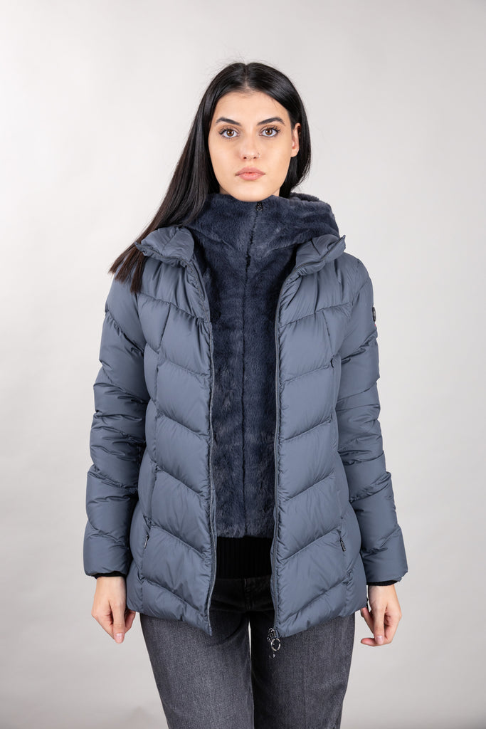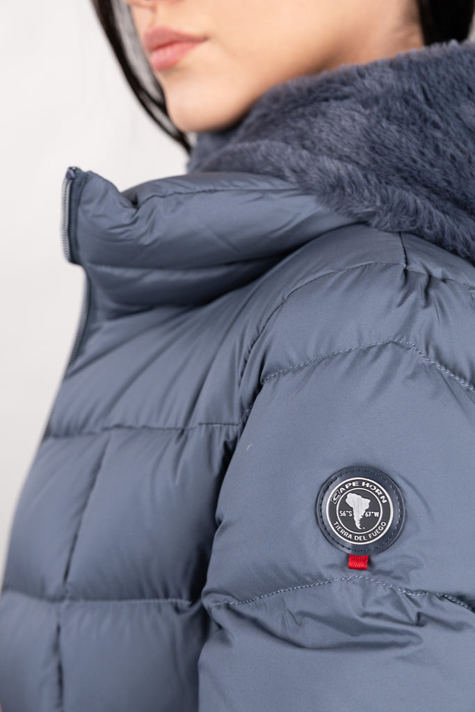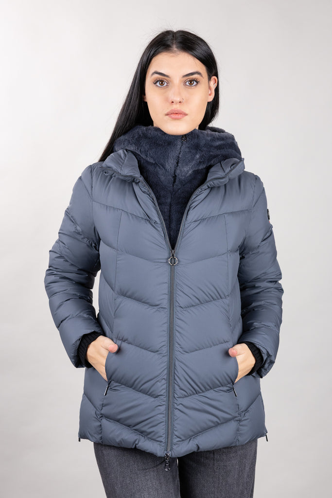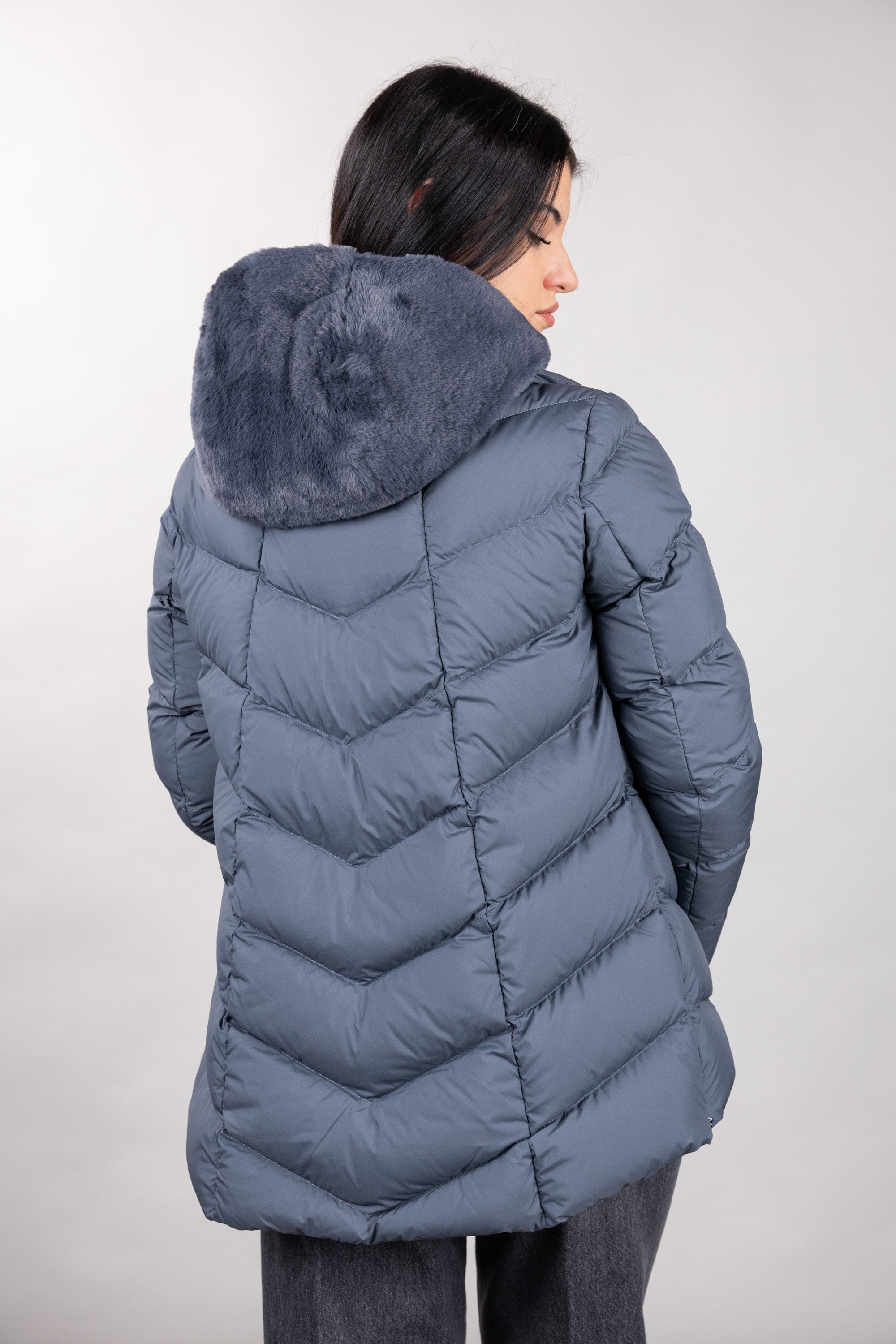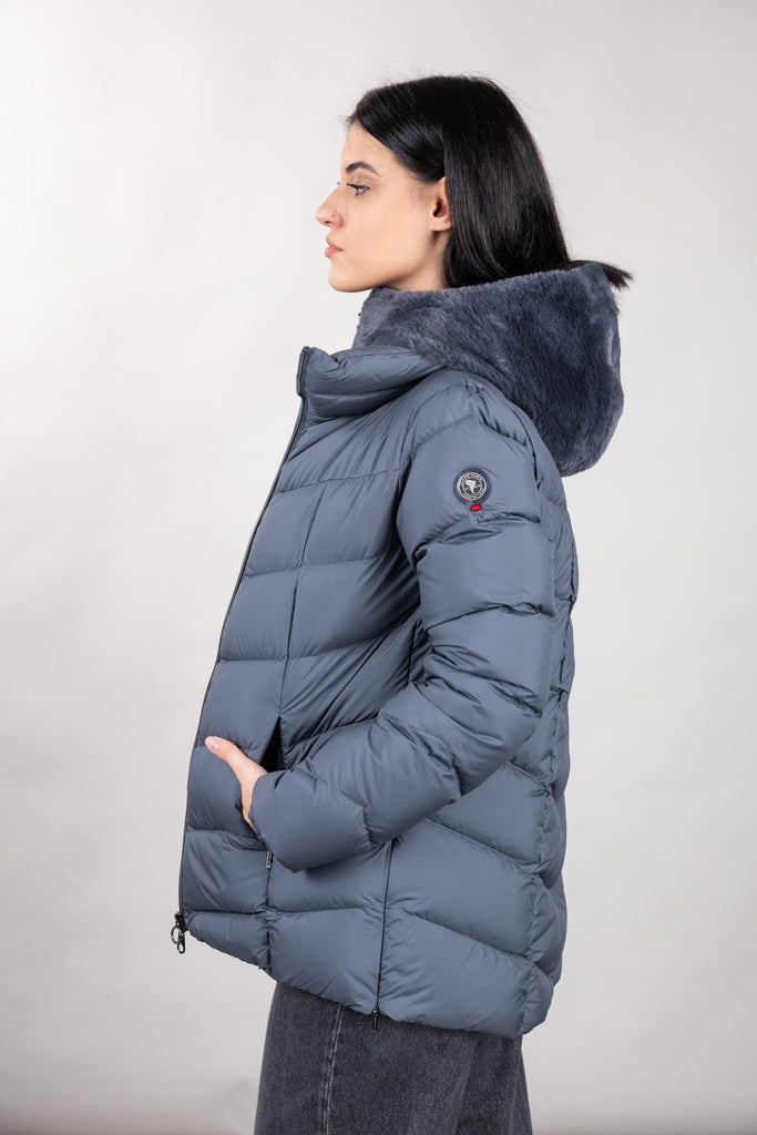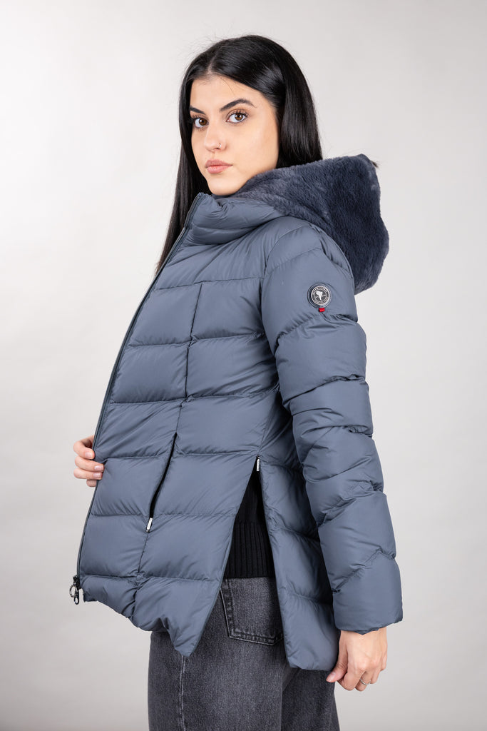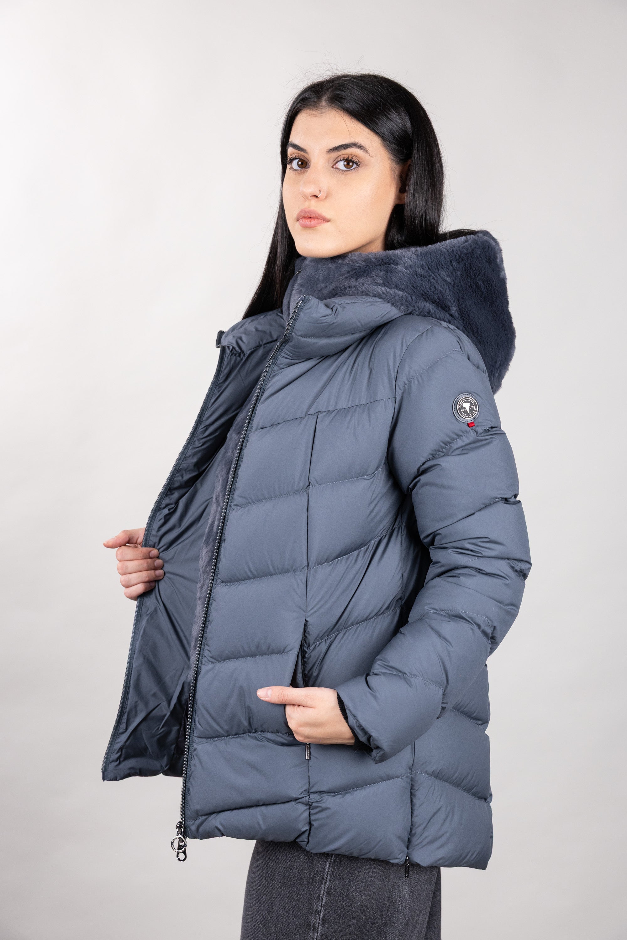 Piumino da donna trapuntato, caratterizzato da un elegante modello a campana e una vestibilità regolare sulle spalle. Imbottito con piuma naturale certificata, offre un calore eccezionale senza rinunciare alla leggerezza. Il cappuccio e la pettorina in ecopelliccia sono removibili, consentendo di personalizzare il look secondo le occasioni e le preferenze. La zip centrale a spirale con doppio cursore è dotata di puller personalizzati, aggiungendo un tocco di stile e funzionalità. Le zip invisibili laterali garantiscono una maggiore libertà di movimento, rendendo questo piumino pratico e comodo. All'interno, le due tasche portadocumenti offrono spazio per i tuoi oggetti essenziali. Resistente al freddo fino a -10°, questo piumino è l'alleato ideale per affrontare l'inverno con classe e comfort.