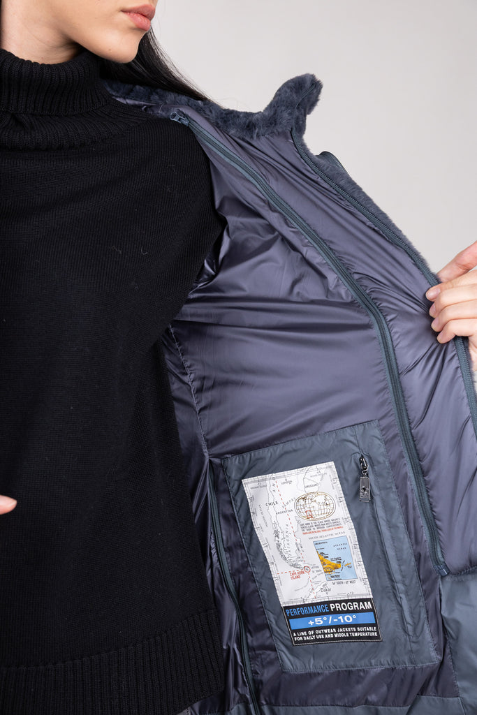 Tessuto esterno in 100% poliestere dall'aspetto opaco che conferisce al tessuto elevate caratteristiche di antispiumaggio, idrorepellenza e protezione dalle macchie. Fodera interna in 100% poliammide. Imbottitura in piuma naturale certificata JIS 90% fiocco, trattata e sanificata, filling power 800 cuin. Pelliccia ecologica.