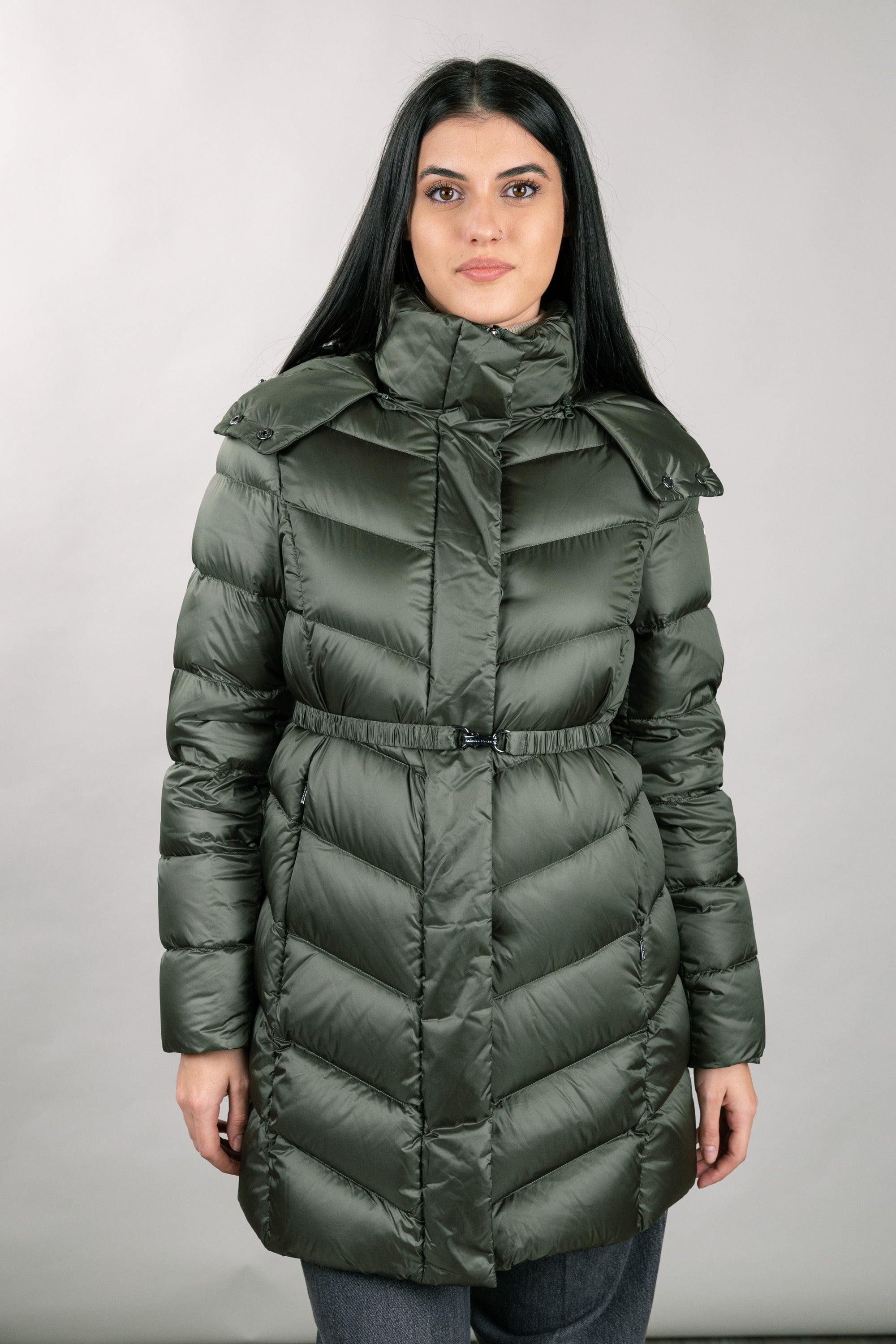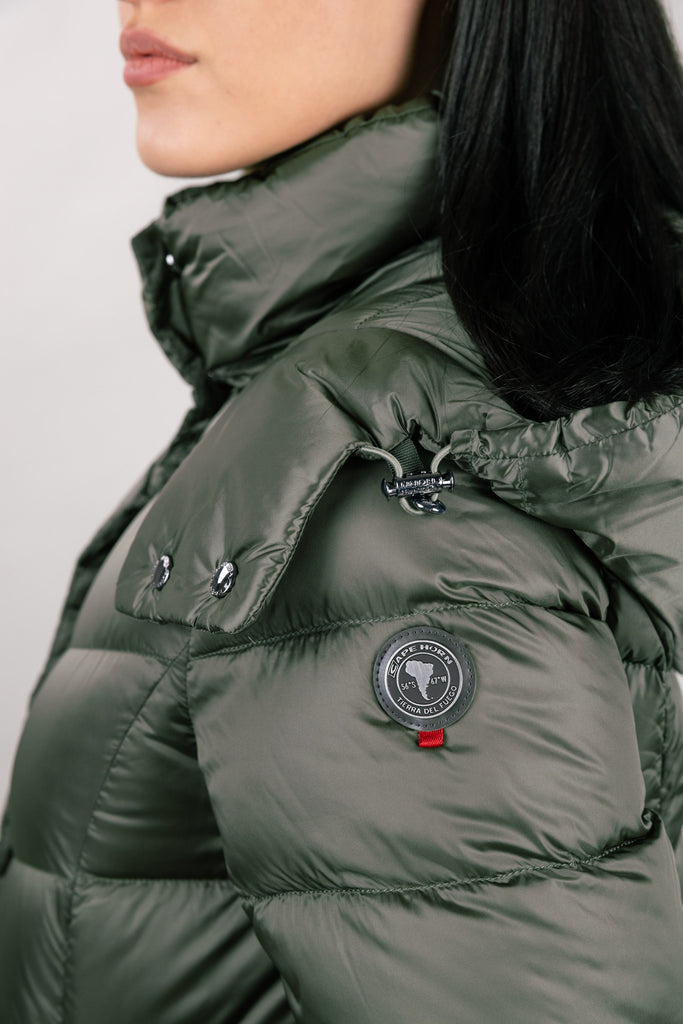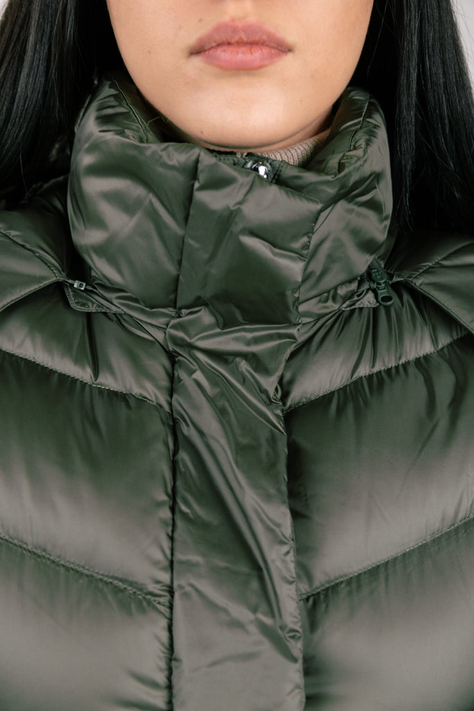 Piumino con chiusura sulla parte frontale con zip e bottone a pressione. Cappuccio rimovibile con chiusura a zip. Patch metallizzata logata sulla spalla sinistra. Regolabile tramite coulisse. Il prodotto funziona al suo meglio per temperature che oscillano tra i +5°C e i -10°C. Trama a spina di pesce. 2 tasche con chiusura a zip logata a livello dello stomaco Tessuto realizzato in nylon.