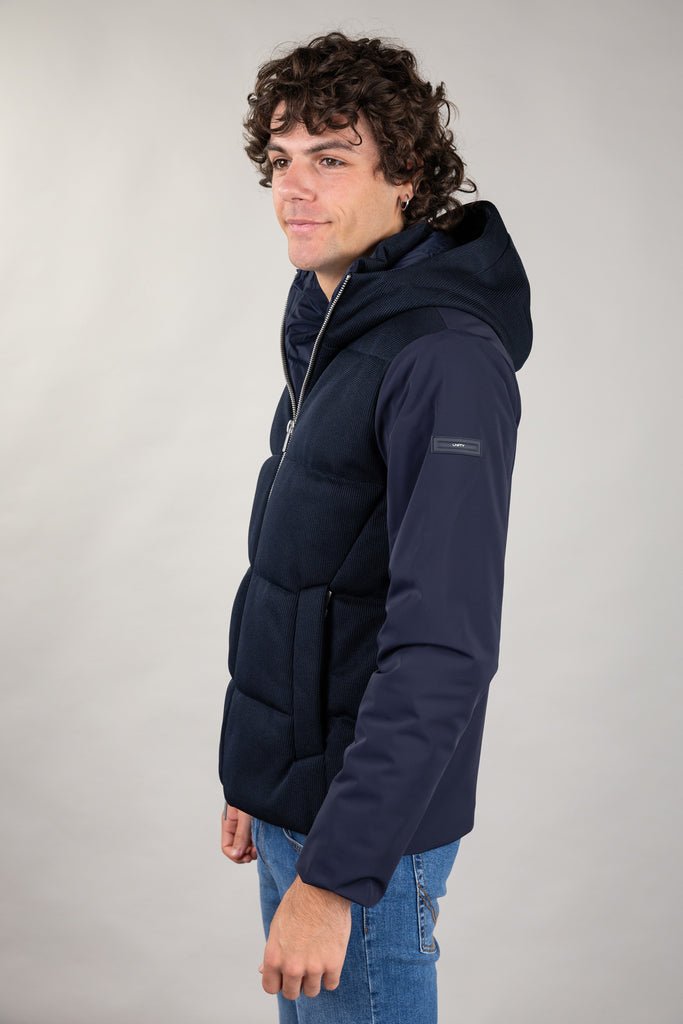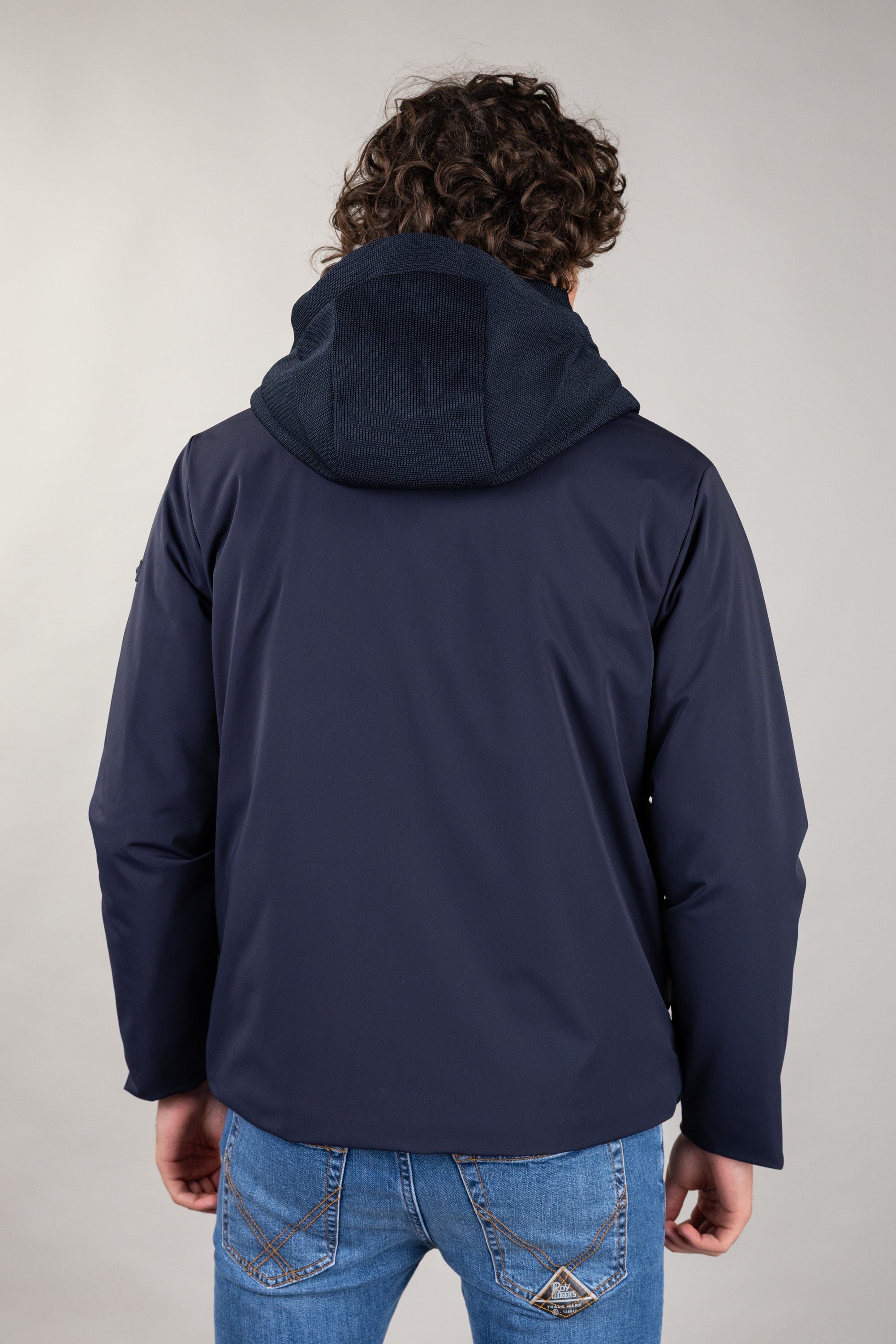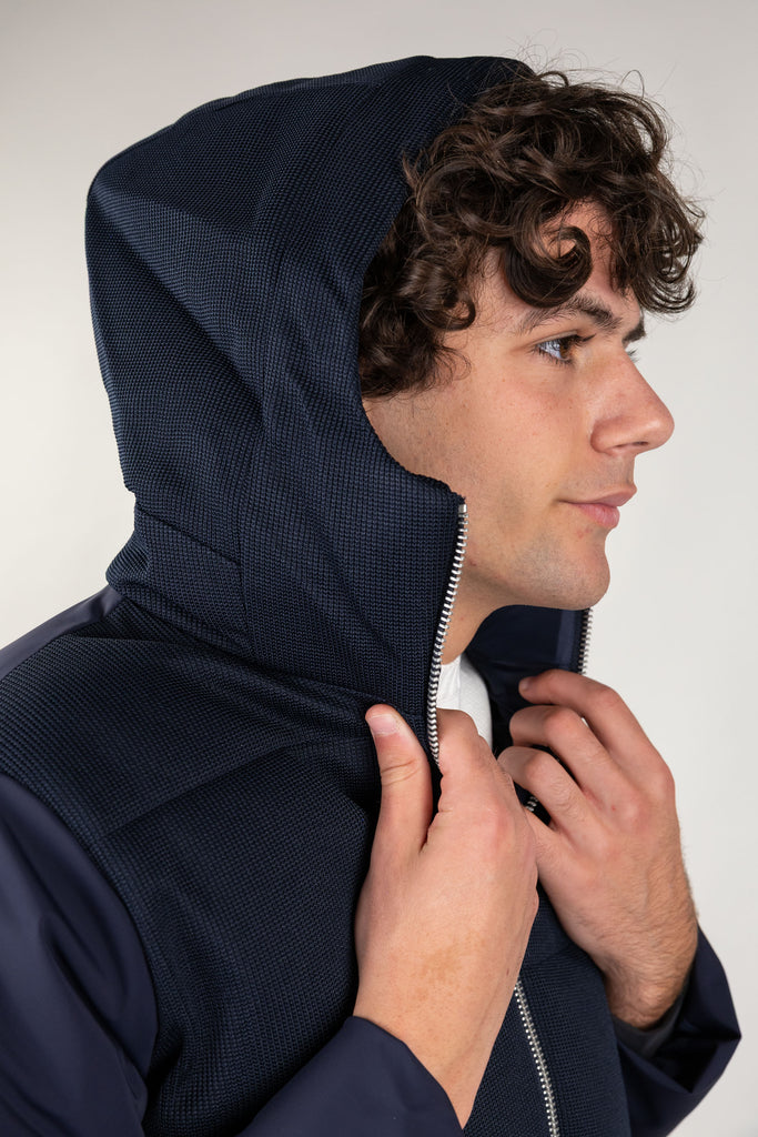 Giacca con cappuccio in doppio tessuto.