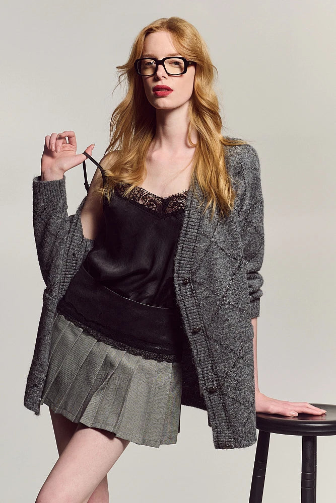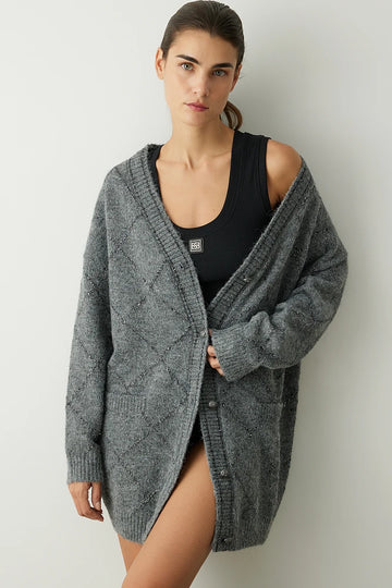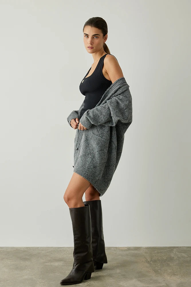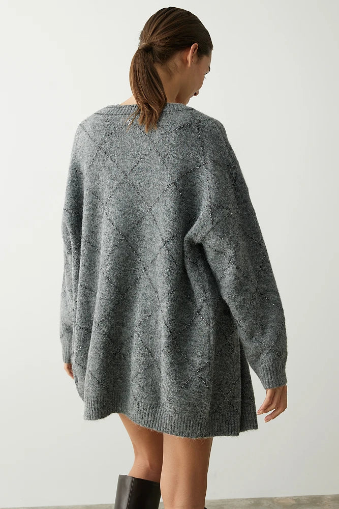 Cardigan lungo in maglia, con lurex e perline, tasche anteriori, chiusura frontale con bottoni, vestibilità ampia
