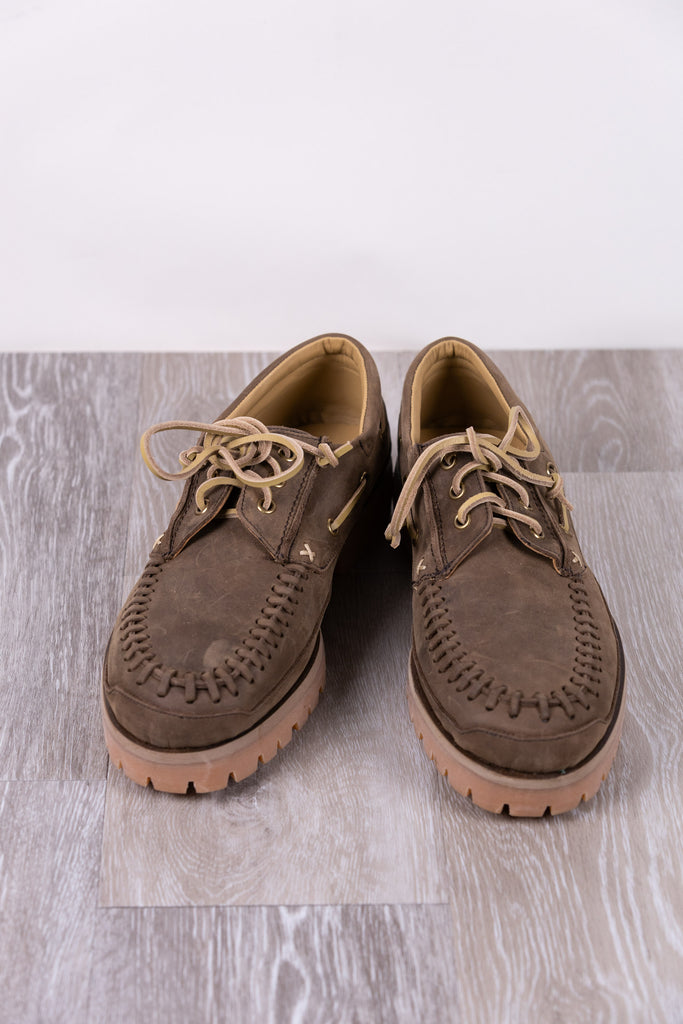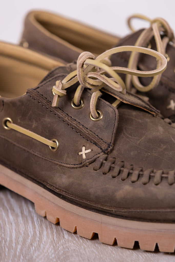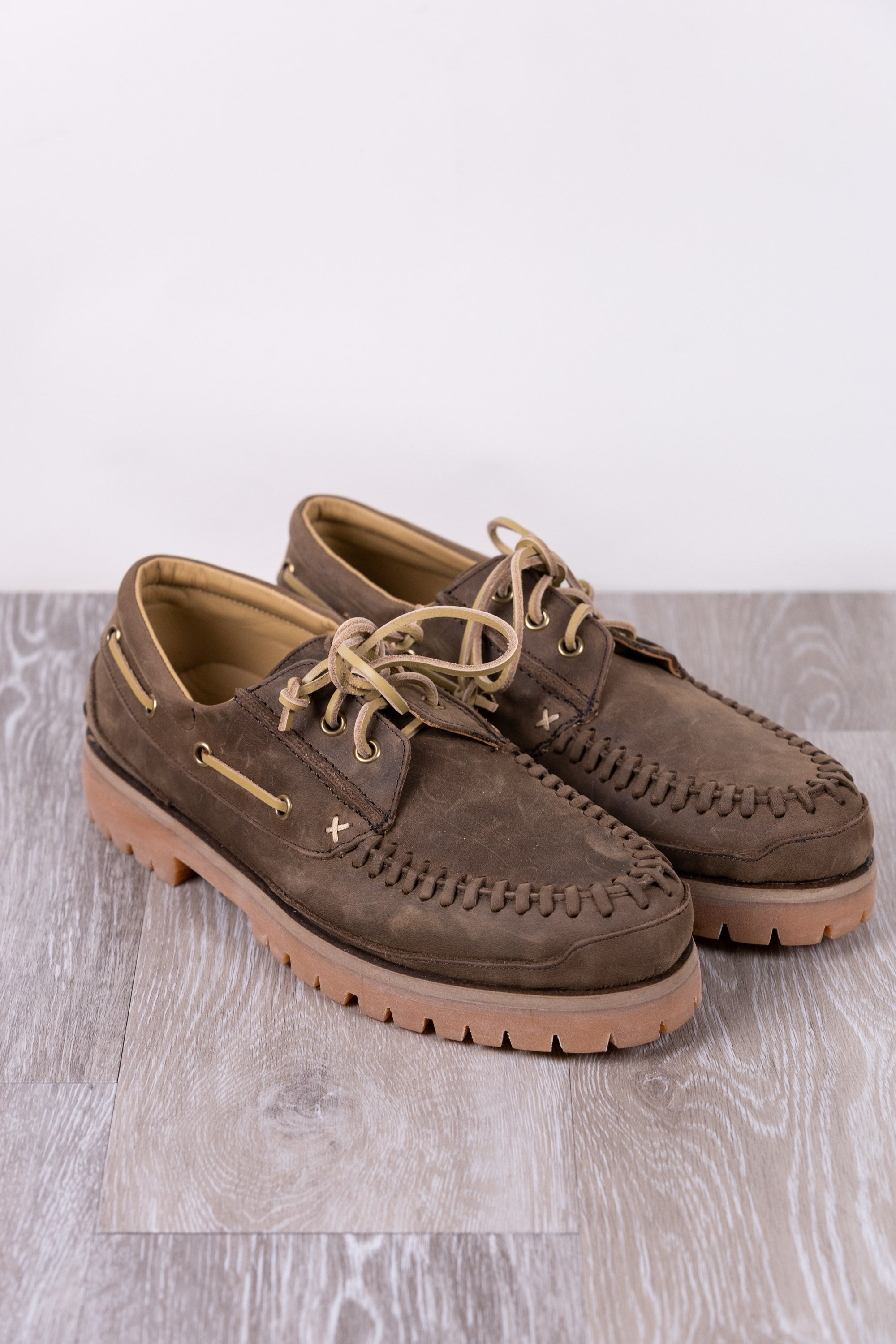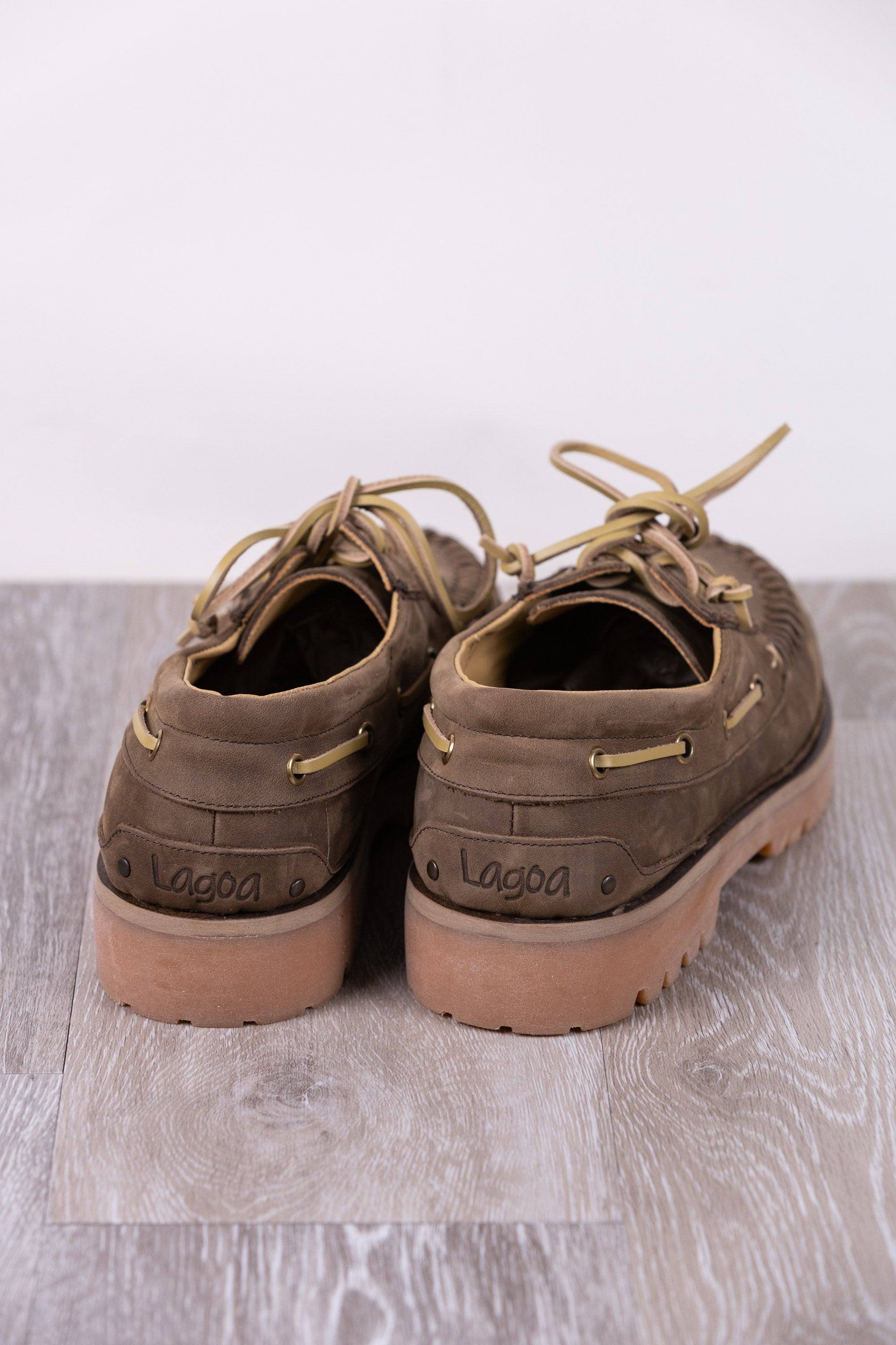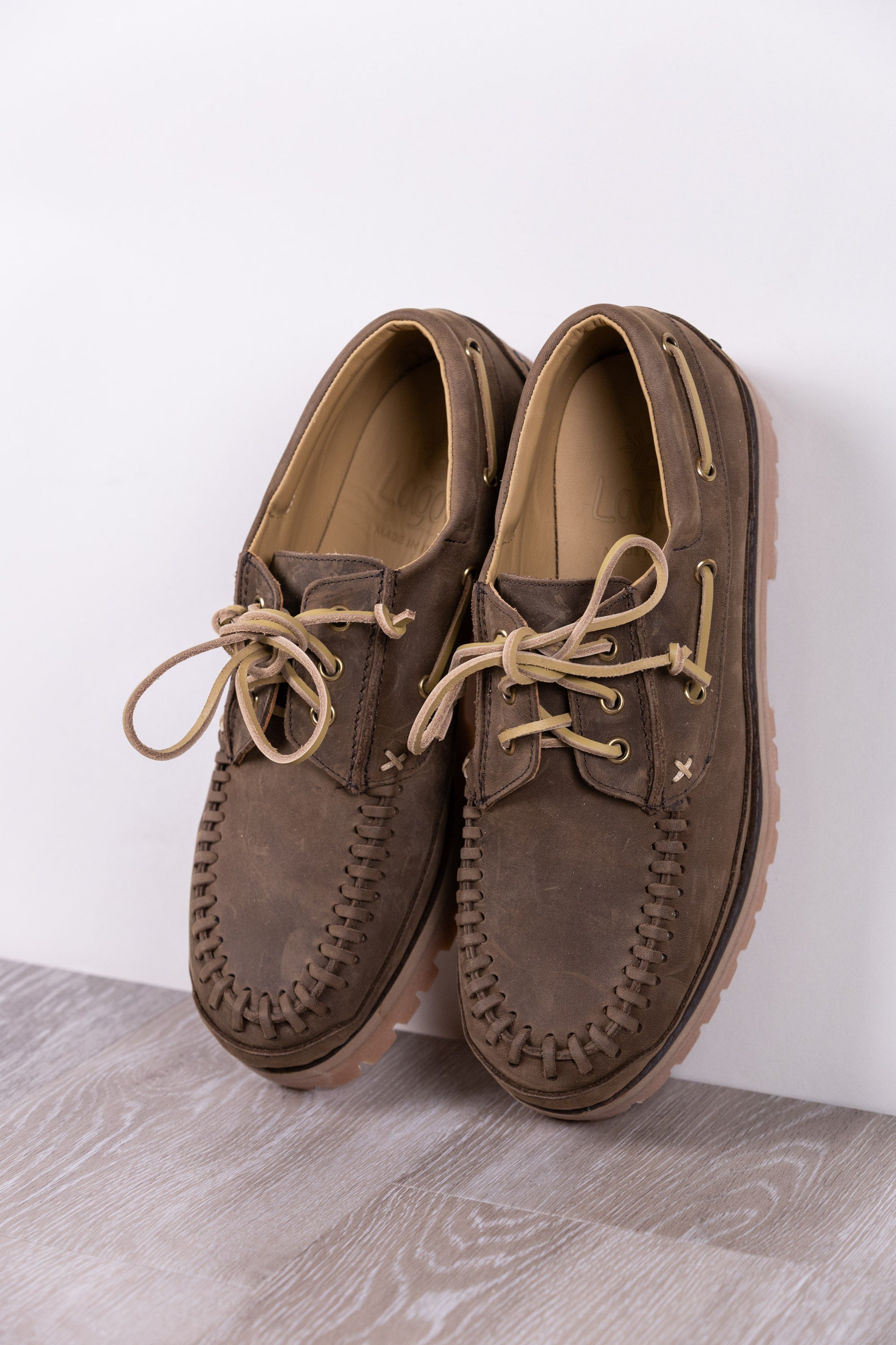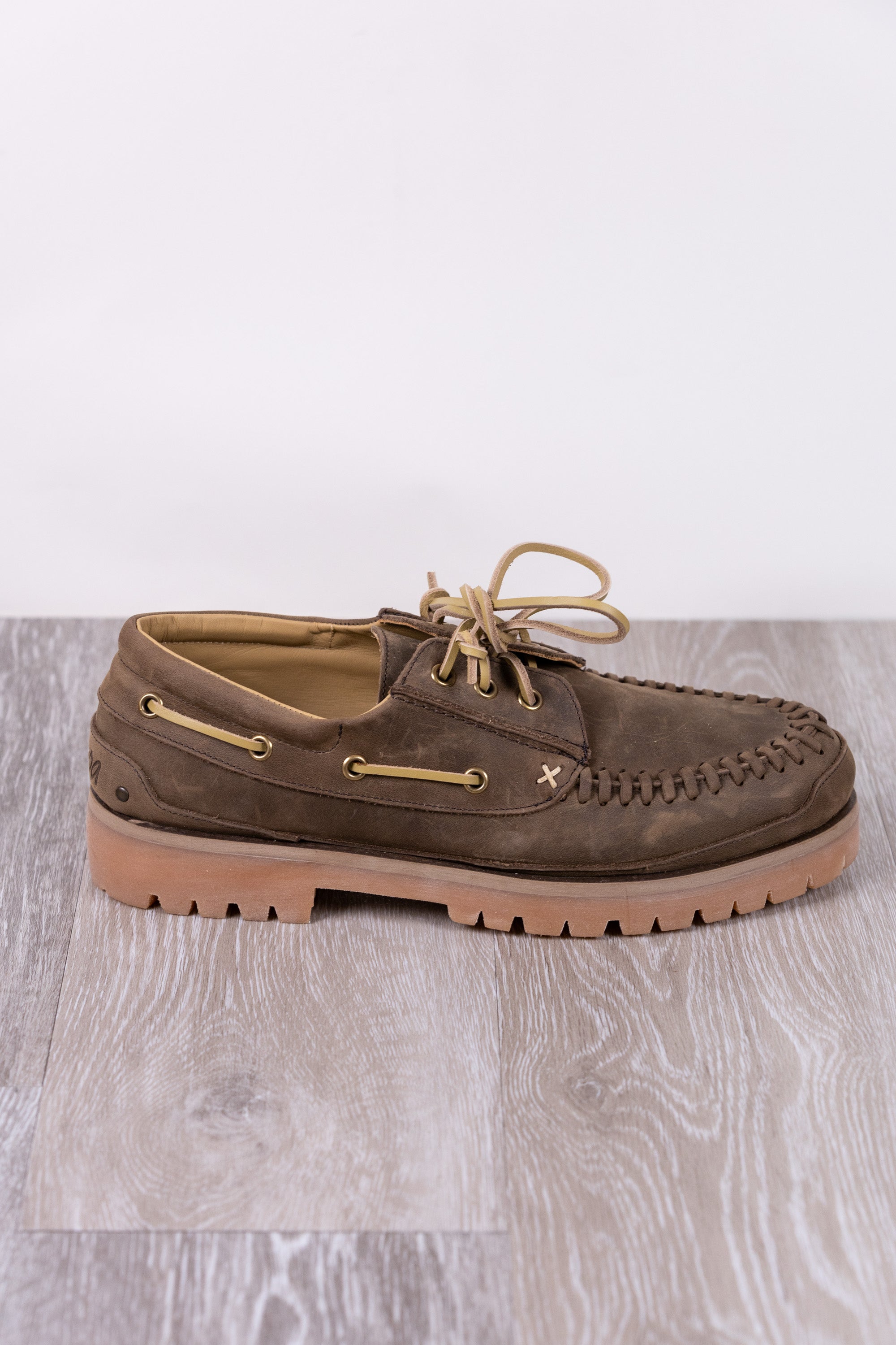 Shoe with forest-colored calfskin upper and calfskin lining. Leather laces with threading on the upper, rubber sole.