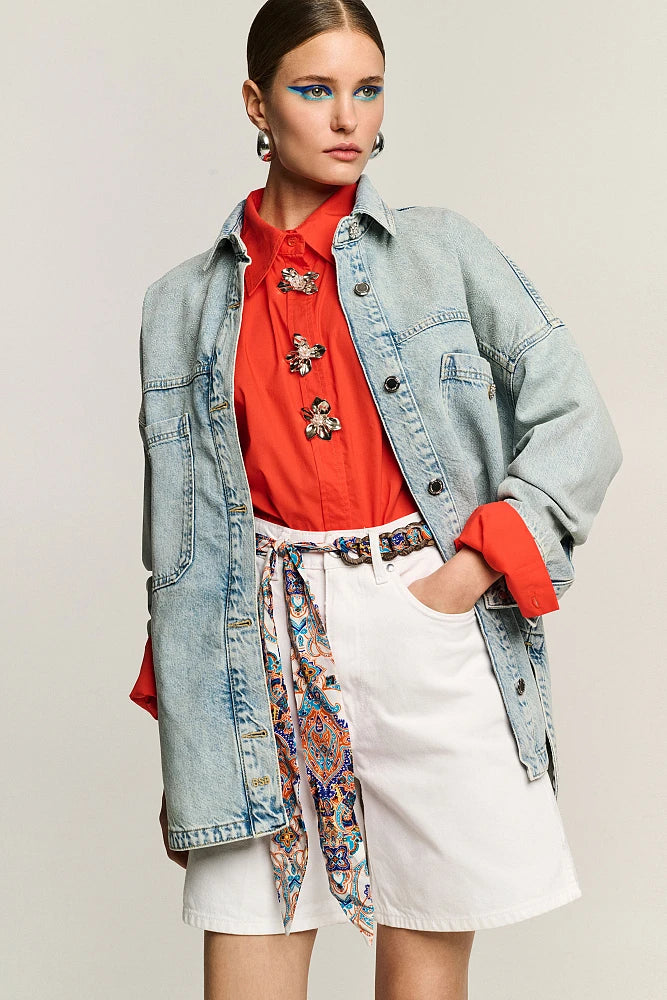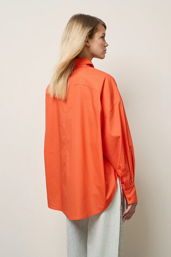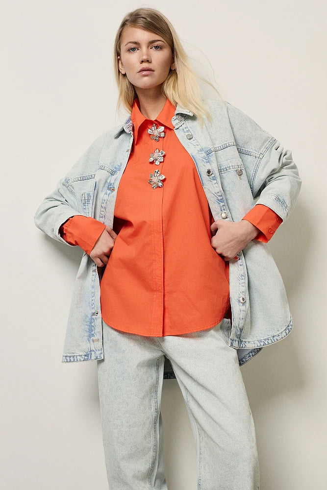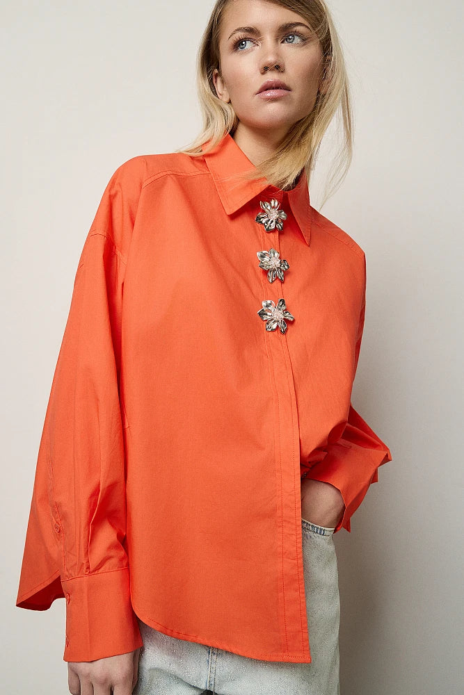 Camicia a maniche lunghe, con colletto, chiusura a gancio, con bottoni decorativi senza gioielli, in cotone, vestibilità regolare
