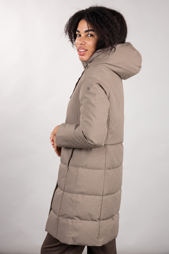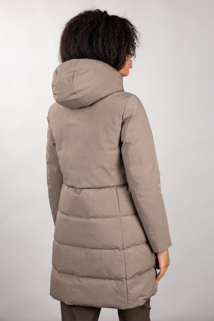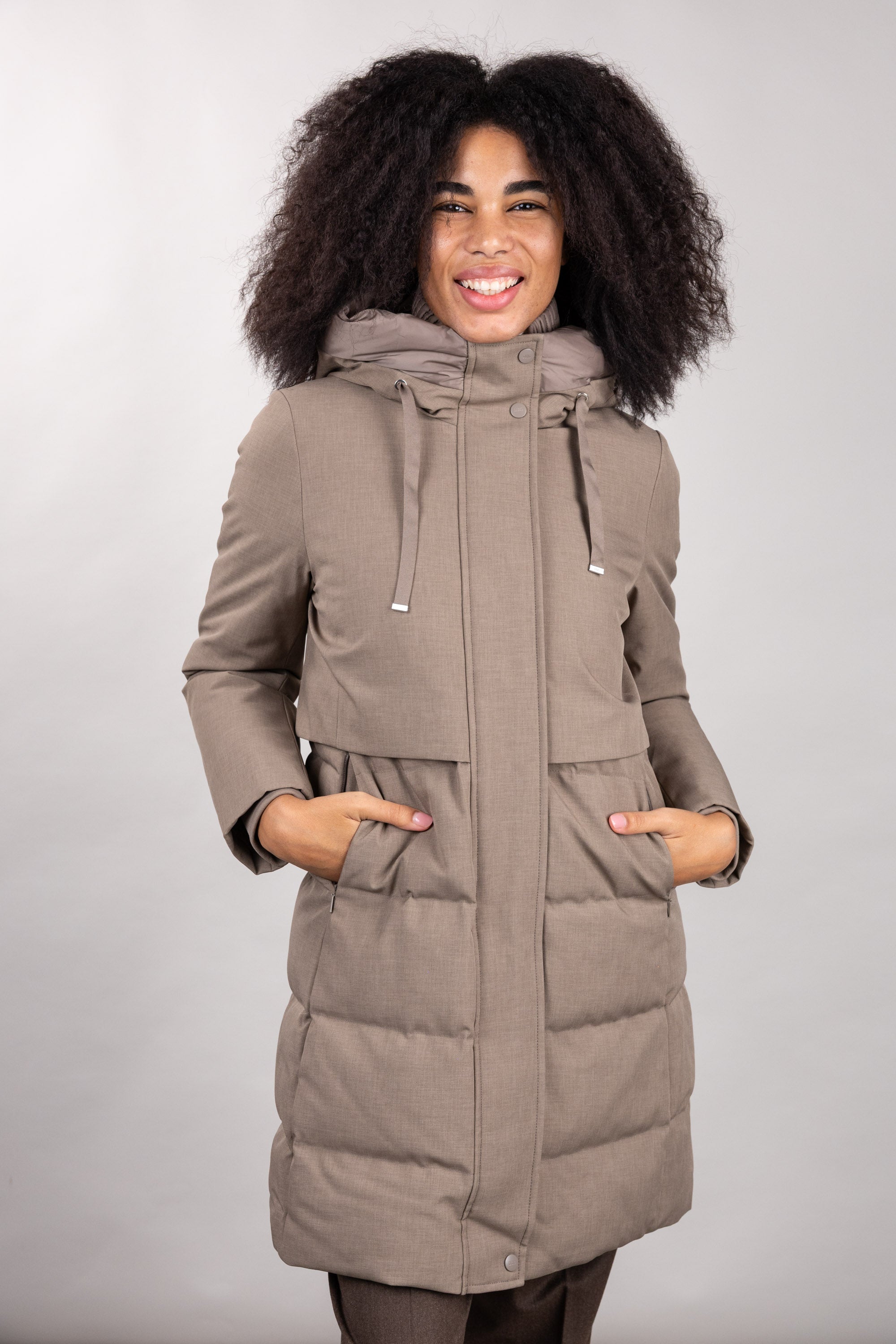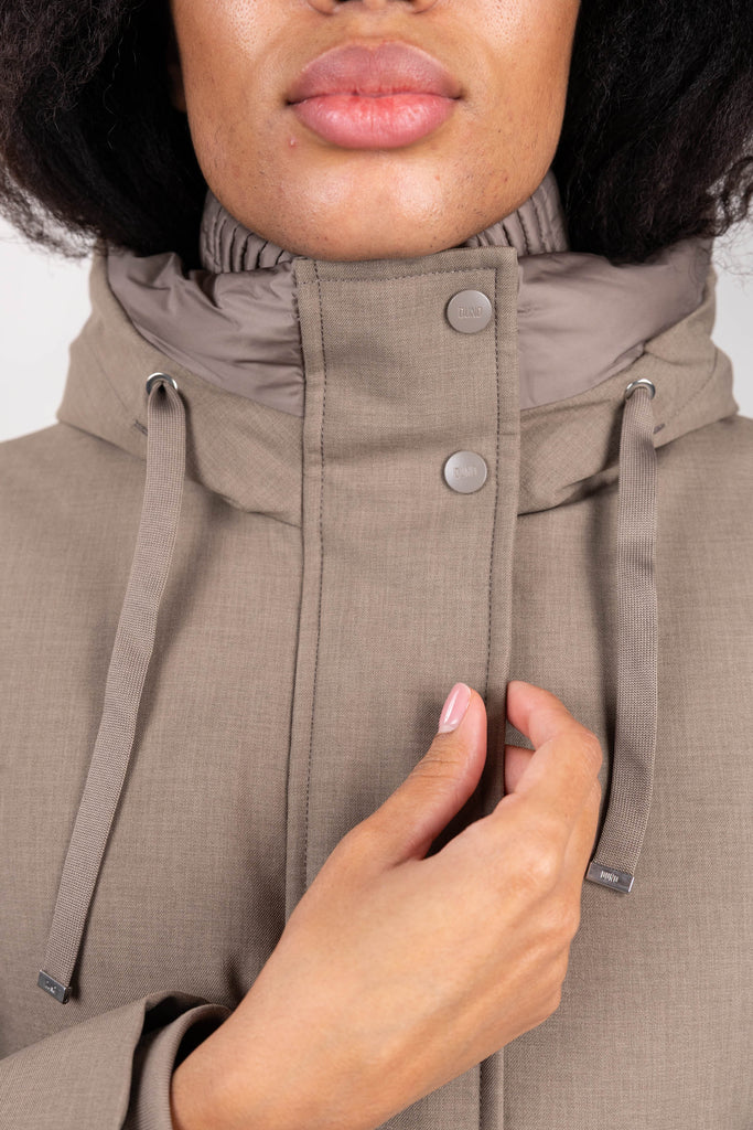 Piumino in tessuto tecnico effetto lana caratterizzato dall'abbinamento di tessuto trapuntato e liscio, da interno collo in tessuto tecnico trapuntato e cappuccio esterno. Doppia chiusura frontale con zip a doppio cursore con dettaglio tirazip e bottoni automatici nascosti. Tasche laterali con zip invisibile nascosta in un taglio orizzontale inserito nel disegno trapuntato e polsino interno in maglia tecnica.