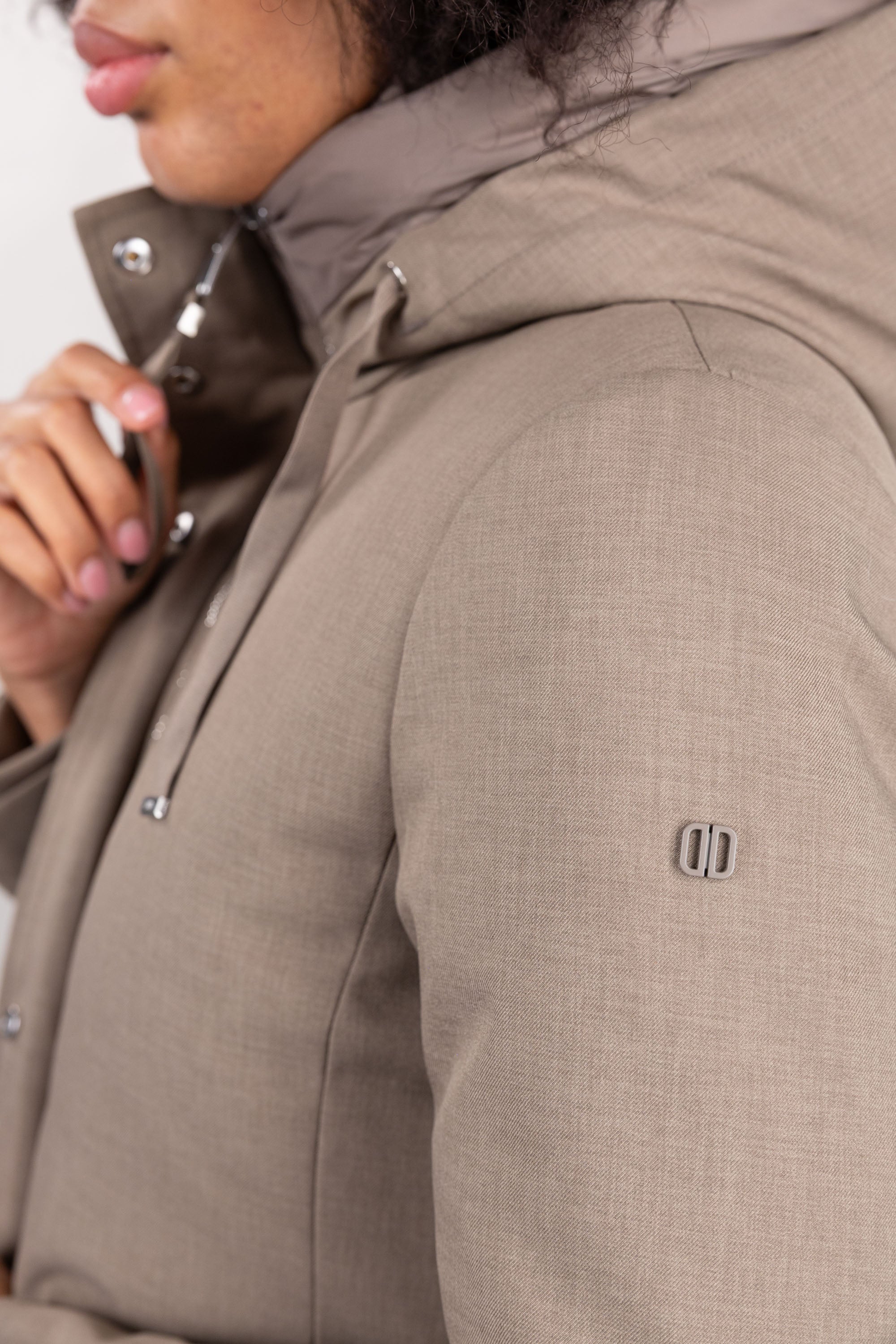 Tessuto tecnico effetto lana con struttura a canestro. La membrana sul retro del tessuto previene la formazione di pieghe.